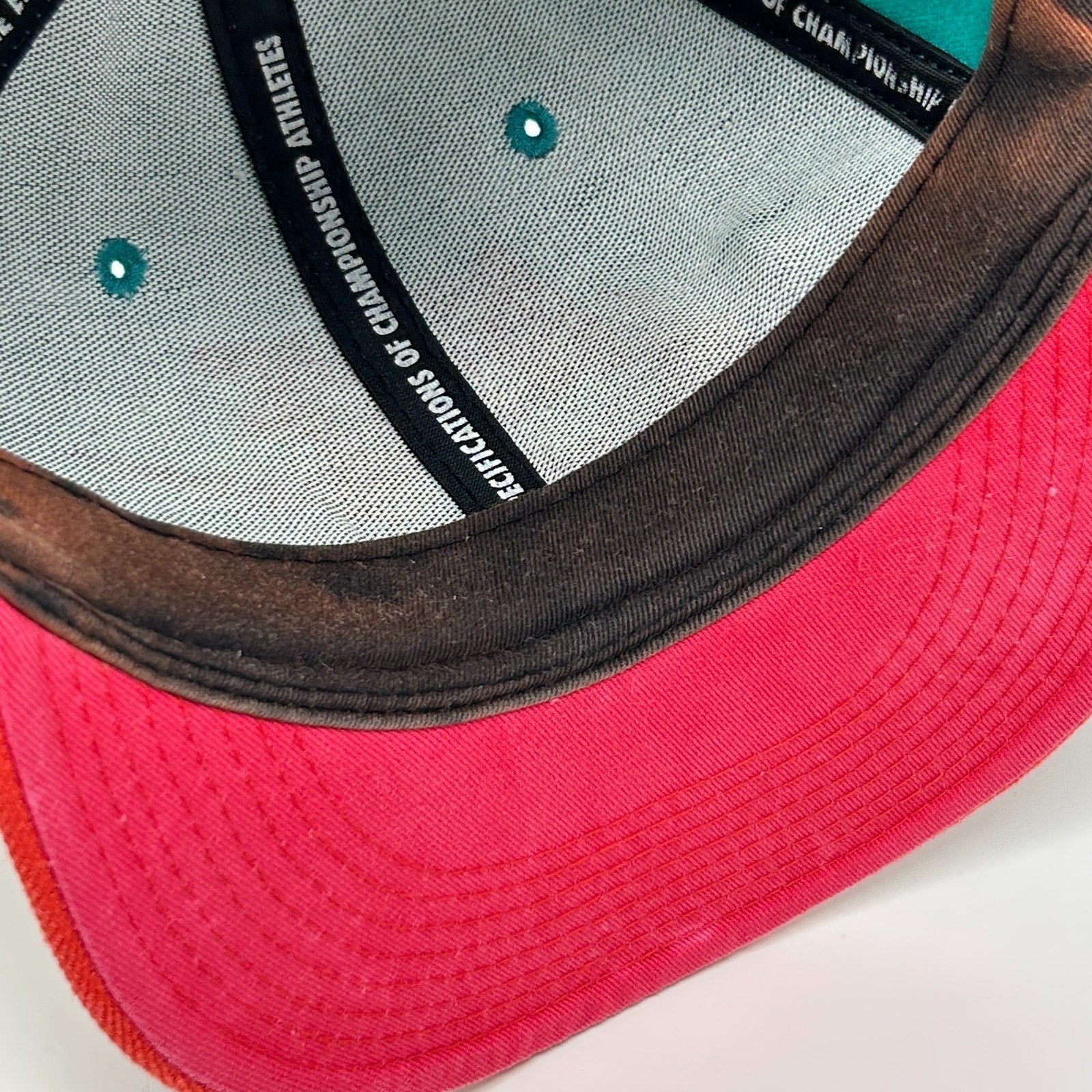Is faded and bleach staining on the sweatband. No other flaws noticed. Has been cleaned and sanitized. See photos.