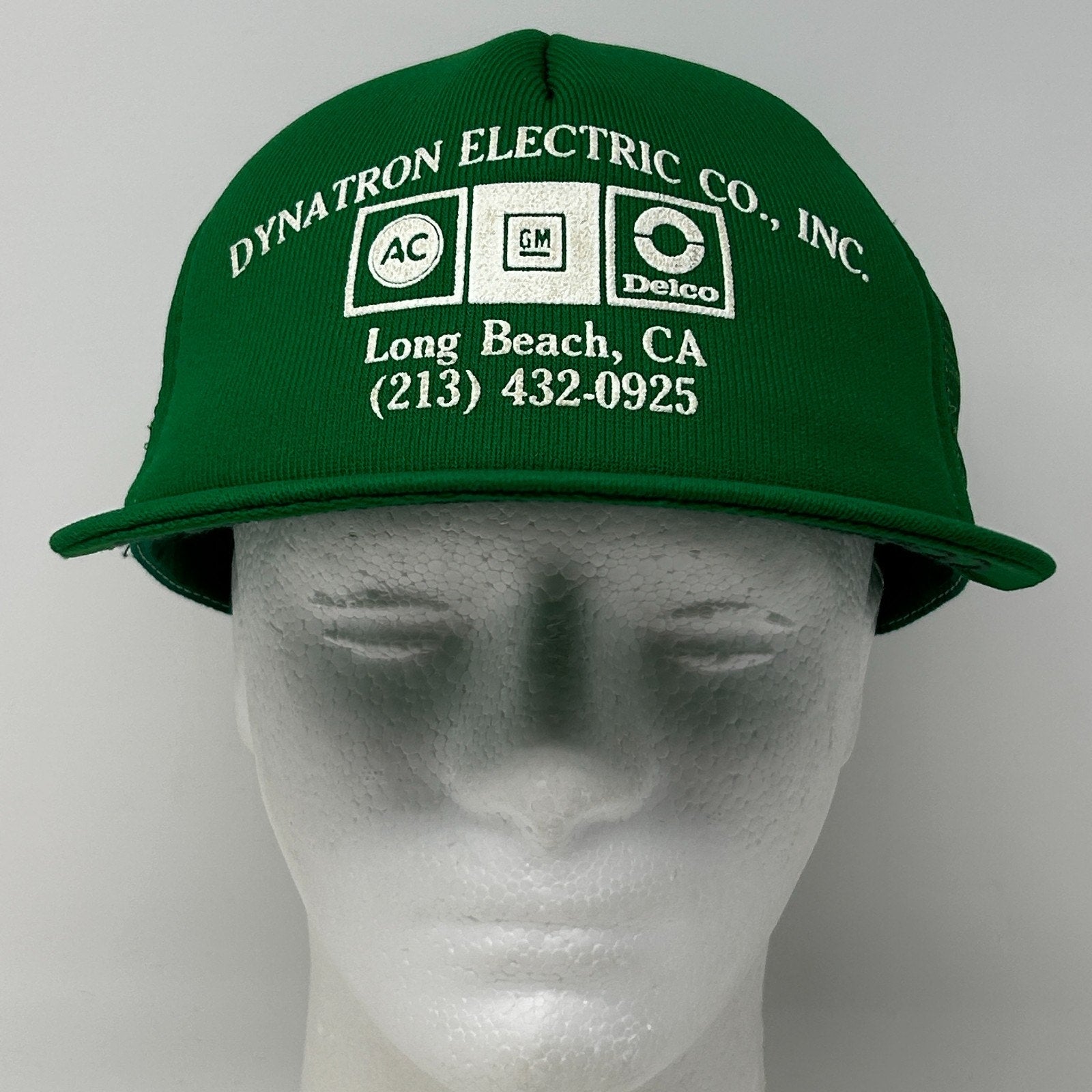 Vintage 80s Dynatron Electric Co Trucker Hat Baseball Cap GM ACDelco Long Beach California Auto Repair Shop Mechanic Made In USA Snapback Green 5 Panel A-Frame Foam Front