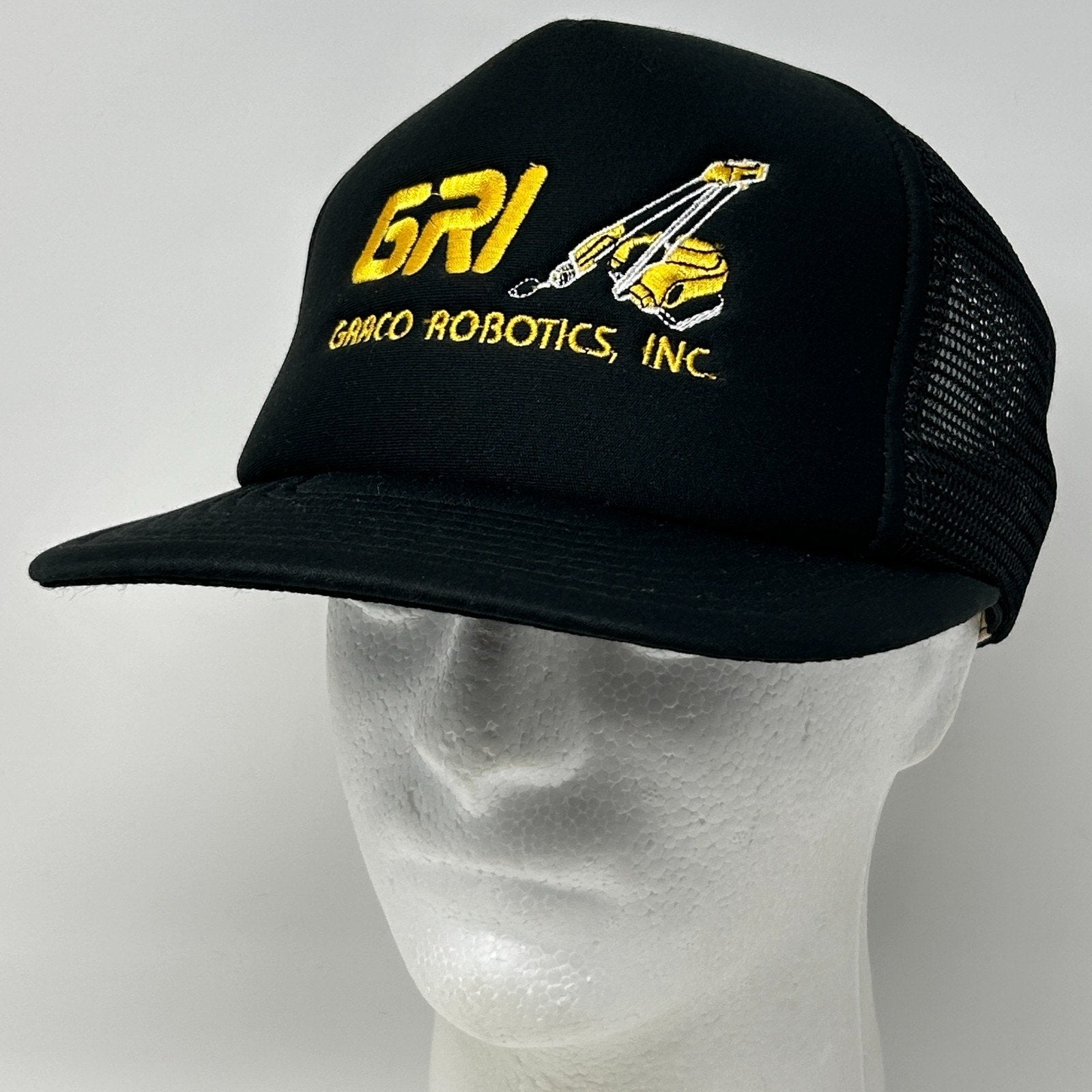 Vintage 90s Graco Robotics Inc Trucker Hat Baseball Cap GRI Mesh Foam Front 5 Panel Snapback Black