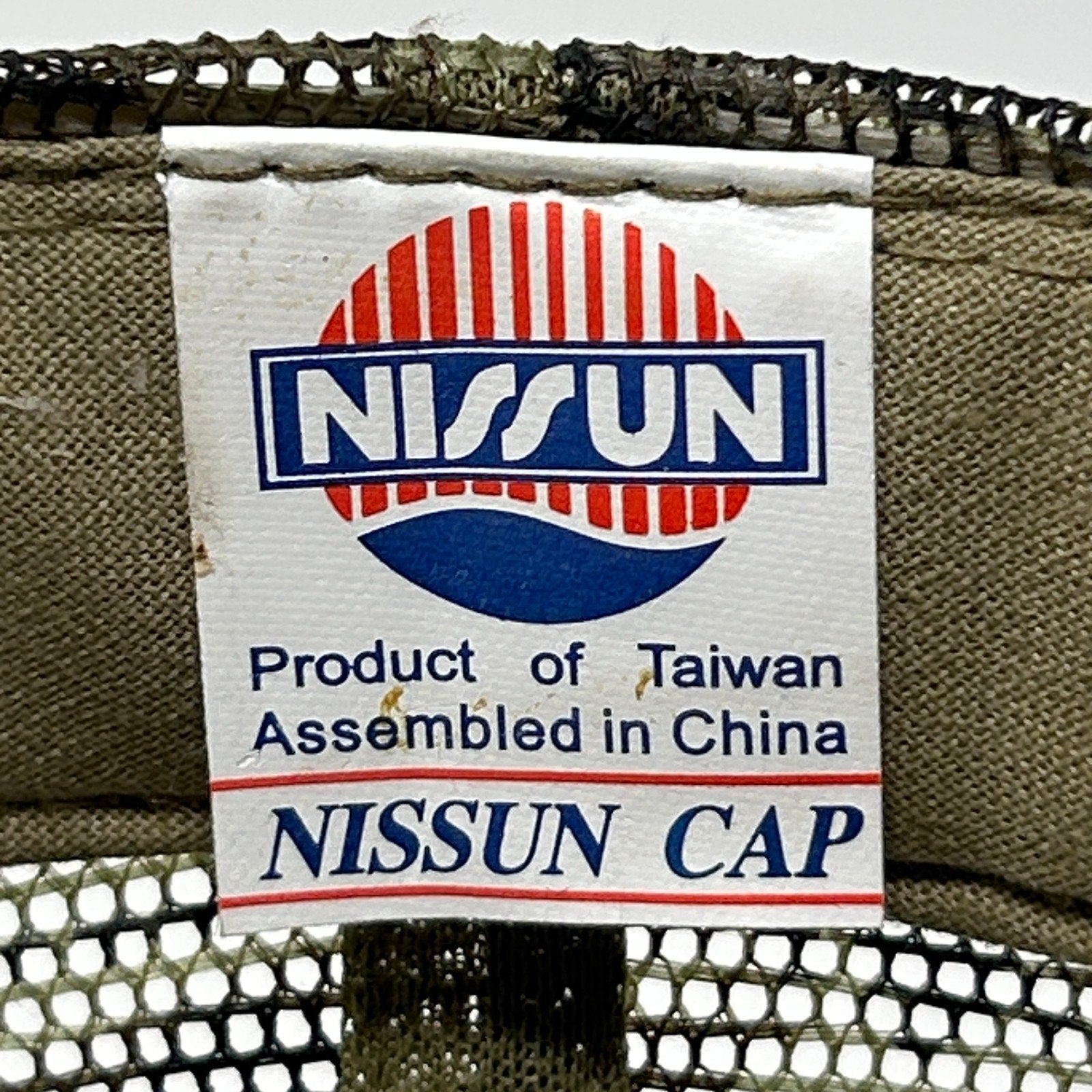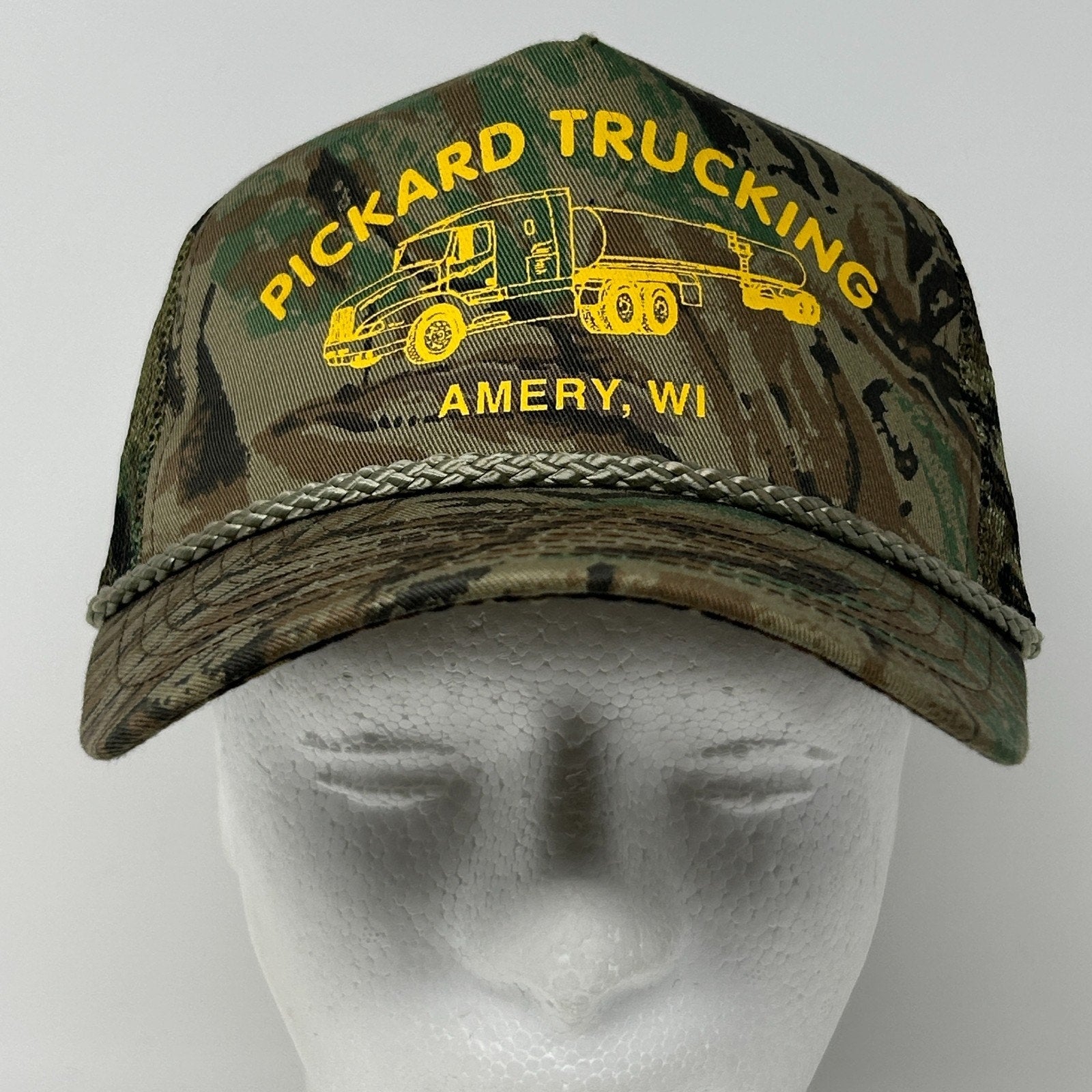 Vintage 90s Pickard Trucking Trucker Hat Baseball Cap Amery Wisconsin Tanker Truck Rope Corded Nissun Camo Camouflage Mesh Snapback Green