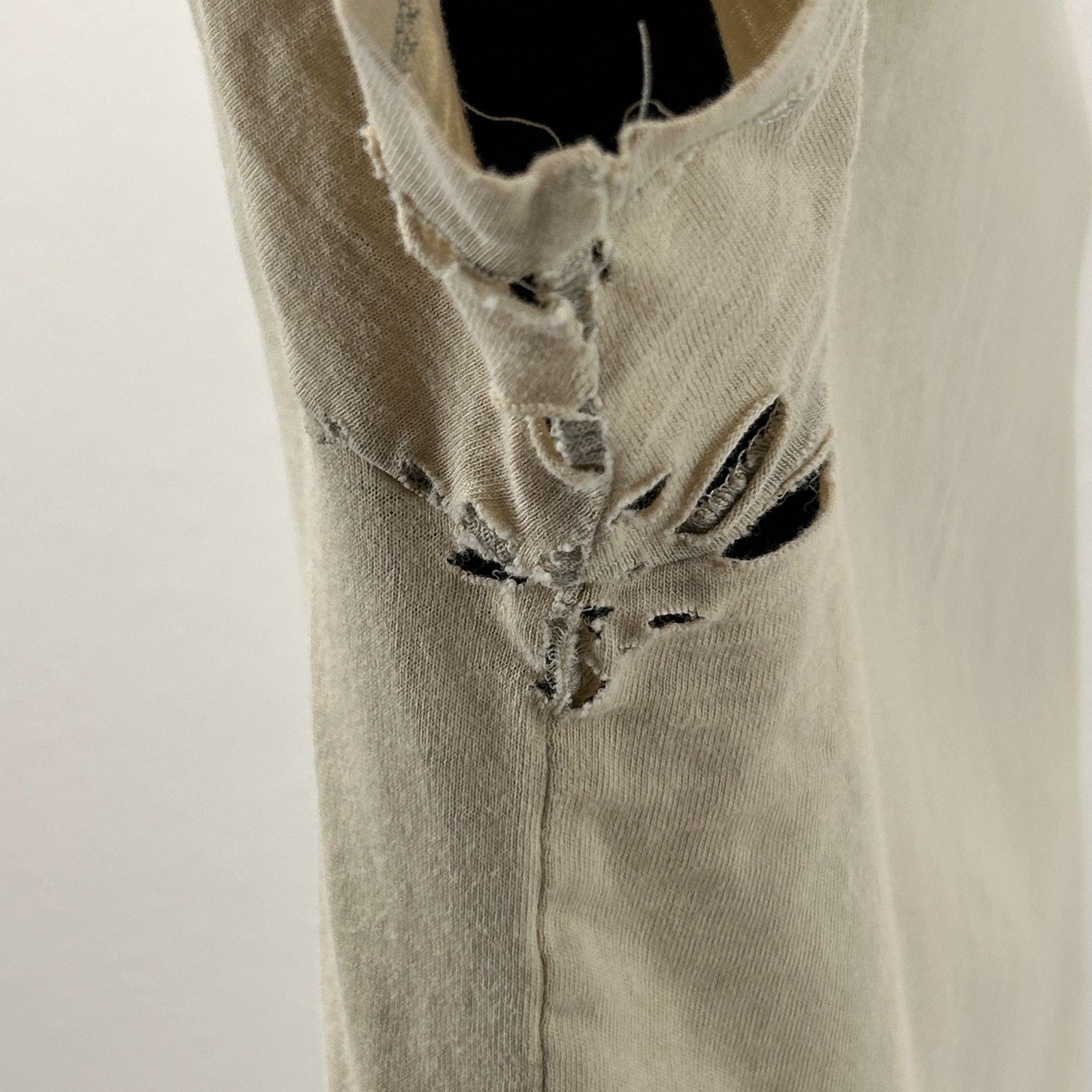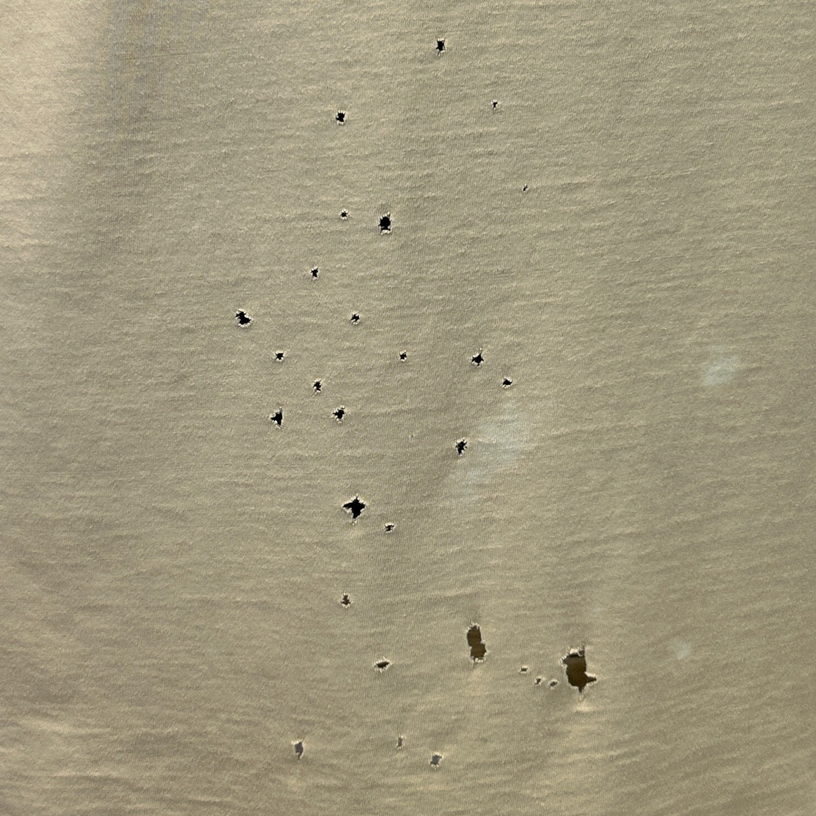 Naturally Distressed/Destroyed. Has holes and spots. No other flaws noticed. See photos.