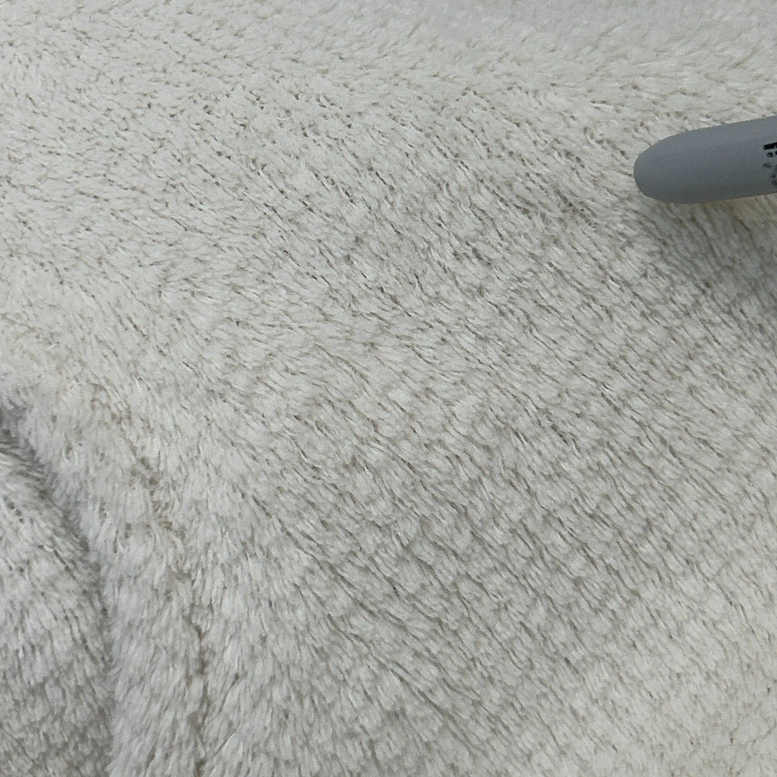 Has a small thin spot in the fleece on the front and faint spots on the elbows. No other flaws noticed. Missing tag but I feel it measures similar to a Small. Check measurements to ensure fit. See photos.