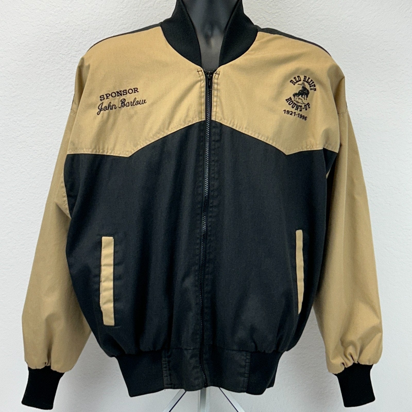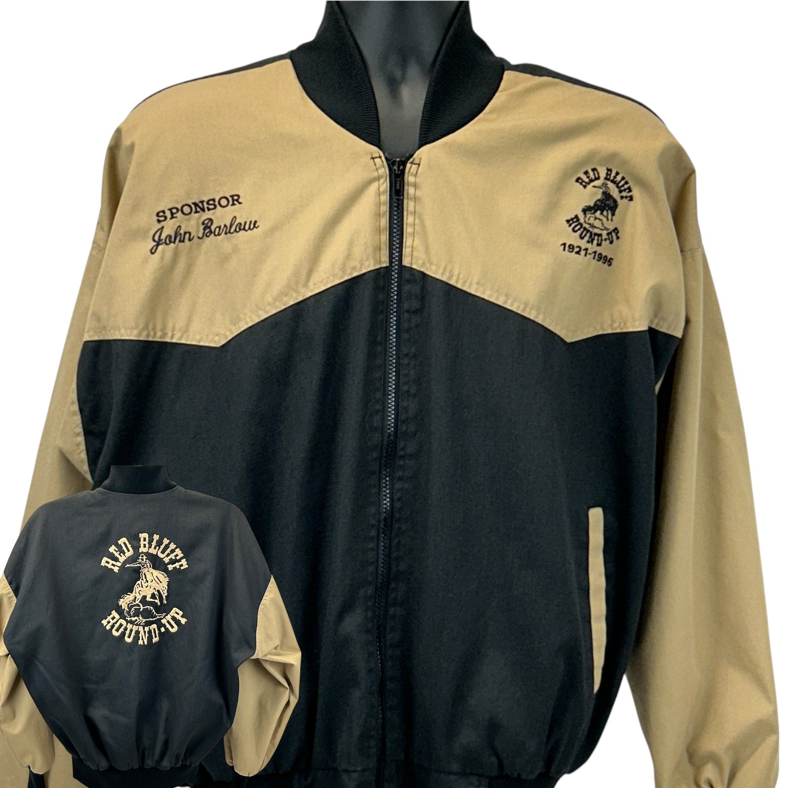 Vintage 90s Red Bluff Round Up Bomber Jacket 1996 Rodeo California PRCA John Barlow Sponsor Made In USA Beige L Large