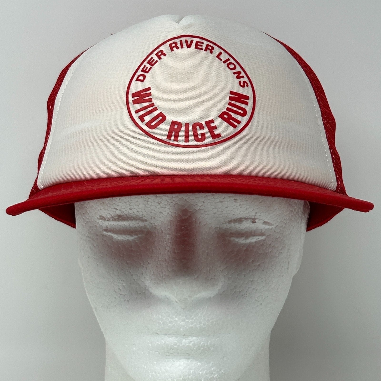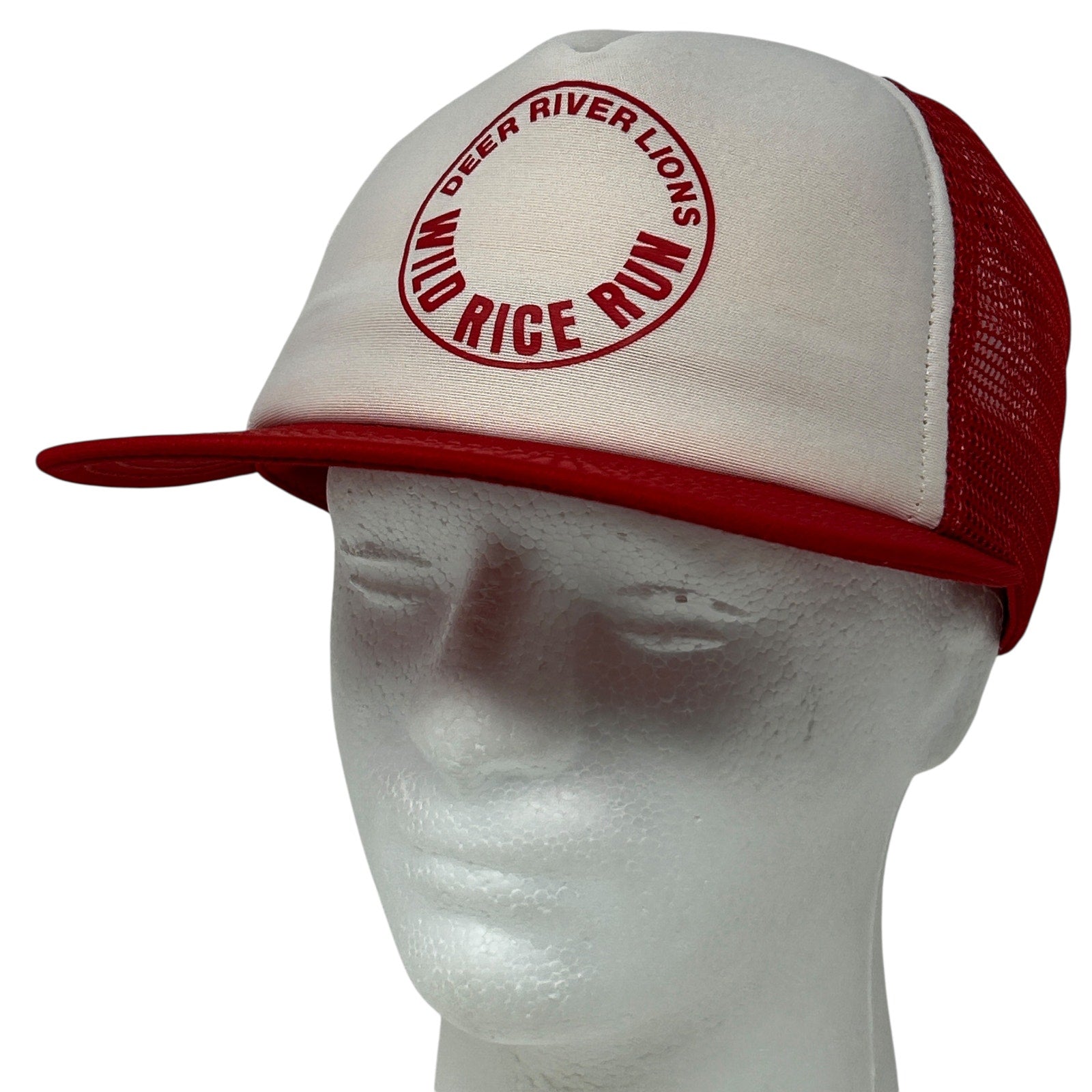 Vintage Deer River Lions Club Wild Rice Run Trucker Hat Baseball Cap Red 80s Minneapolis Festival Running Runner Foam Front Mesh Snapback 5 Panel A-Frame The Winner Made In USA