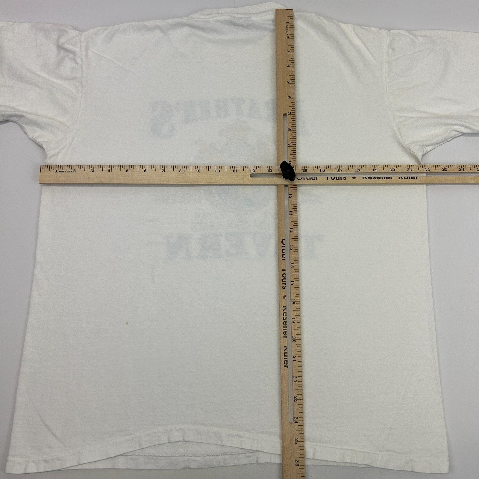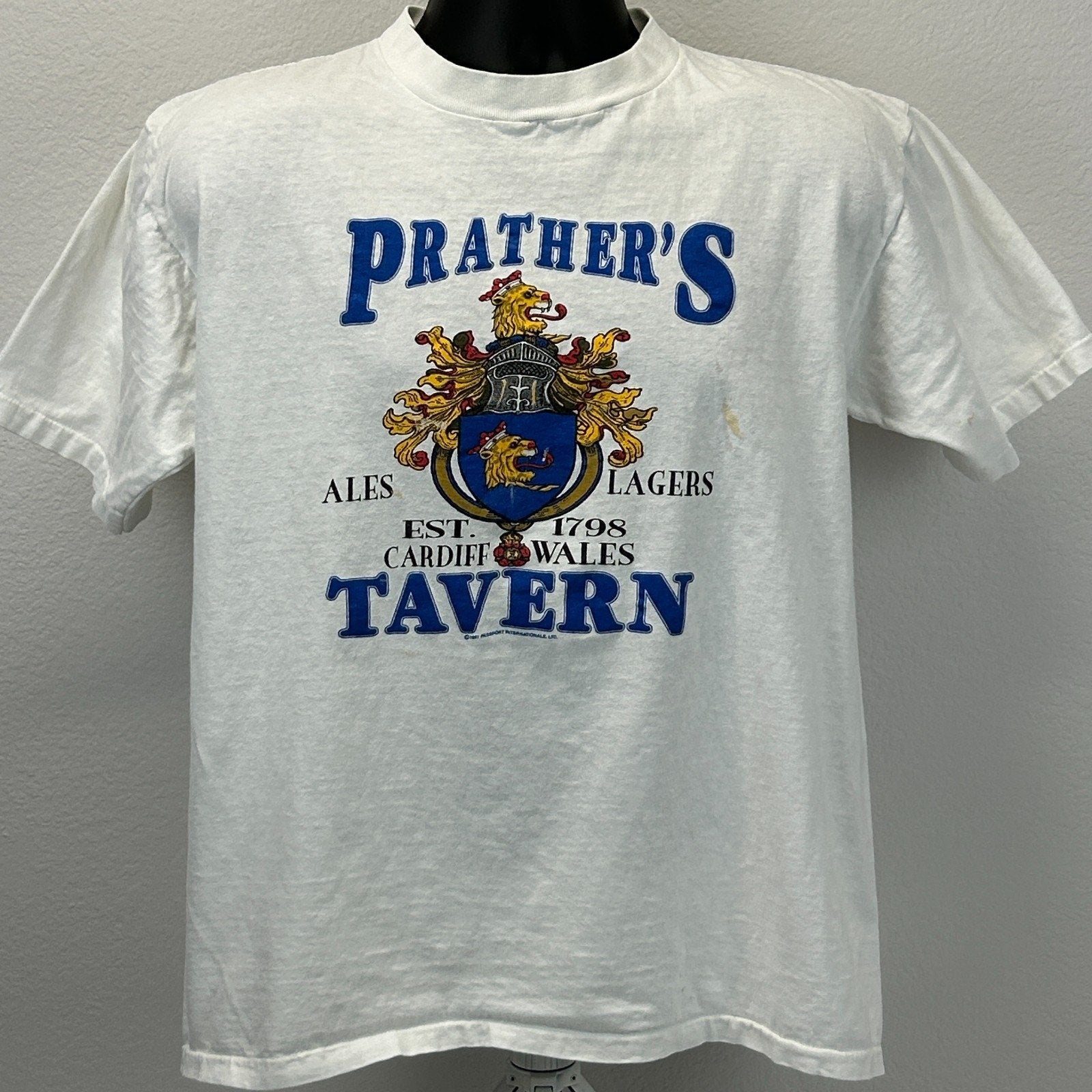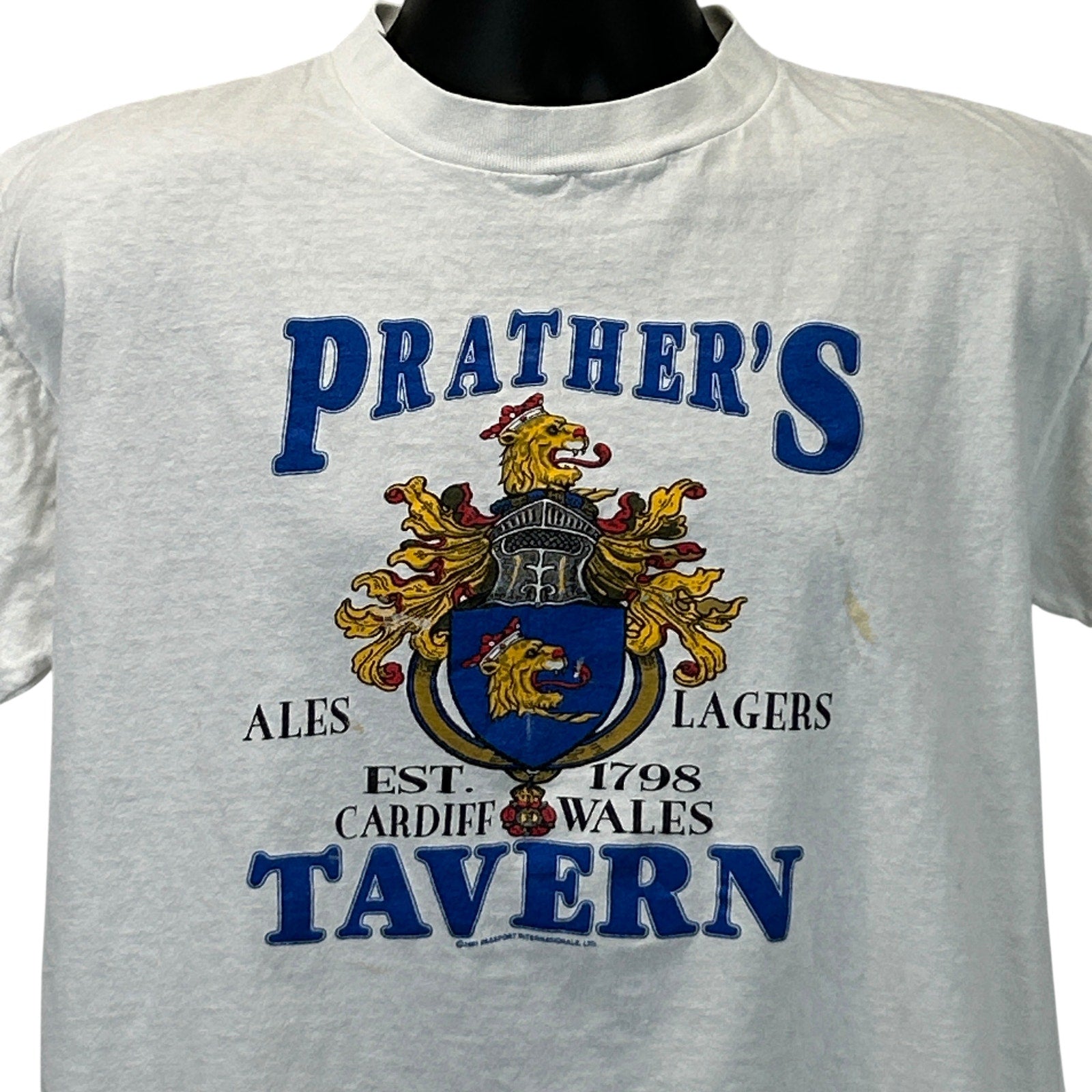 Vintage Prathers Tavern Cardiff Wales T Shirt Mens L Large White 90s Welsh Ales Lager Bar Oneita Single Stitch Made In USA Graphic Tee