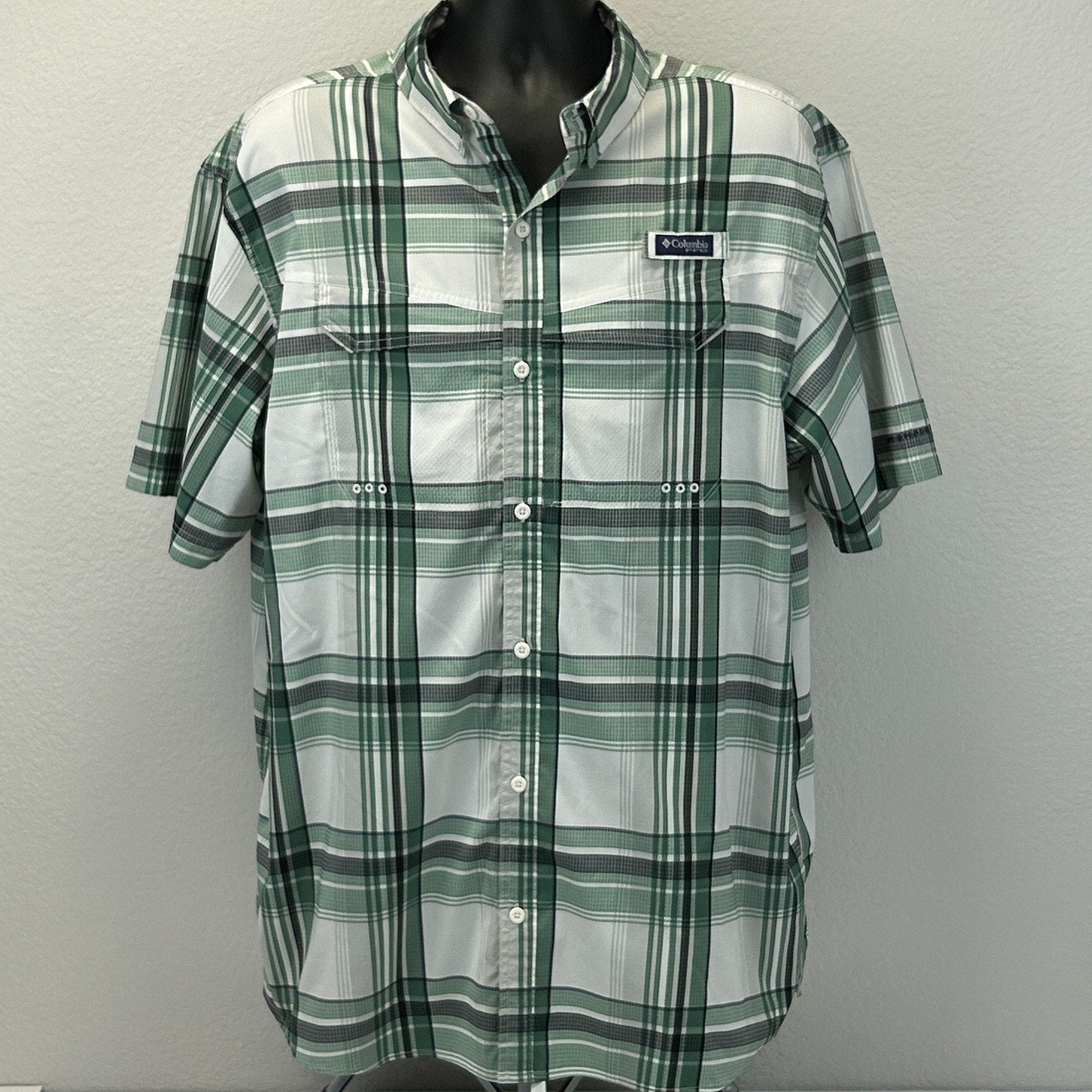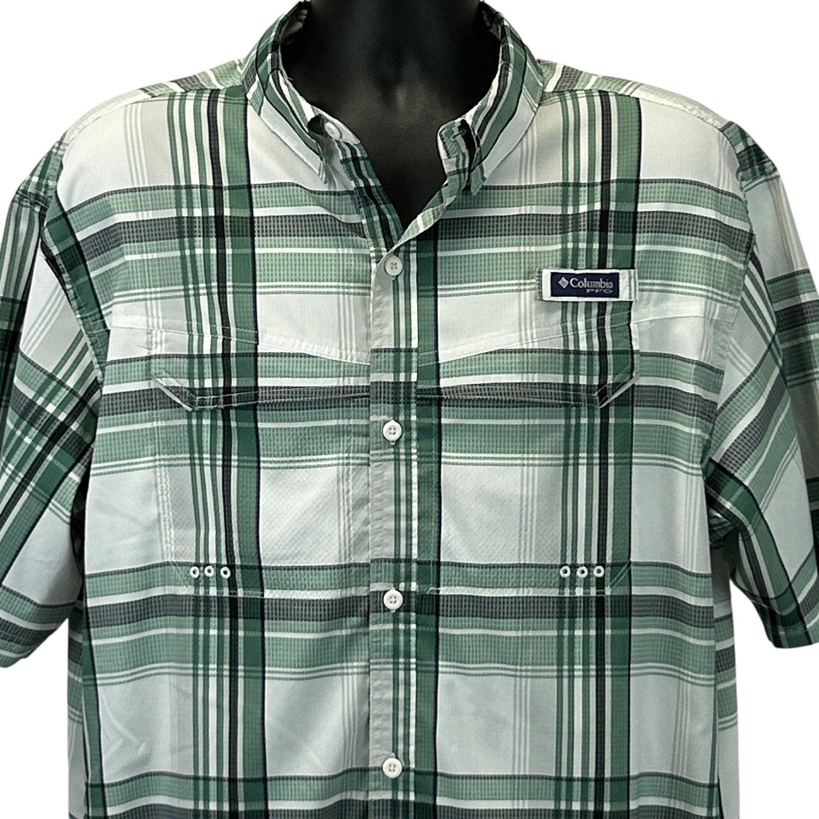 Columbia PFG Super Low Drag Button Front Shirt Fishing Fisherman Vented Pockets Omni-Shade Short Sleeve 1653521 Plaid Green XL X-Large