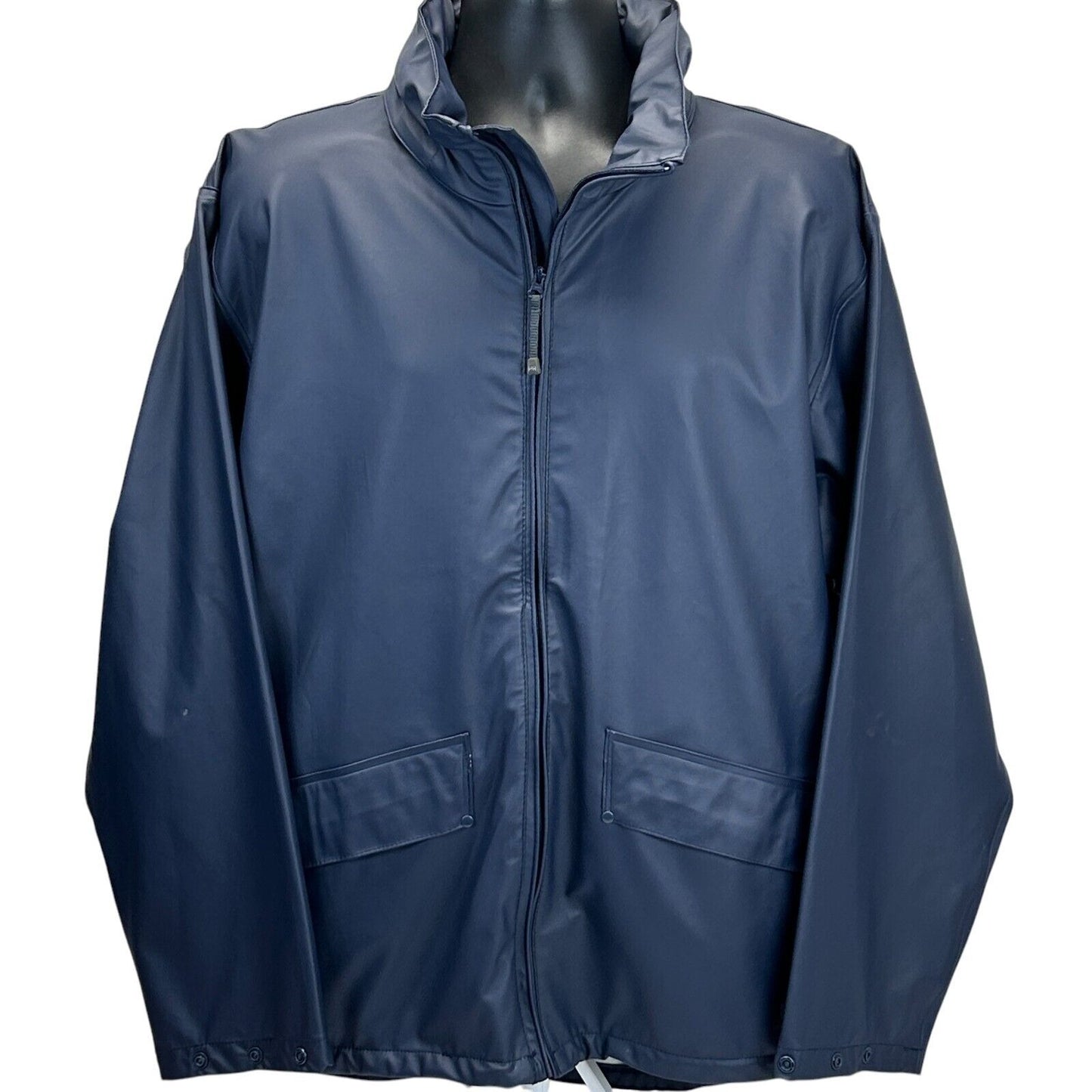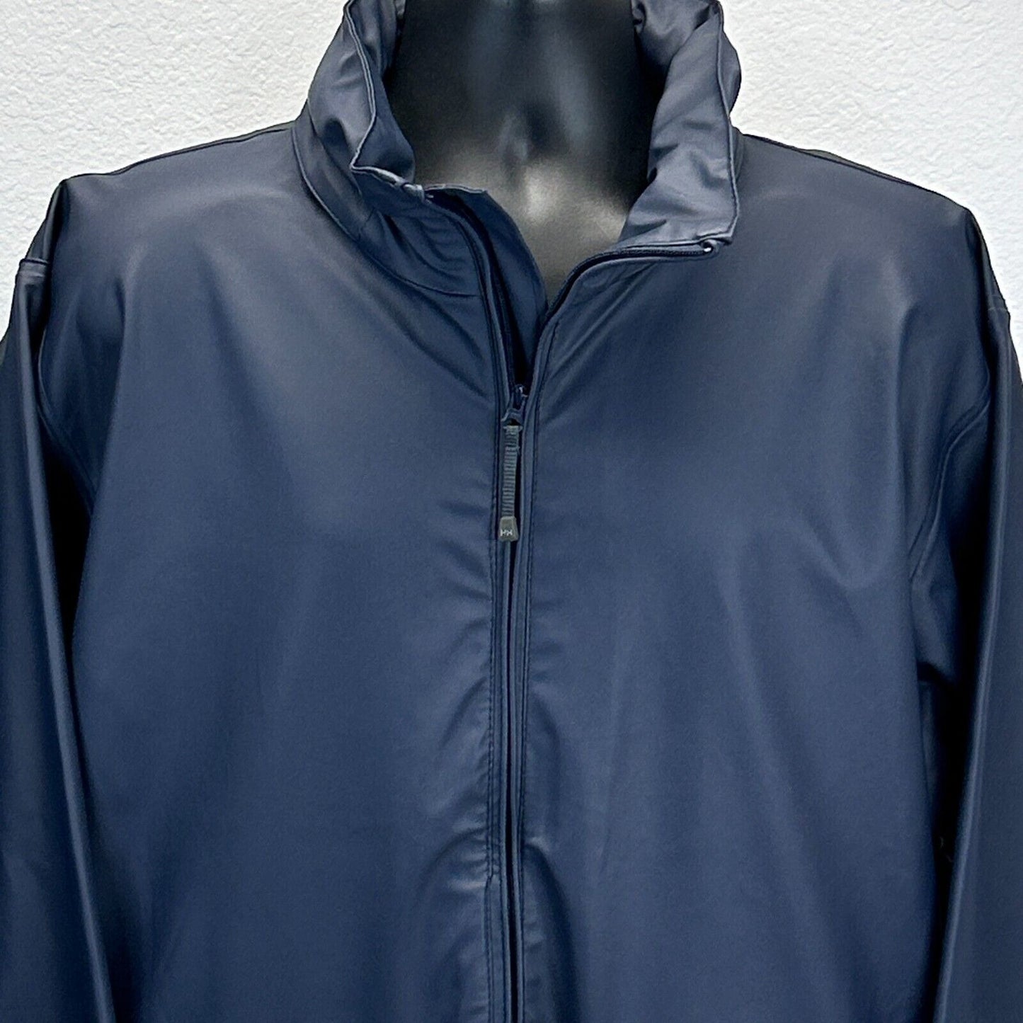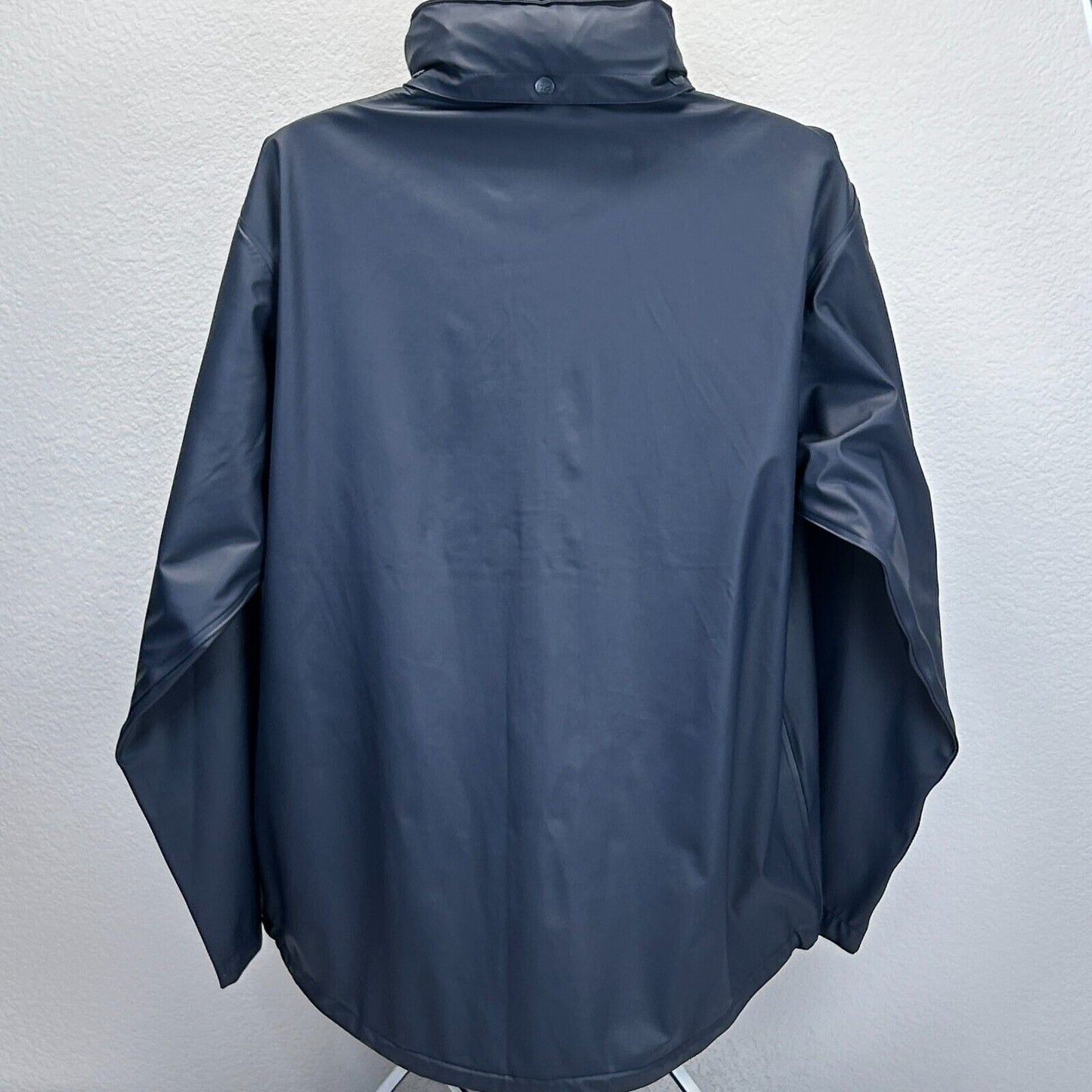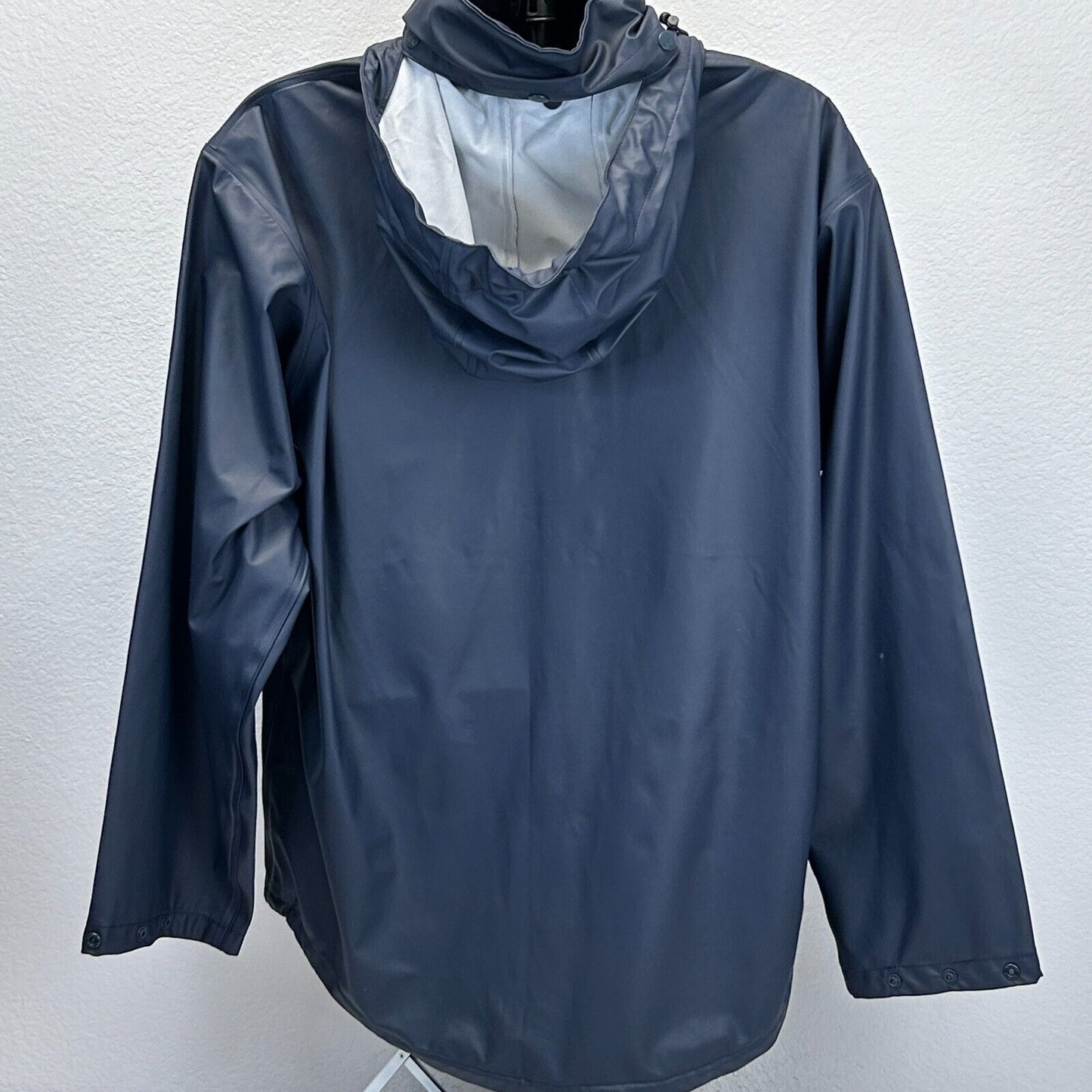 Helly Hansen Raincoat Jacket Mens Large Blue Hidden Hood Pockets Backpacking