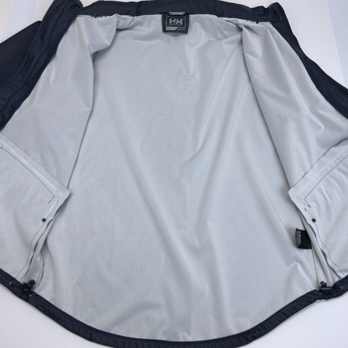 Helly Hansen Raincoat Jacket Mens Large Blue Hidden Hood Pockets Backpacking Hiking Backpacker Hiker Outdoors LTI55267J