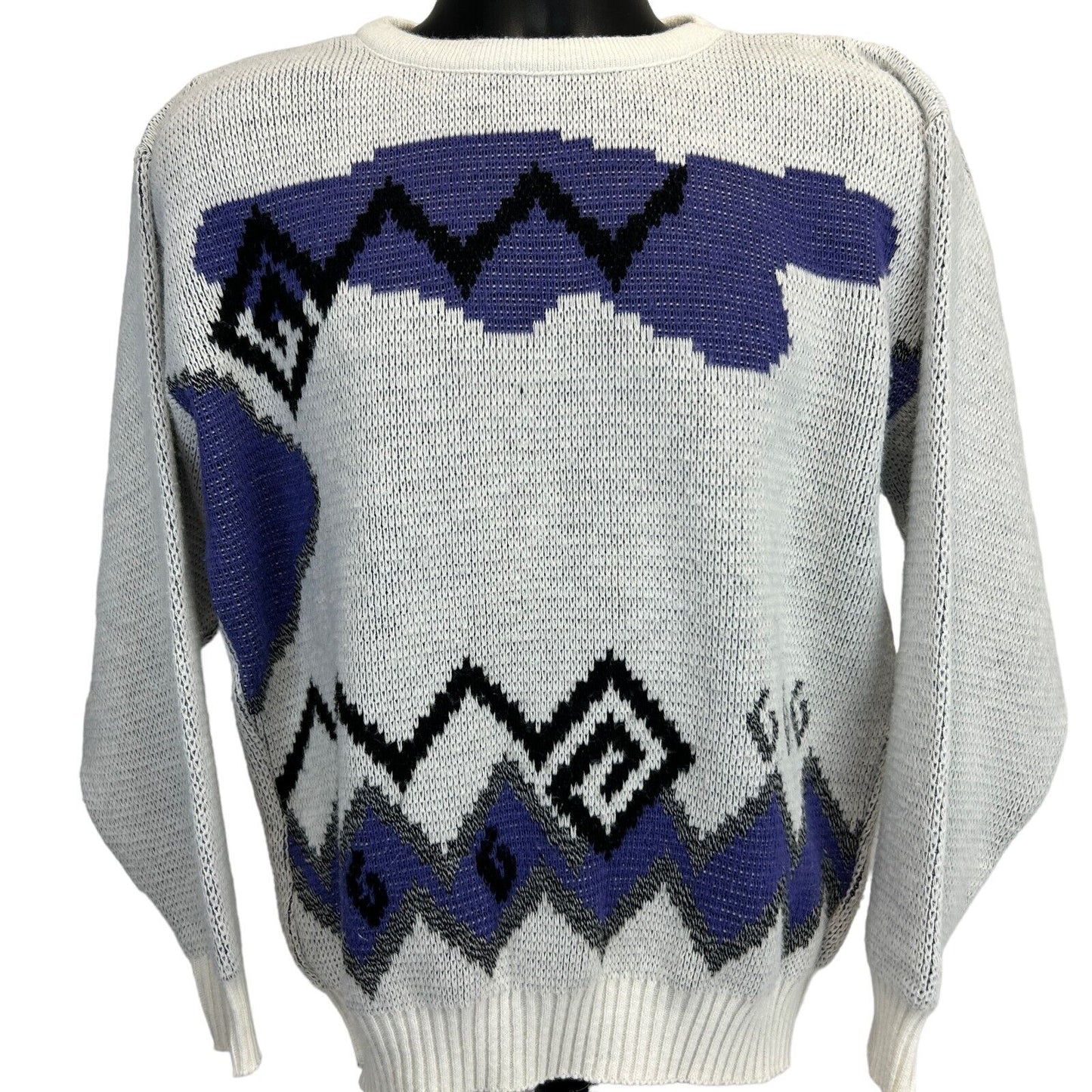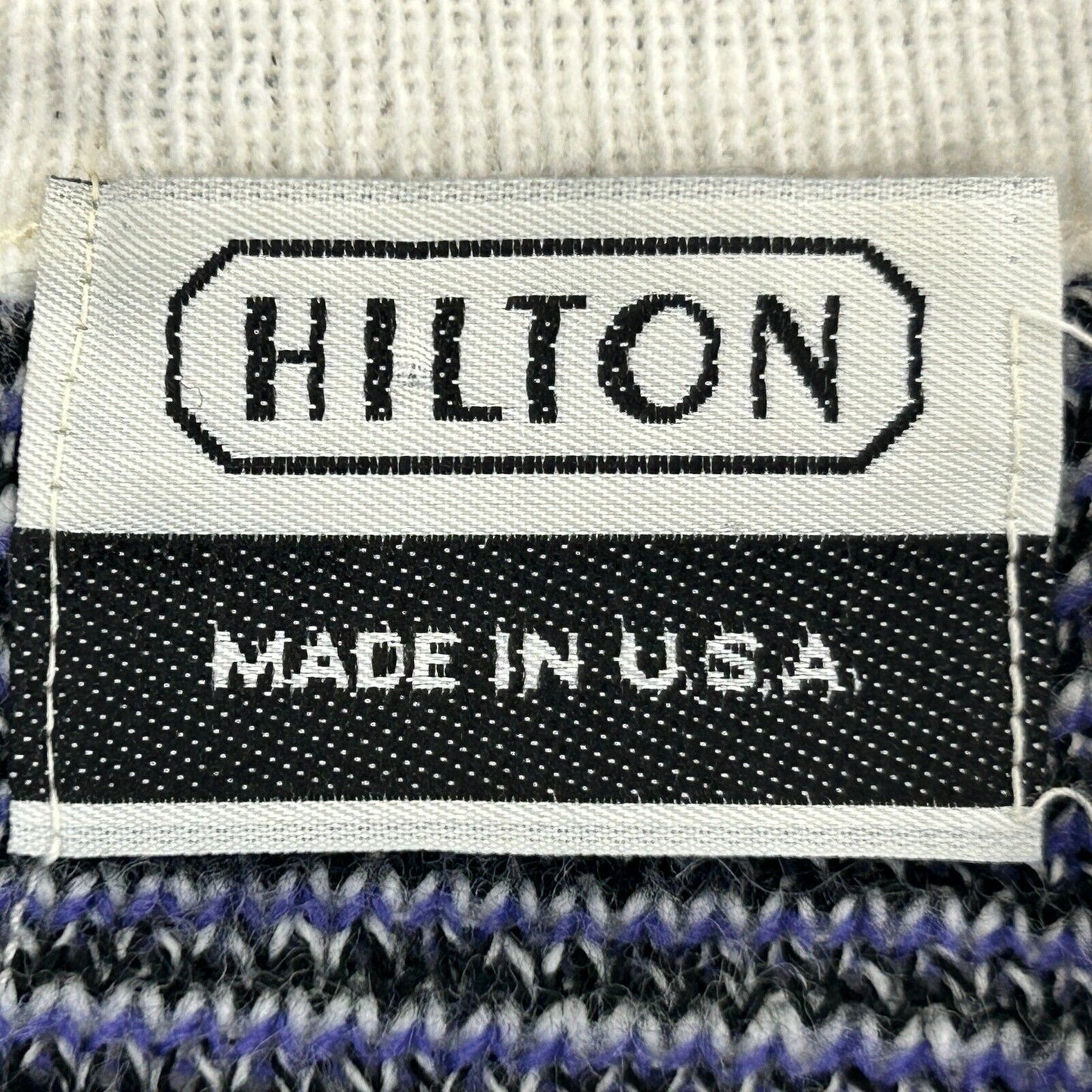 Suéter de punto Hilton vintage de los años 90 con diseño geométrico blanco y morado, fabricado en EE. UU., manga larga