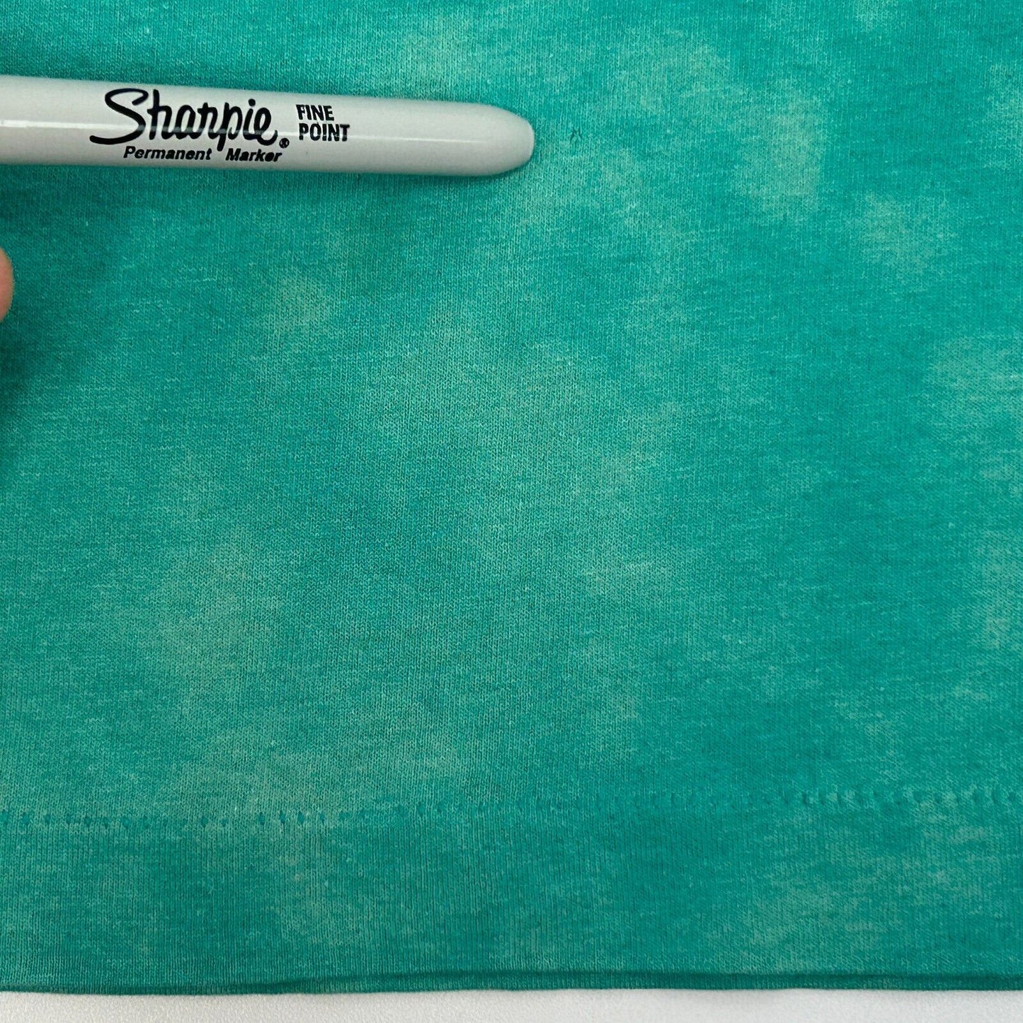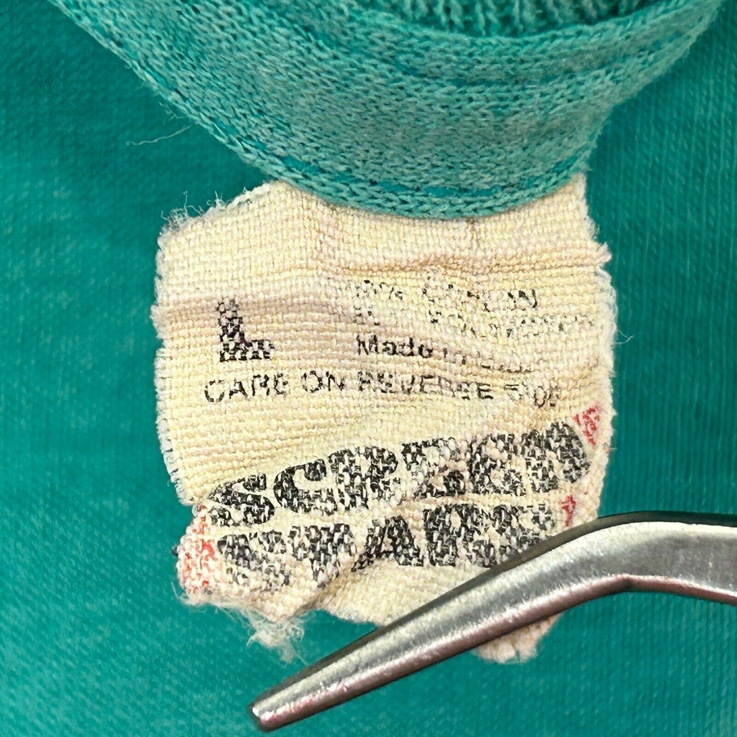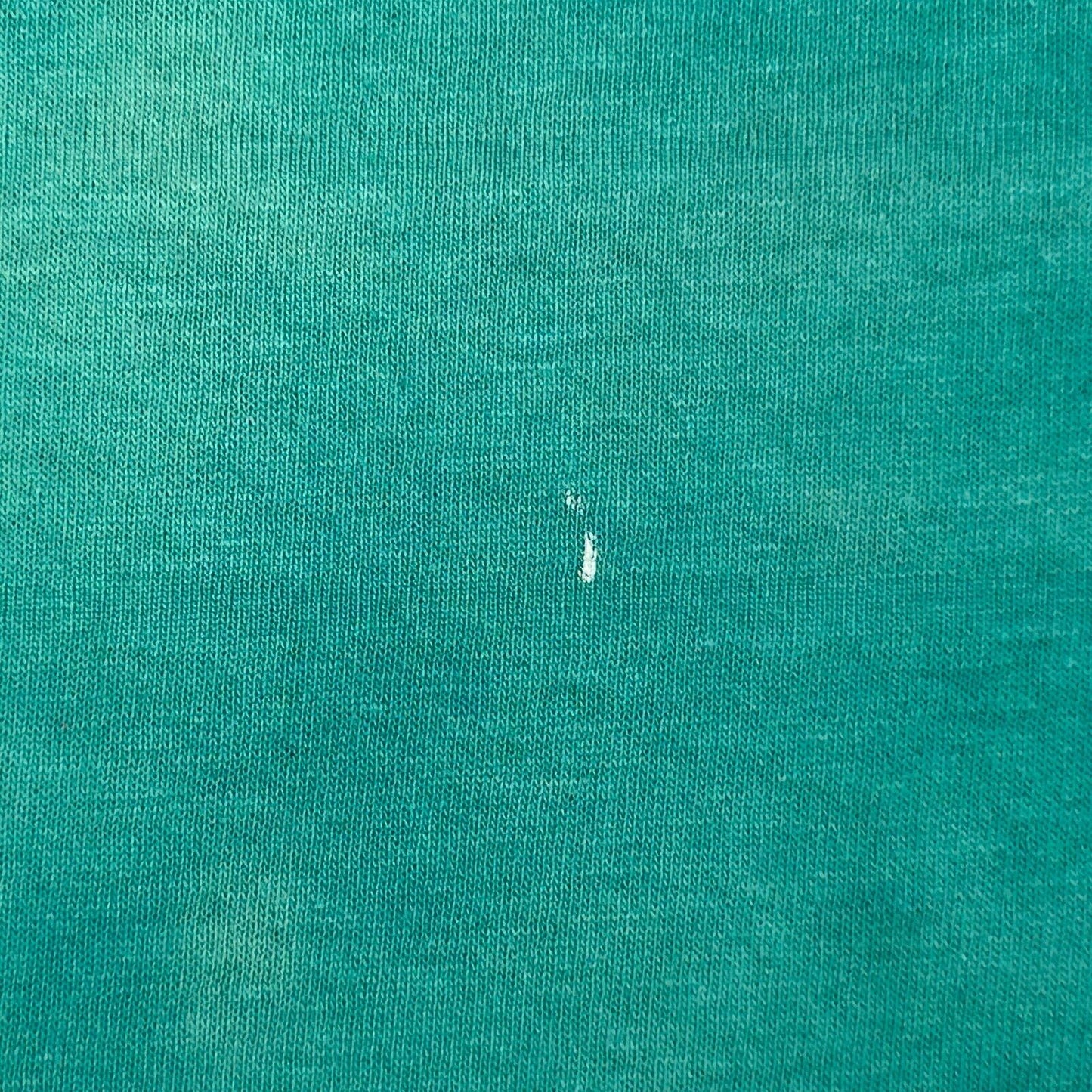Has a small pinhole on the bottom front, image fading, and a paint spot - no other flaws noticed. Has been washed and is ready for you to wear. Tag is a Large but I feel it measures more similar to a modern Medium. Check measurements to ensure fit. See photos.
