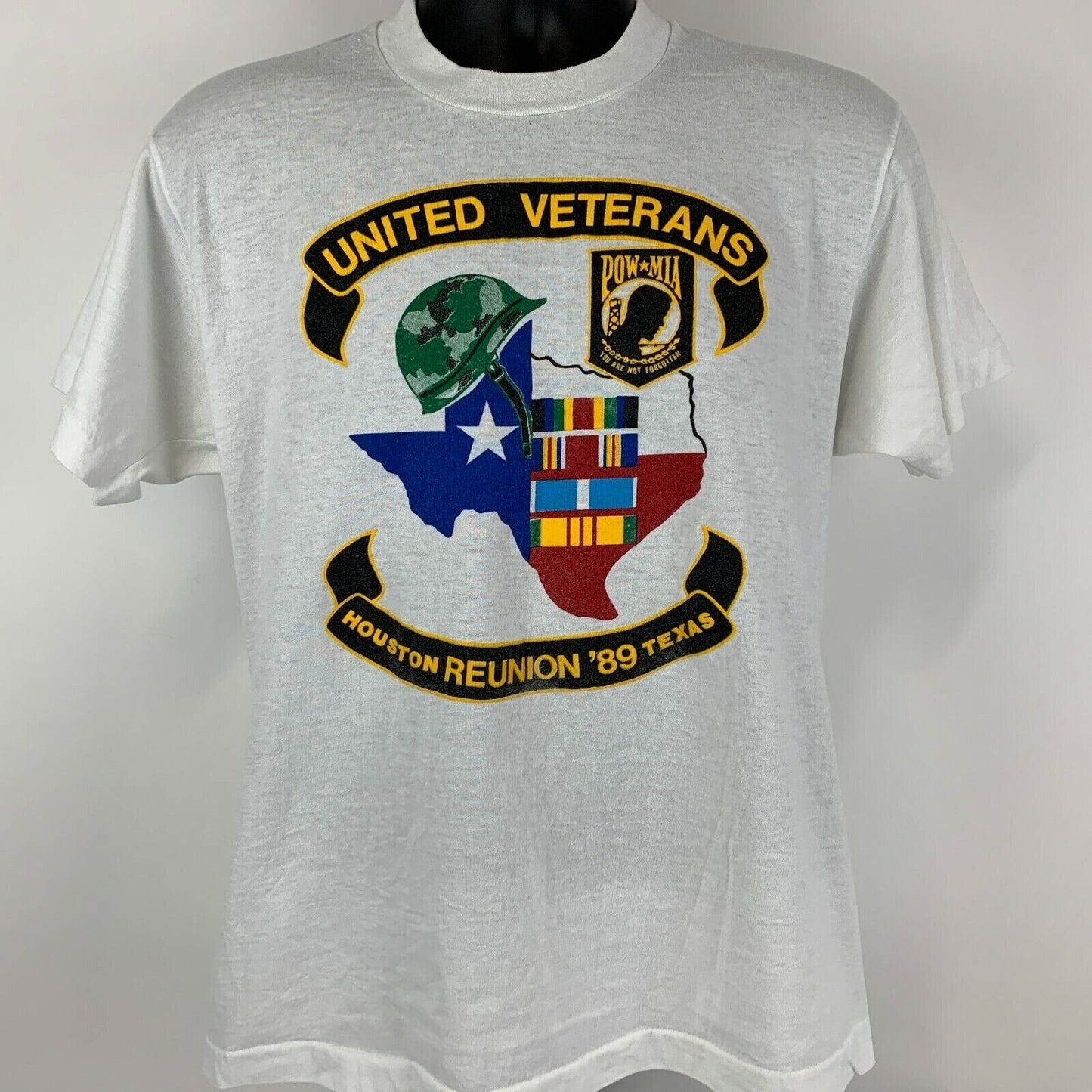 Vintage 80s 1989 United Veterans Reunion Texas Camiseta Houston Texas POW MIA Militar Pantalla Blanca Estrellas Mejor Punto Simple Hecho en EE.UU. Camiseta Gráfica