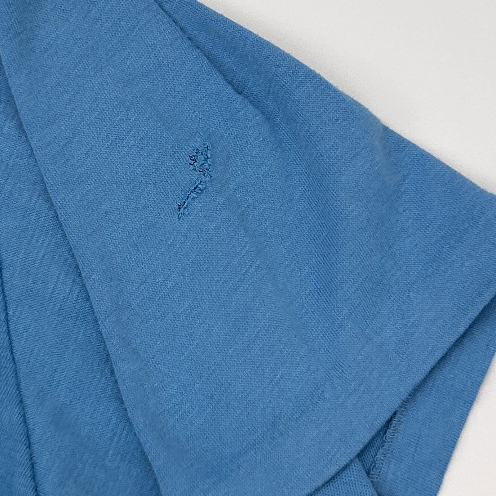 Has some scratches on the graphic and a hole on one sleeve was patched on the inside. No other flaws noticed. Missing tag but I feel it measures similar to a Medium. Check measurements to ensure fit. See photos.