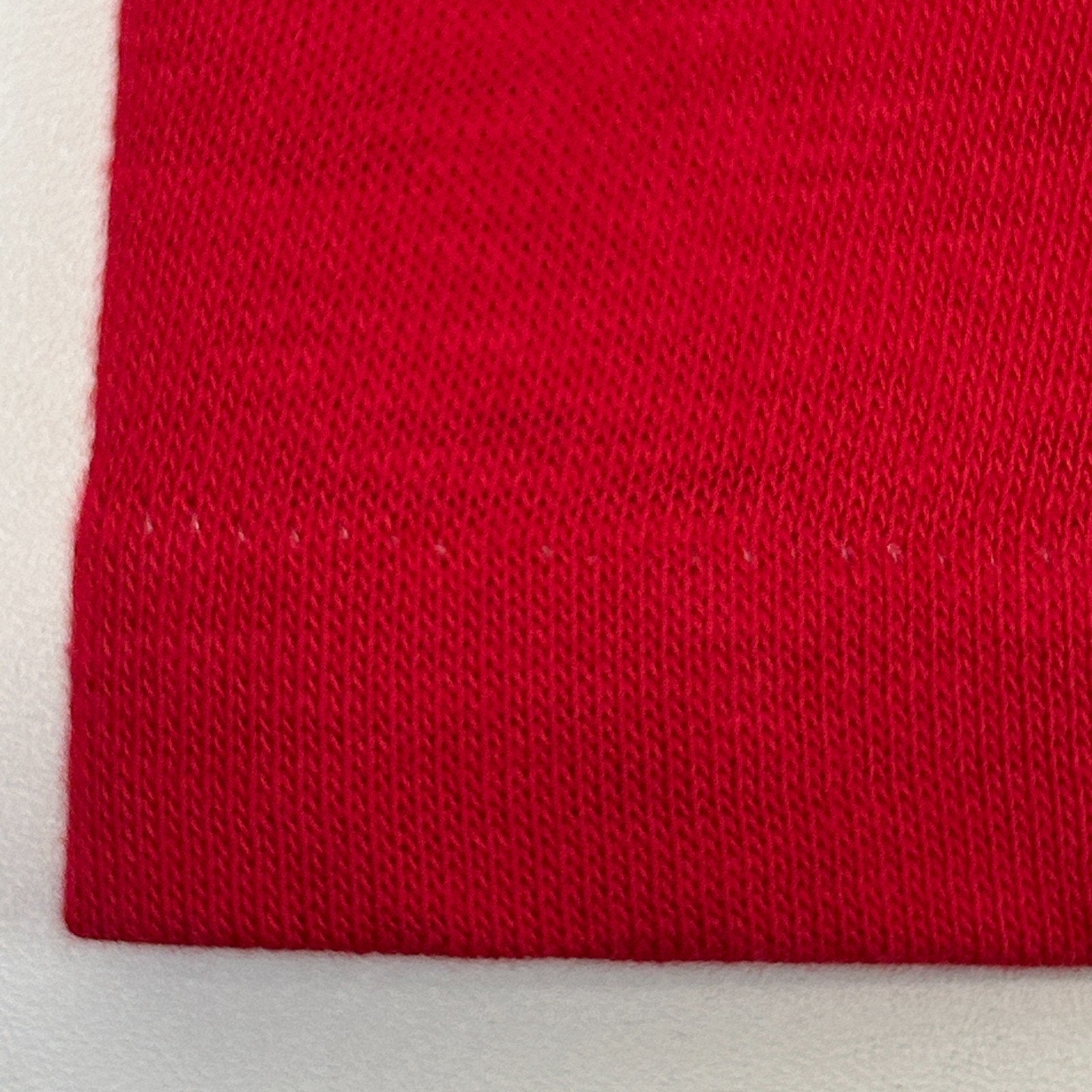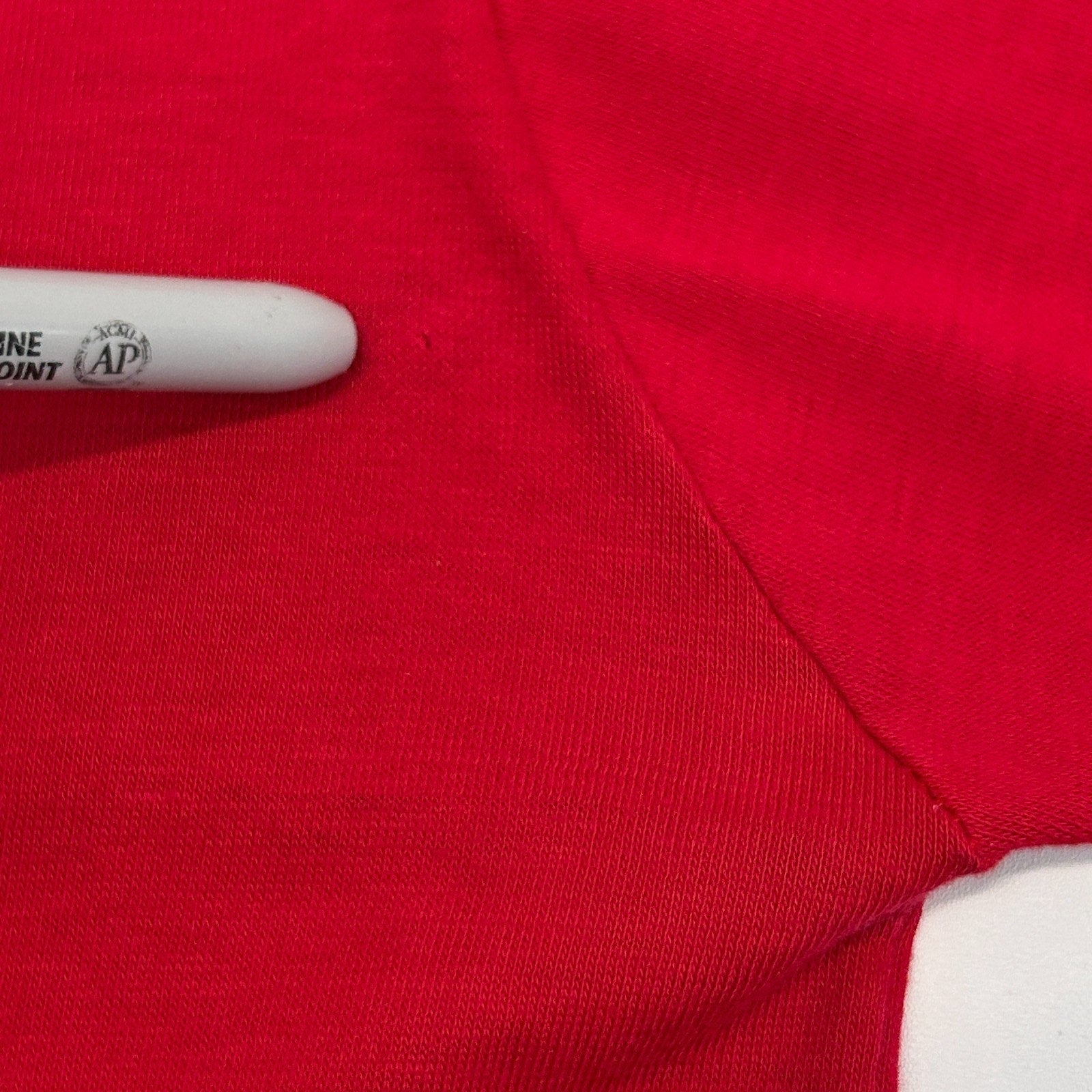 Has some scratches on the graphic, fading of the collar, and a tiny pinhole has been patched from the inside. The hole should not spread further and skin will not show through it. No other flaws noticed. Missing tag but I feel it measures similar to a Medium. Check measurements to ensure fit. See photos.