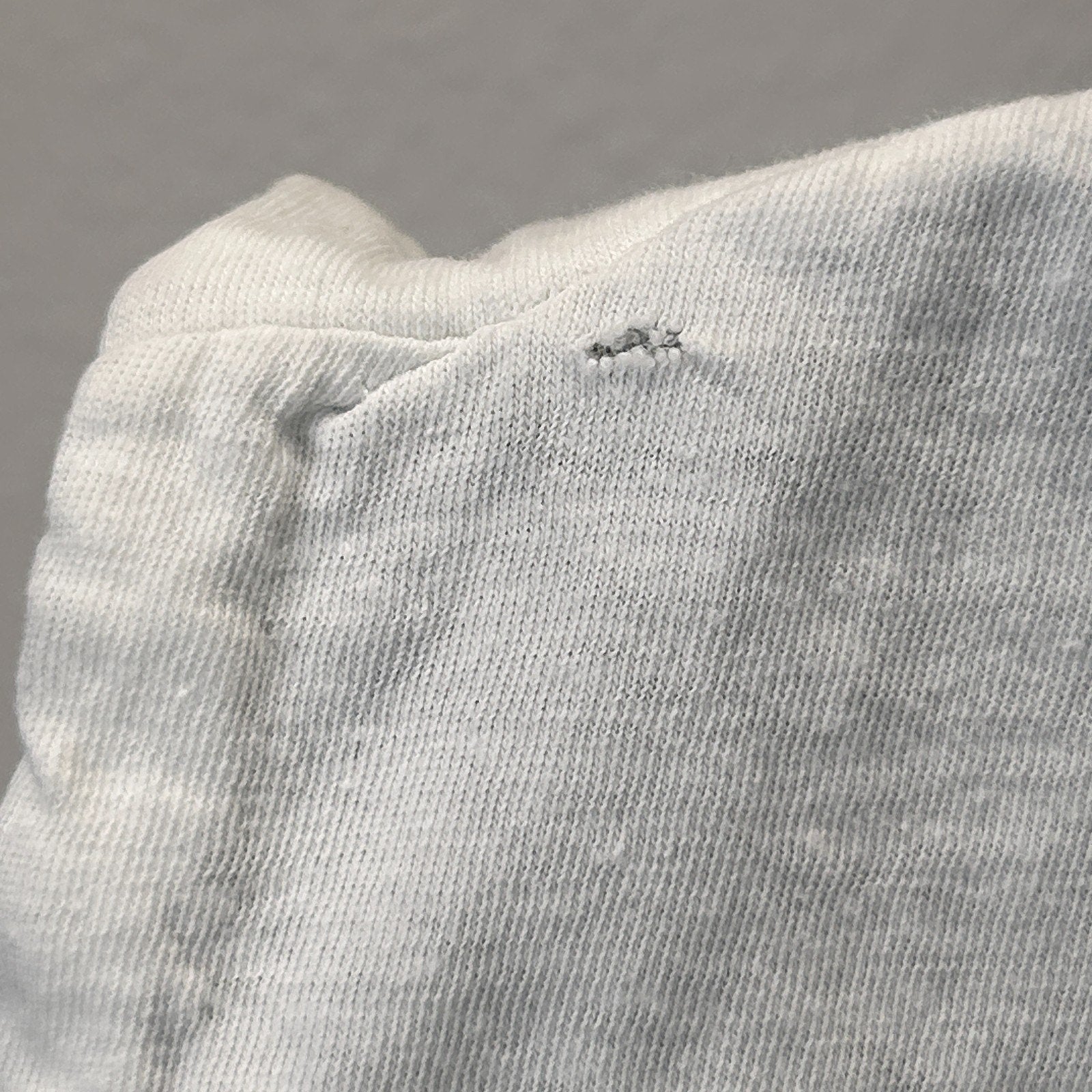 The sleeves might have been cut off and the edge sewn or it was made like that. A few tiny pinholes have been patched from the inside. The holes should not spread further and skin will not show through. No other flaws noticed. See photos for details.