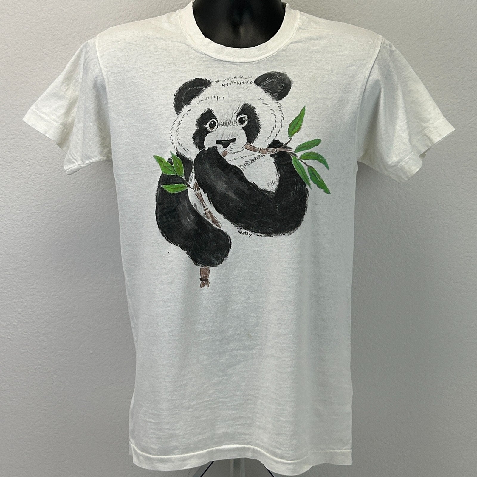 Vintage 80s Distressed Giant Panda Bear T Shirt Hand Painted White S Small Fruit of the Loom Single Stitch Graphic Tee