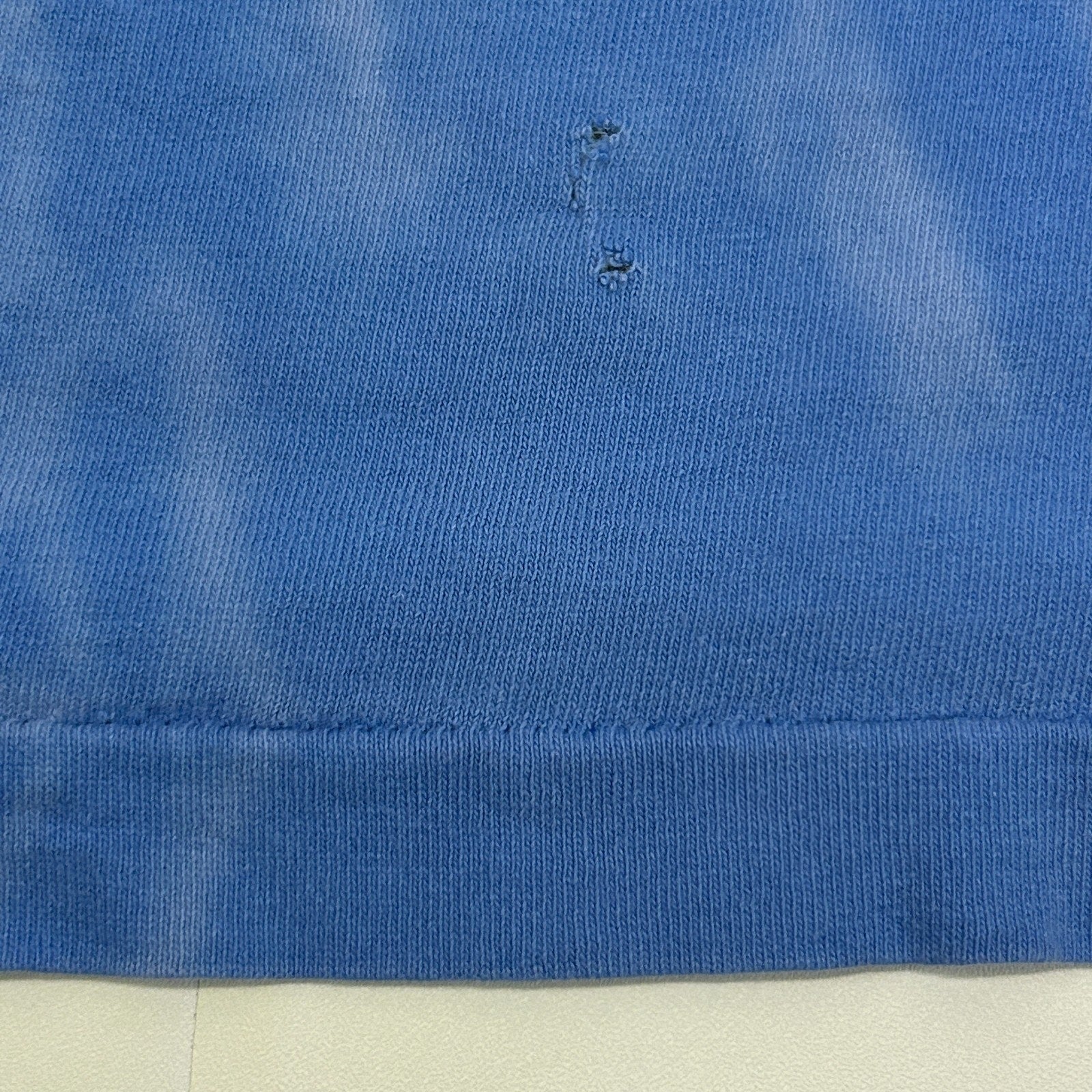 Has a spot on the back, image cracking, some fraying on the collar, and a couple small holes on the bottom front have been patched from the inside. The holes should not spread further and skin will not show through. No other flaws noticed. See photos for details.