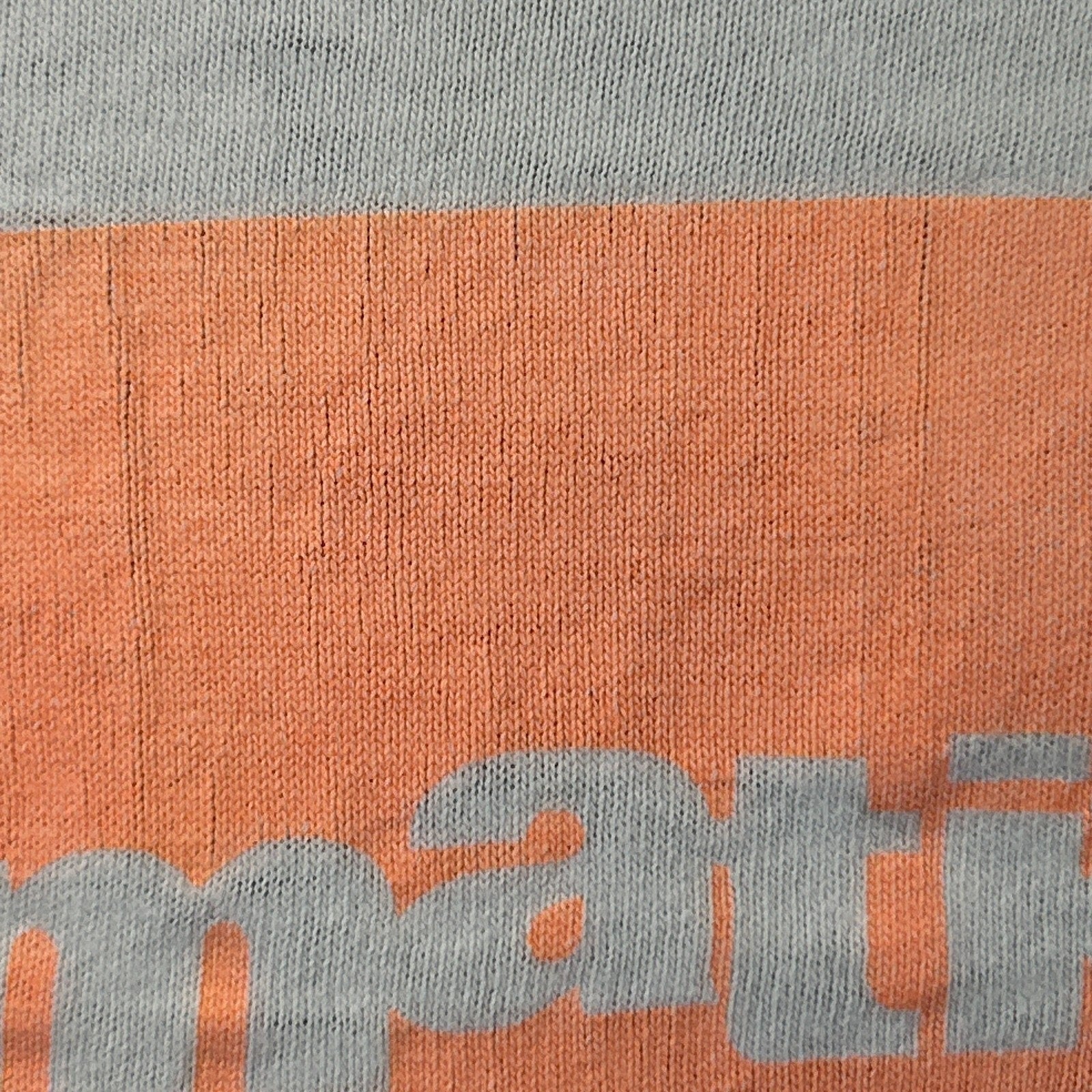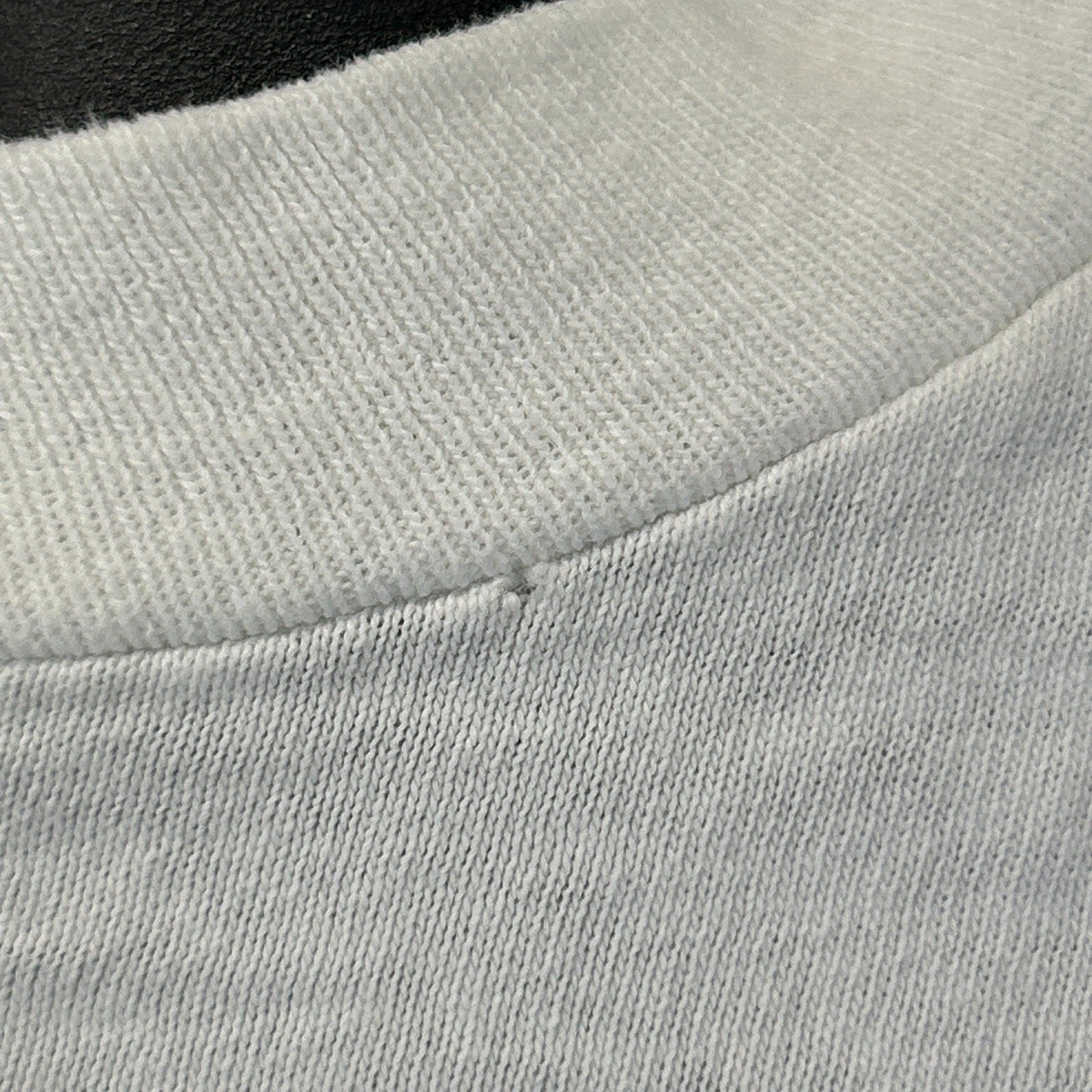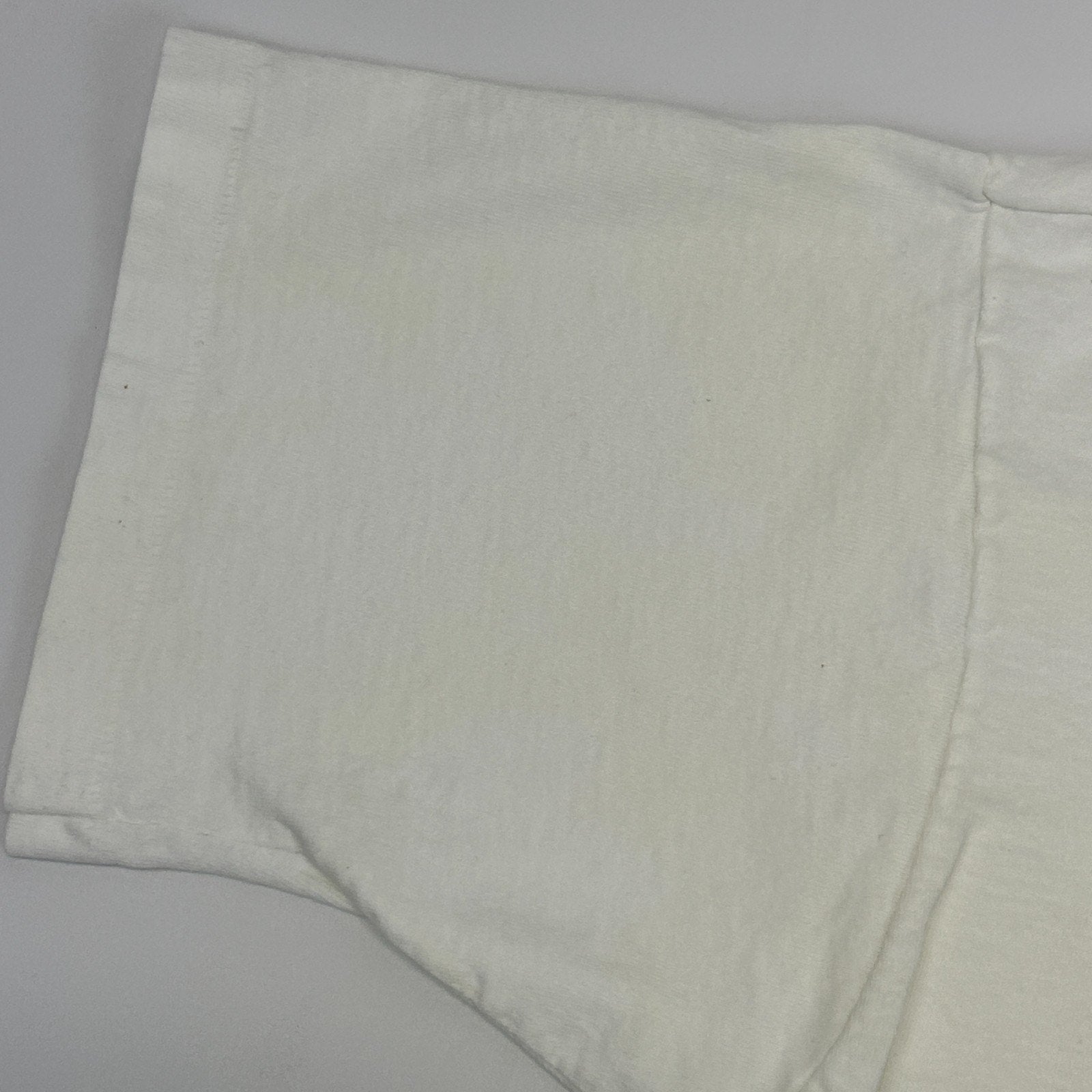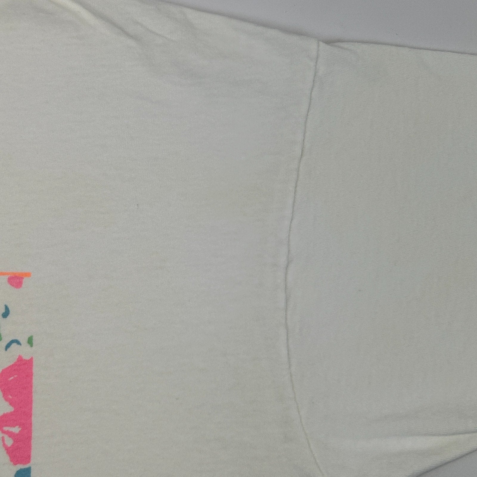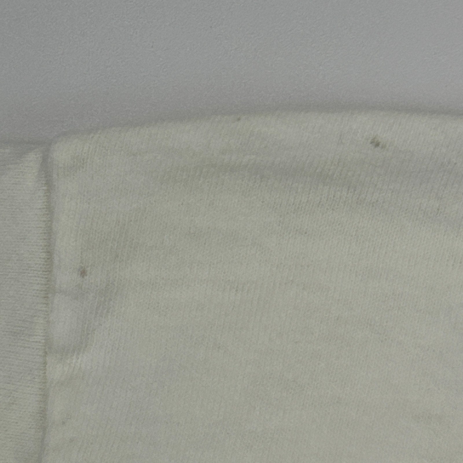 The bottom has been cut off into a crop top, has a pinhole on the collar, spots/discoloration, and light image cracking/fading. No other flaws noticed. See photos for details.
