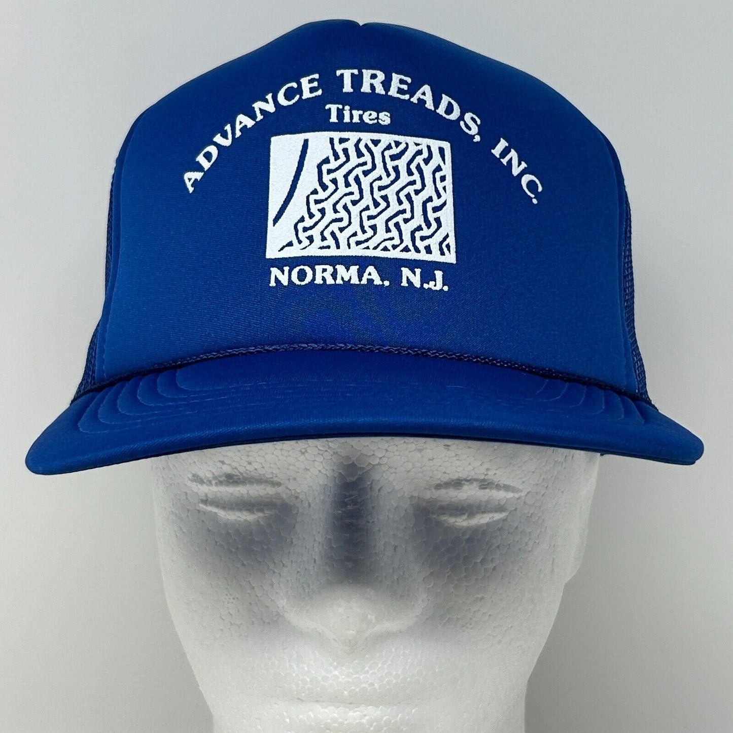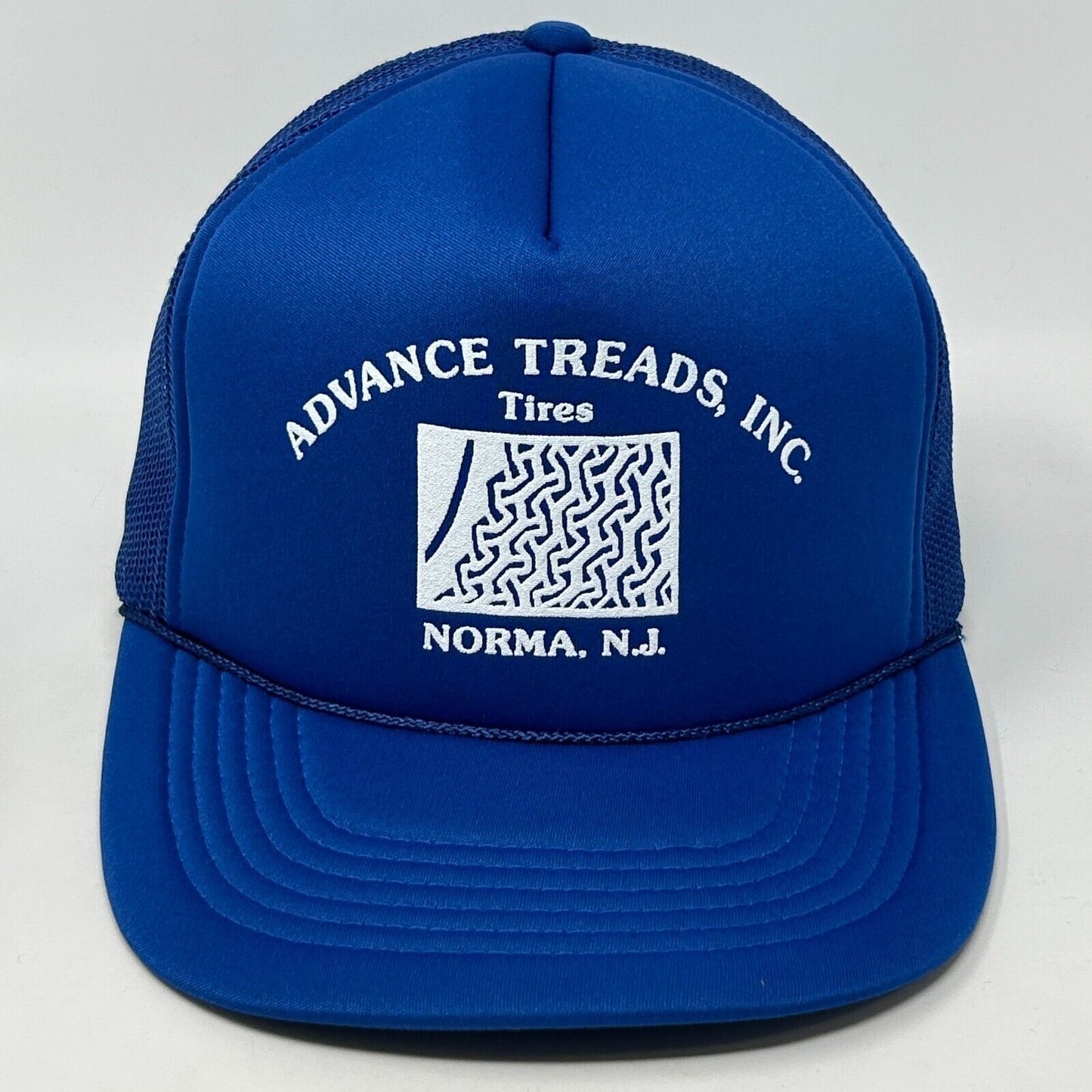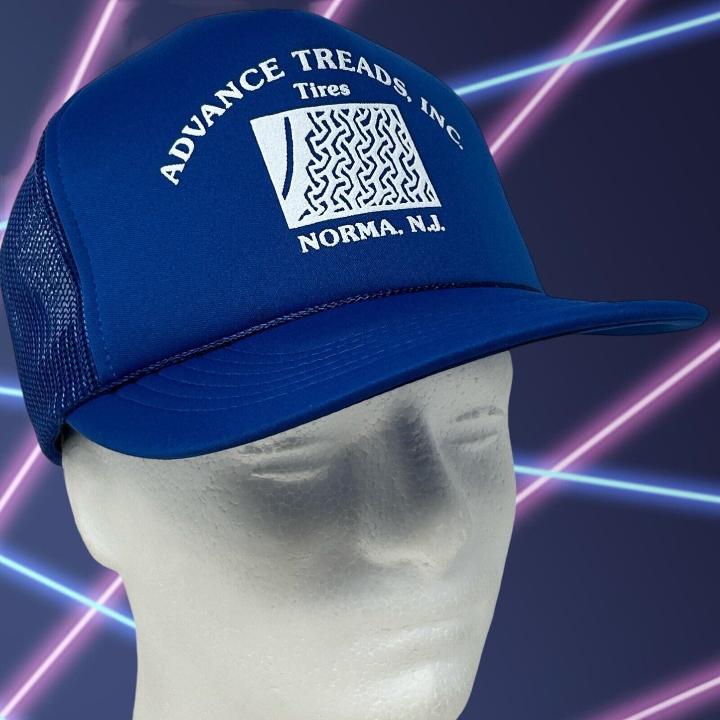 Gorra de béisbol estilo camionero de Advance Treads Inc. de los años 90 con neumáticos, de Norma, Nueva Jersey, de cinco paneles, con montura en A, de color azul