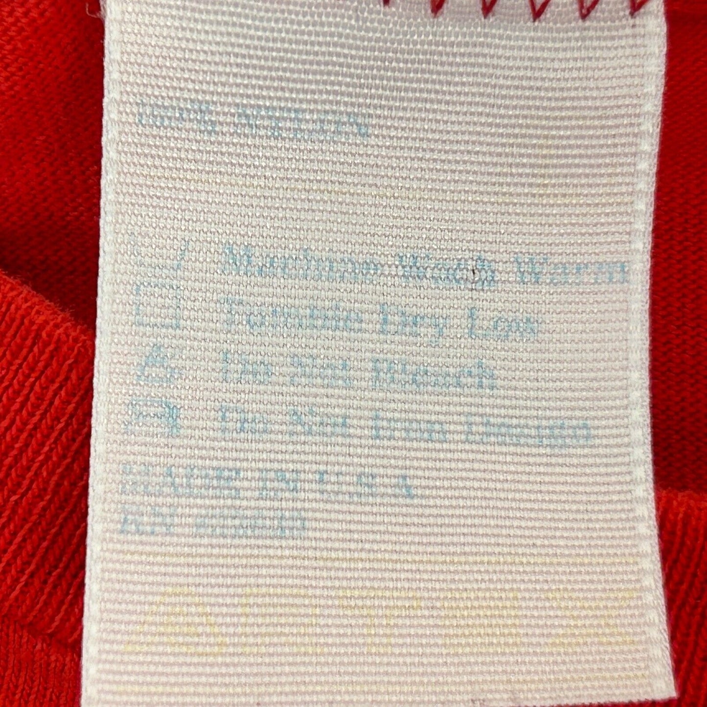 La imagen está descolorida, tiene agujeros en el cuello y algunas costuras están deshilachadas. No se notan otros defectos. Le falta la etiqueta, pero creo que mide como una talla grande. Verifique las medidas para asegurarse de que le quede bien. Se lavó y está lista para usar. Vea las fotos.