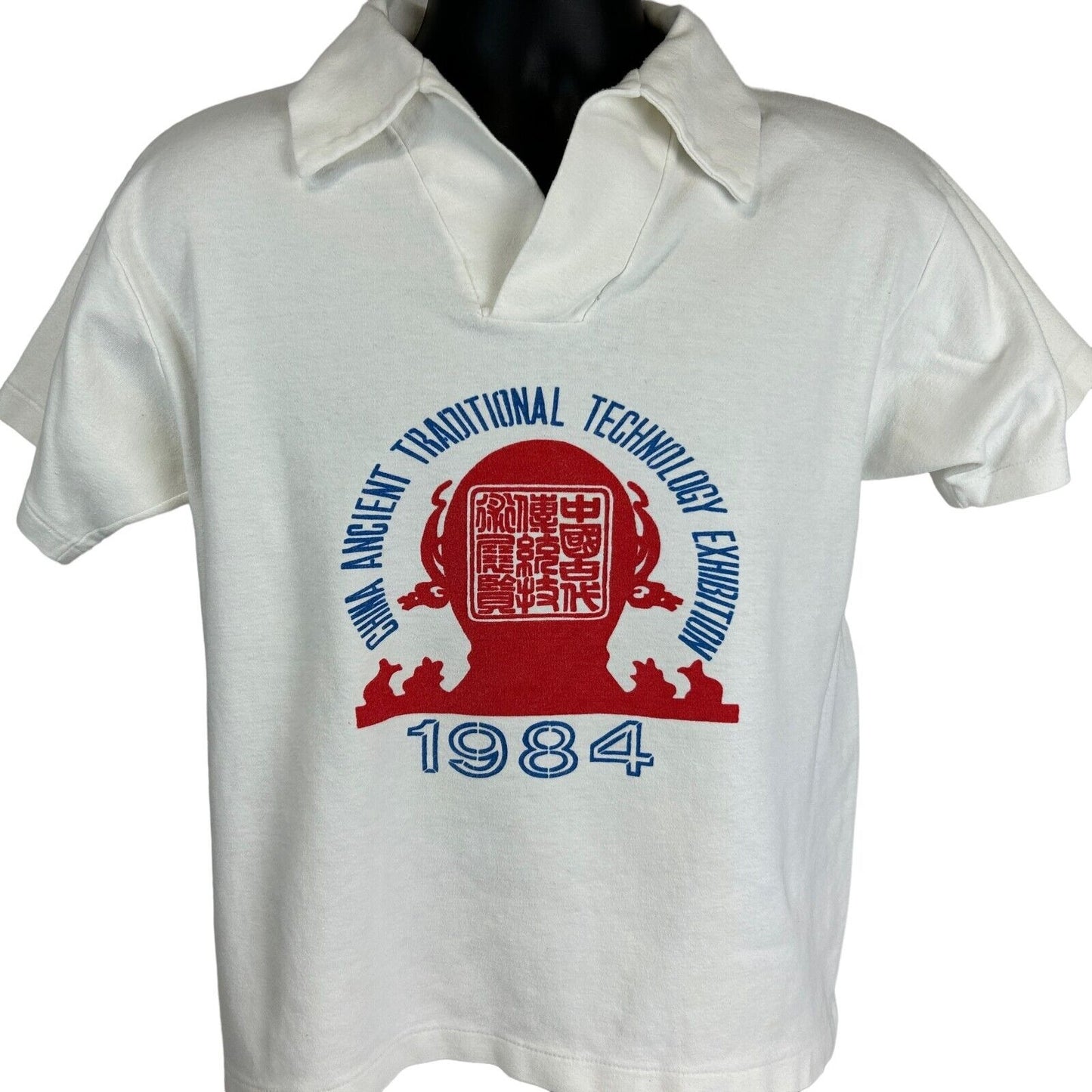 Vintage 80s 1984 China Ancient Traditional Technology Exhibition Polo T Shirt Chinese White Short Sleeve Single Stitch Graphic Tee