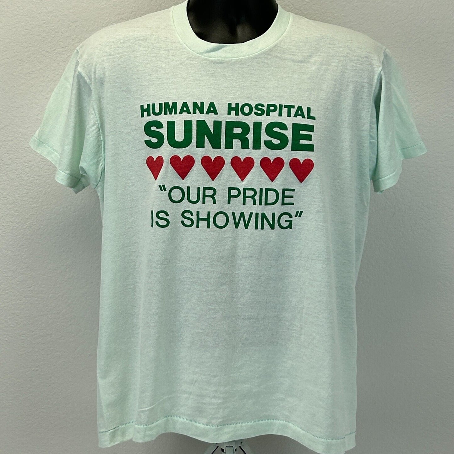 Vintage Humana Hospital Sunrise Our Pride Is Showing T Shirt Mens Large Medical Nurse Doctor 80s Green Single Stitch Graphic Tee