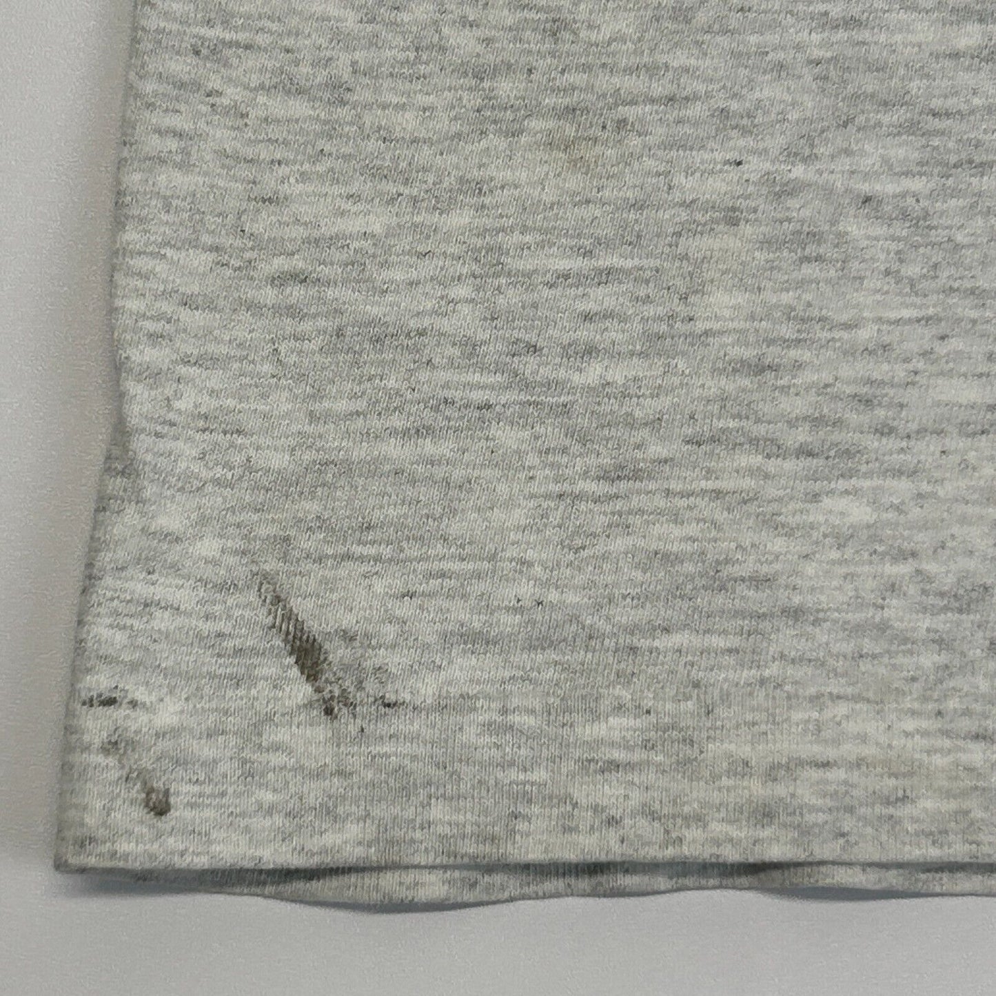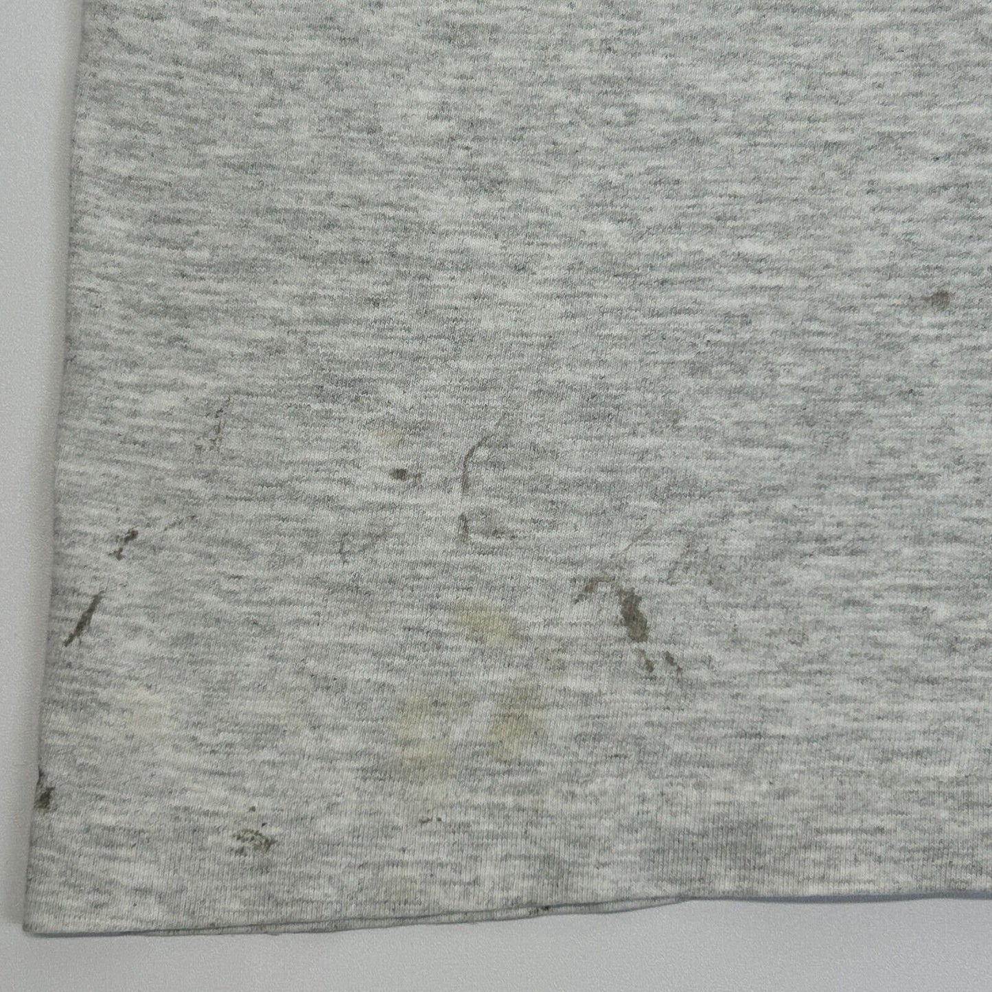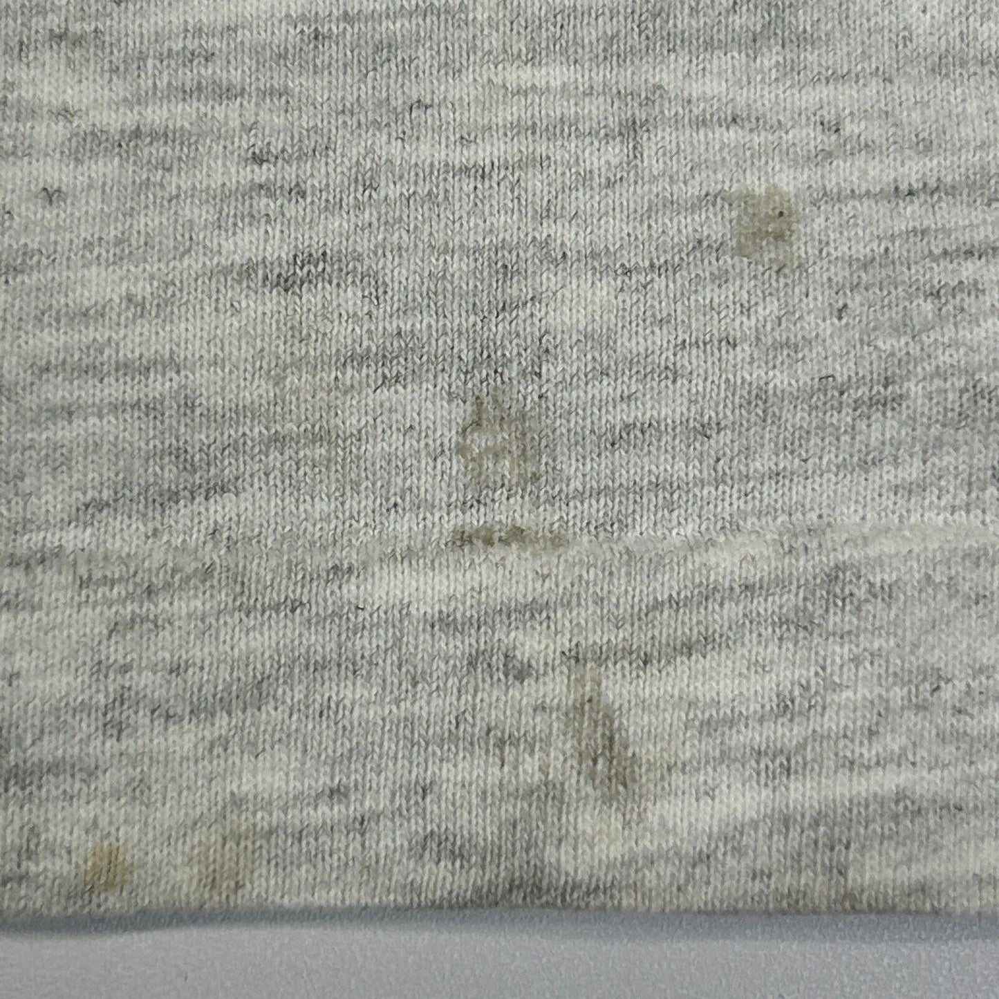 Graphic is on the back; blank front. Has image fading, some pink bled through, stains, a hole on the bottom front, and some tiny pinholes on the bottom front have been patched from the inside. The holes should not spread further and skin will not show through it. No other flaws noticed. See photos.