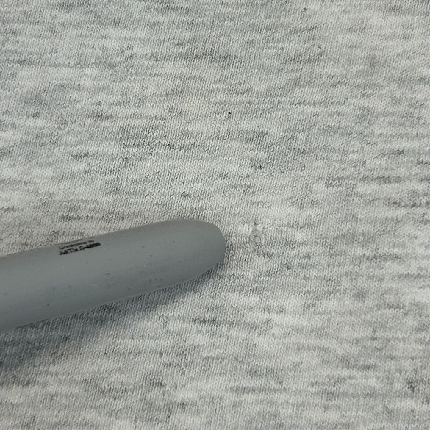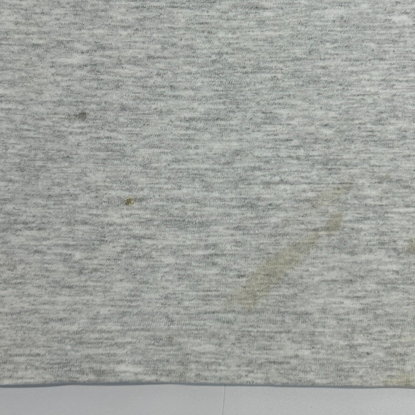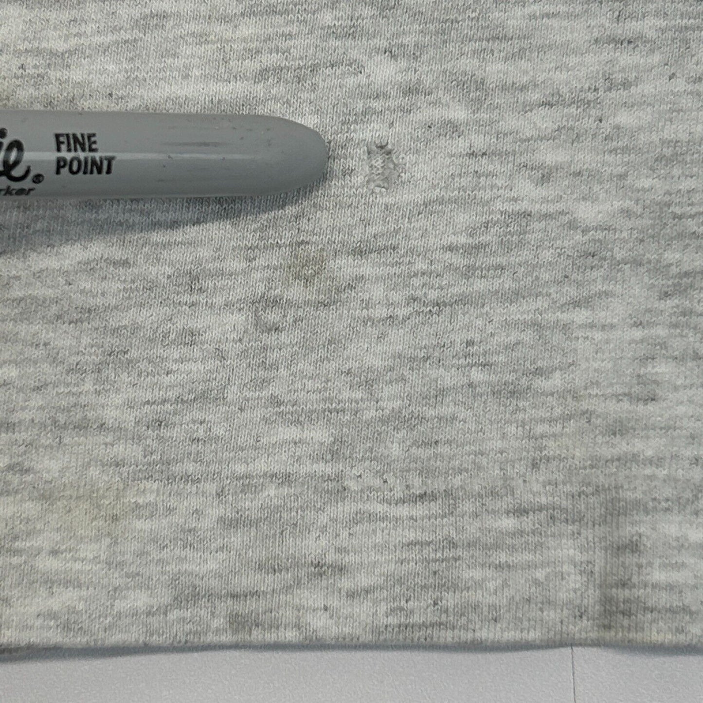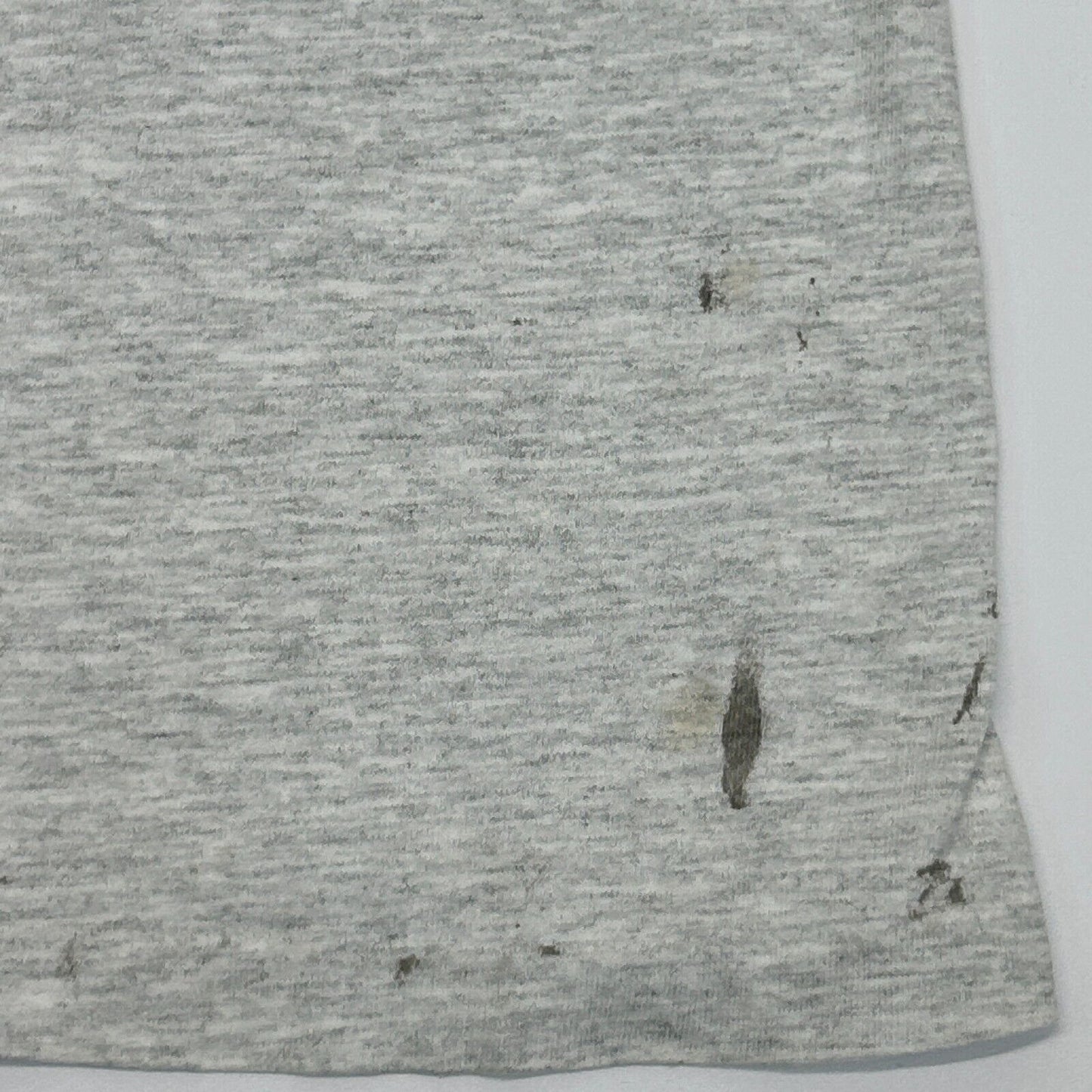 Graphic is on the back; blank front. Has image fading, some pink bled through, stains, a hole on the bottom front, and some tiny pinholes on the bottom front have been patched from the inside. The holes should not spread further and skin will not show through it. No other flaws noticed. See photos.