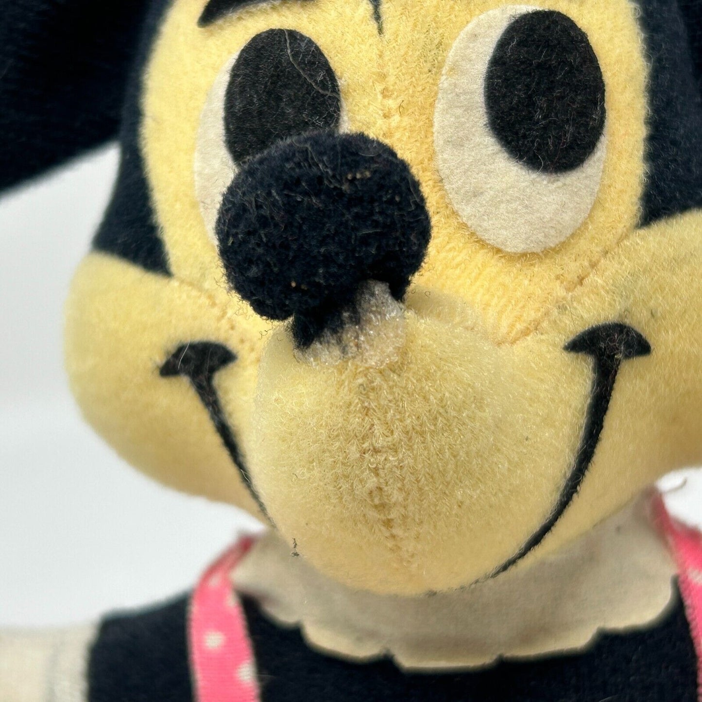 Has some spots, Mickey is missing his bowtie, Minnie's nose appears to have been glued back on, Minnie's dress has some fraying. No other flaws noticed. See photos.