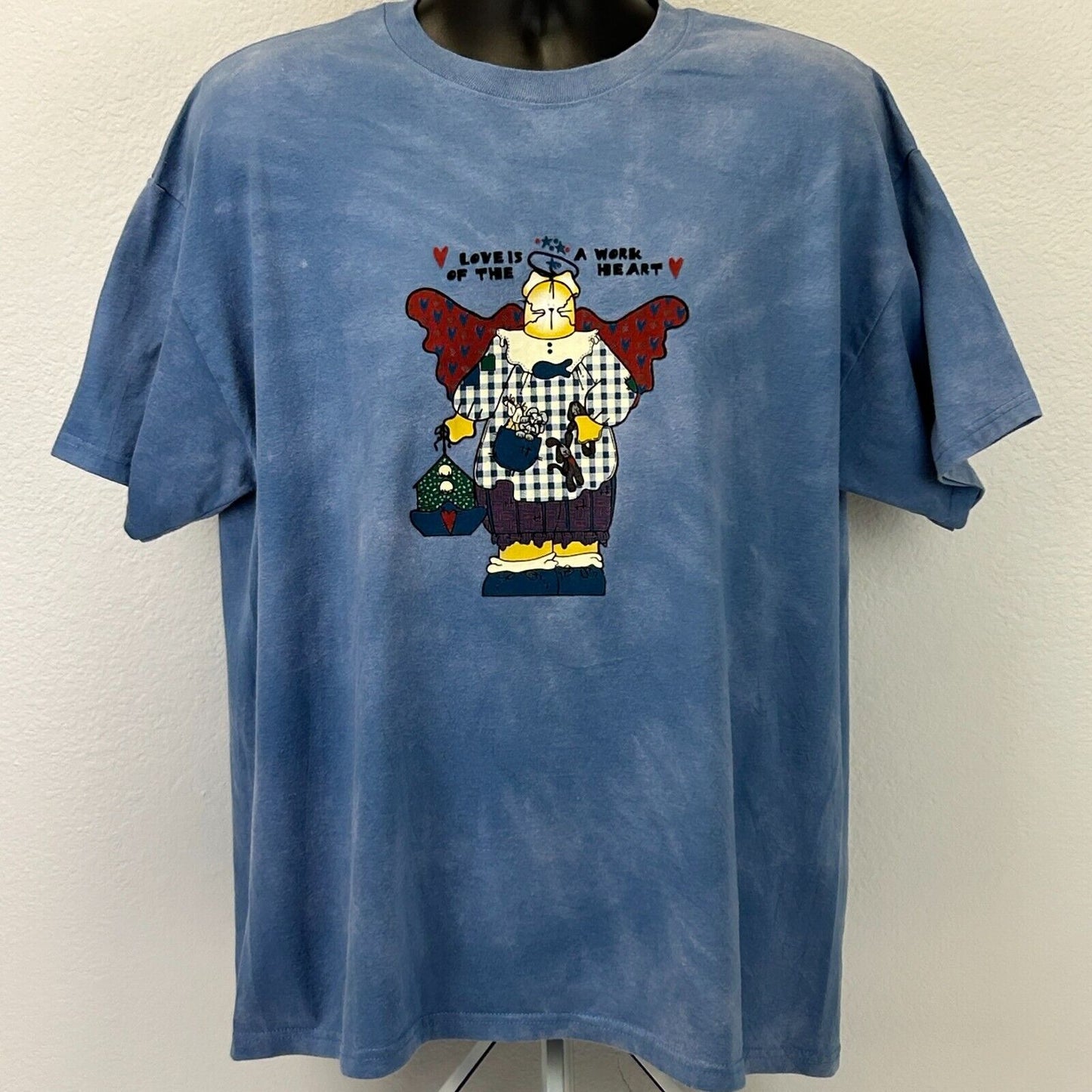 Vintage Love Is a Work of the Heart T Shirt Mens X-Large Cat Angel Religion Religious 90s Tie Dye Blue Hanes Graphic Tee