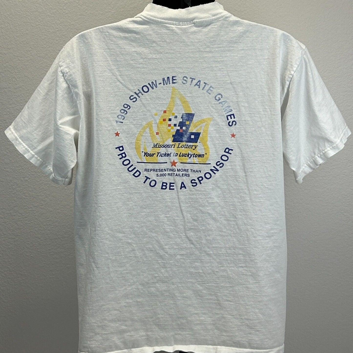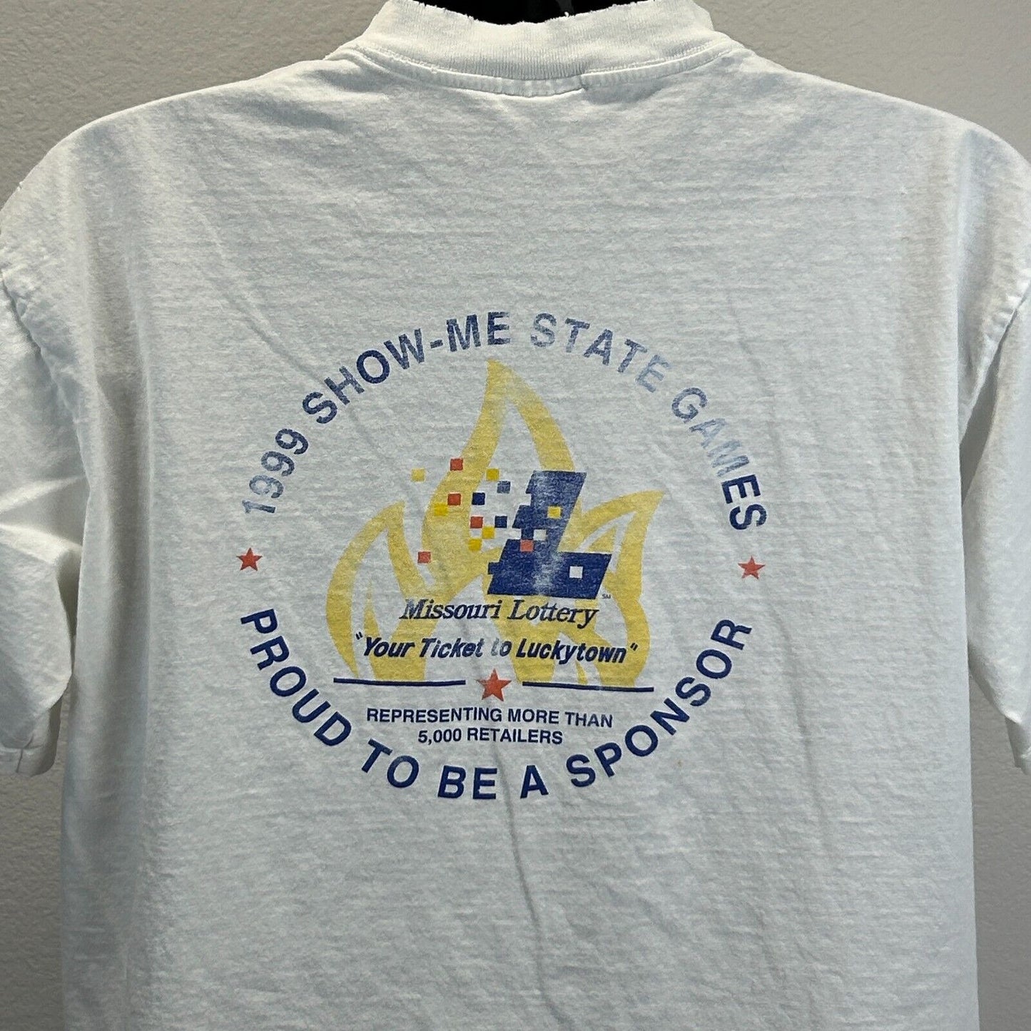 Vintage Missouri Show Me State Games T Shirt Mens X-Large 90s 1999 Sports Missouri Lottery White Single Stitch Made In USA Graphic Tee