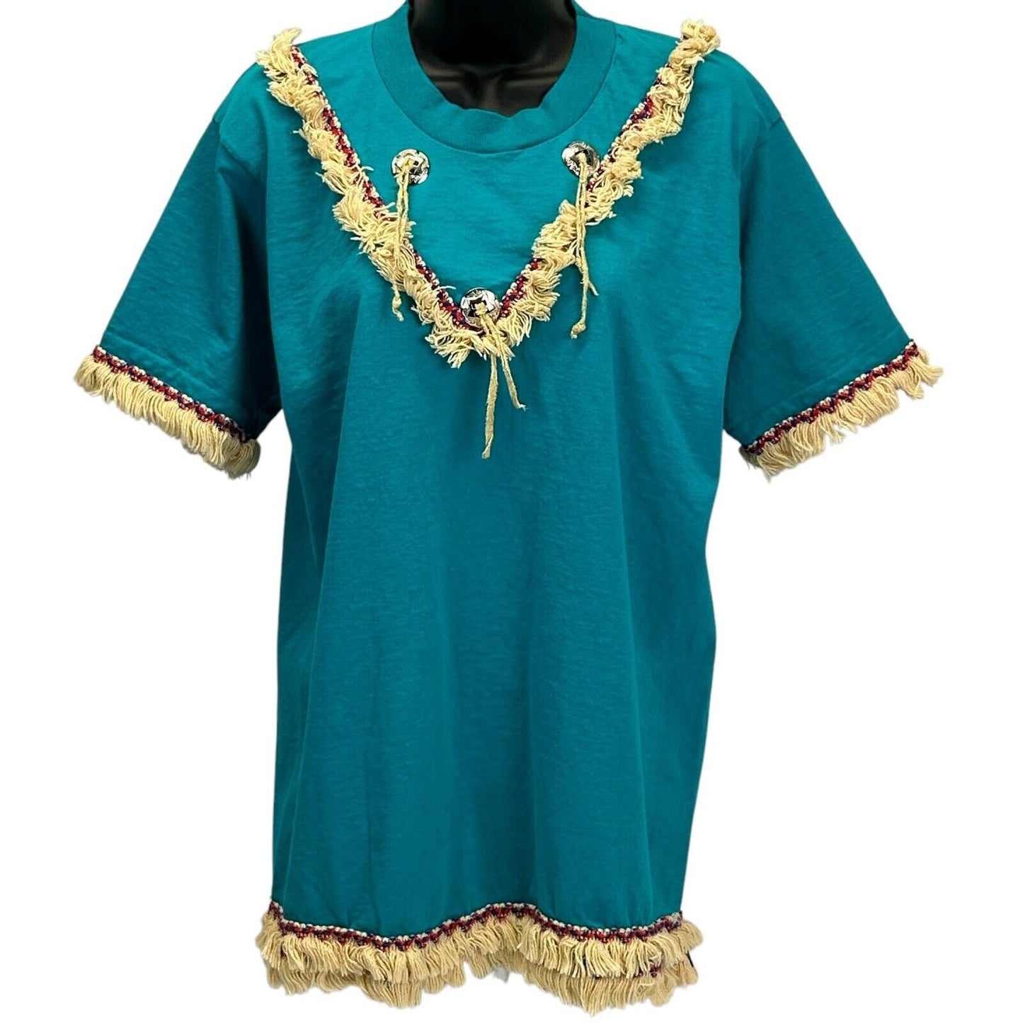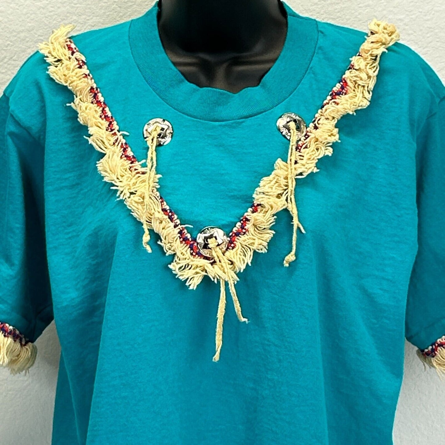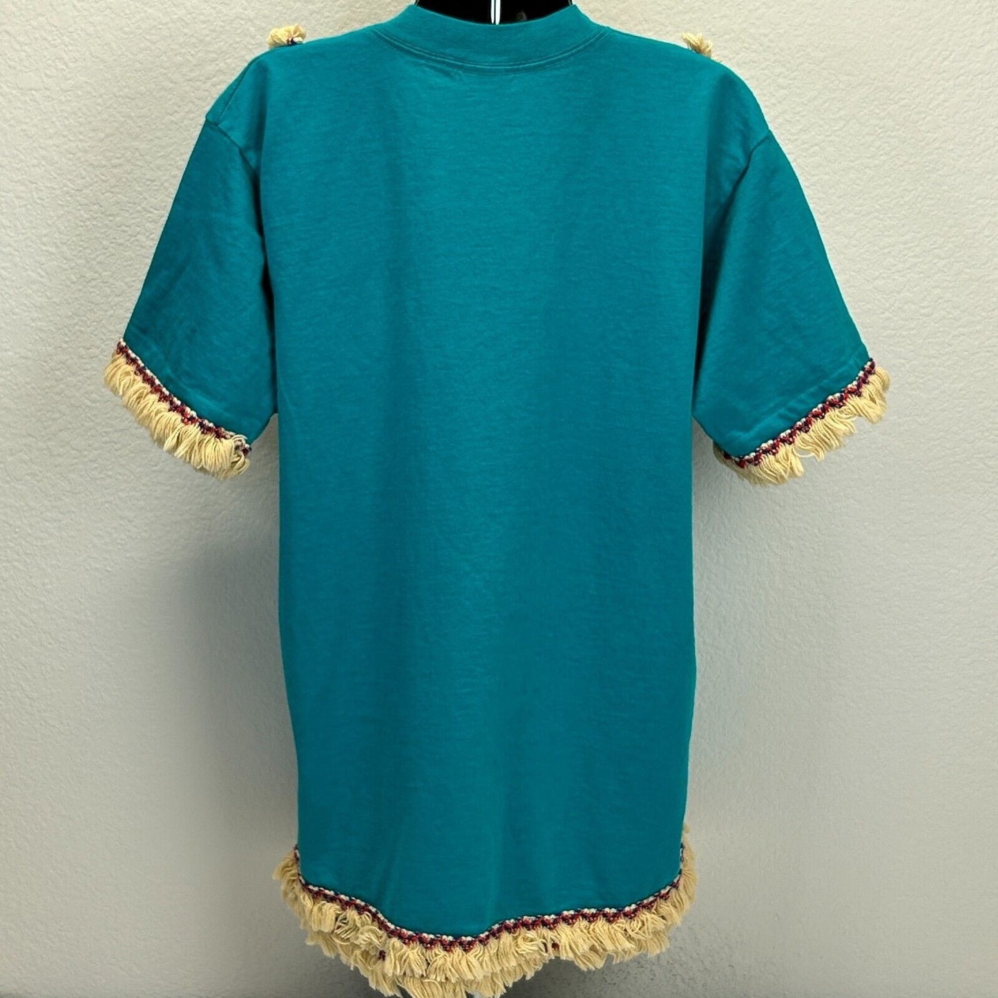 Vintage Native American Indian T Shirt Unisex Medium Conchos Fringe 90s Fruit of the Loom Green Single Stitch Made In USA Graphic Tee