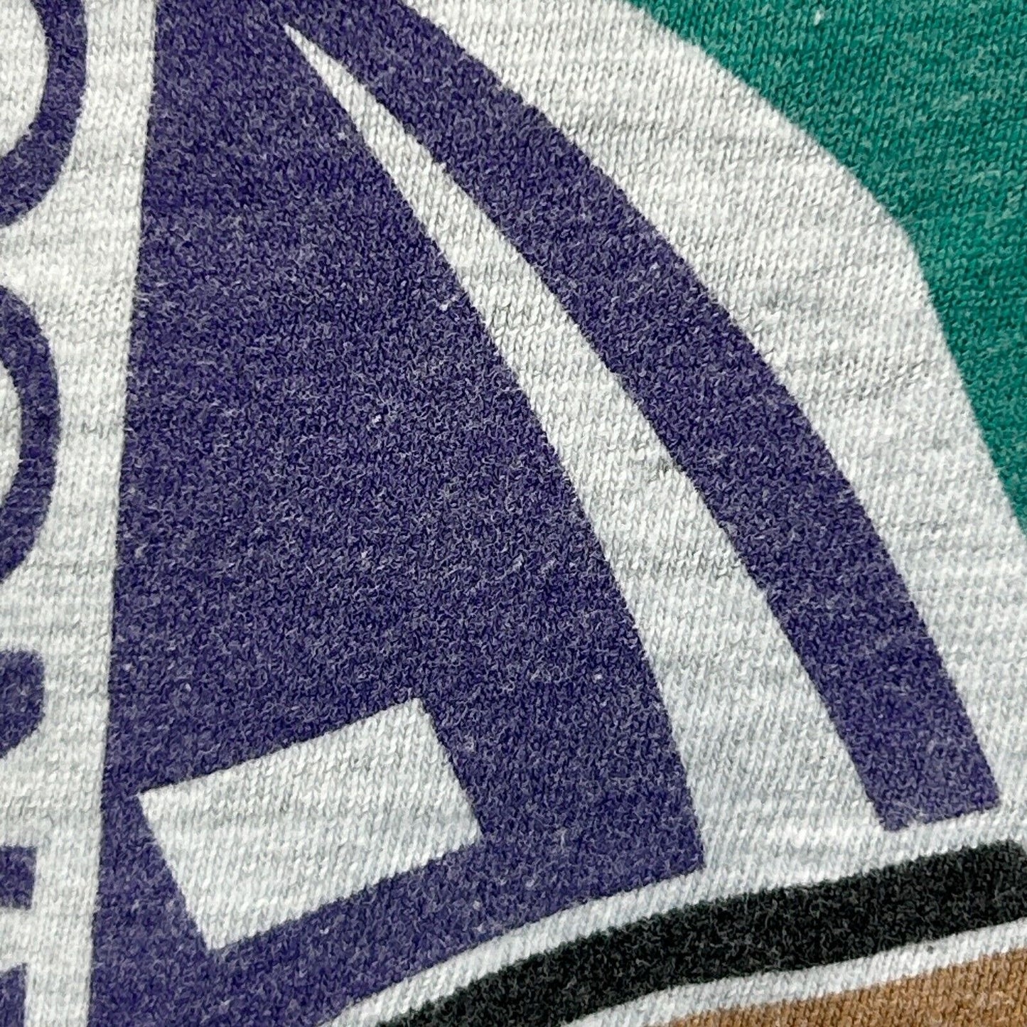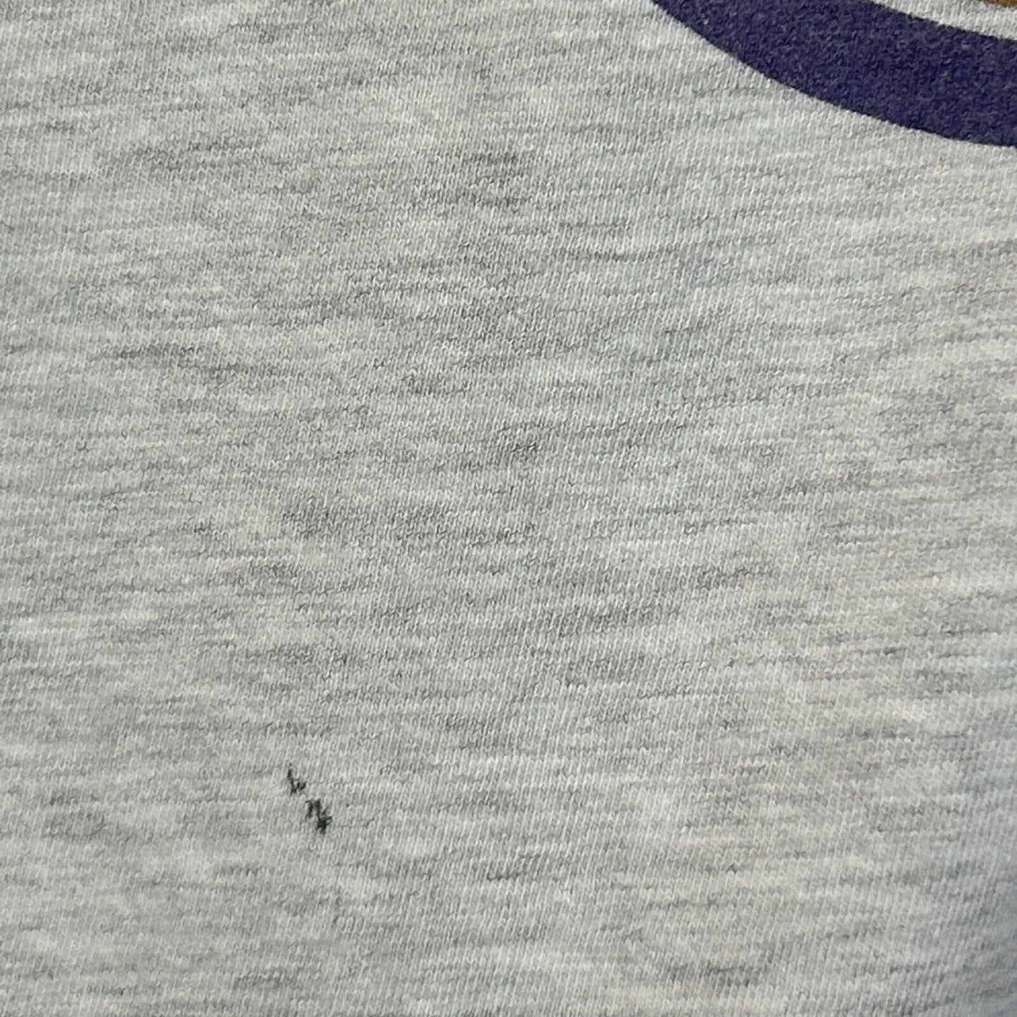 Has spots on the bottom front and image fading. No other flaws noticed. Tag is a Large but I feel it measures more similar to a modern Medium or a Short Large. Check measurements to ensure fit. See photos.