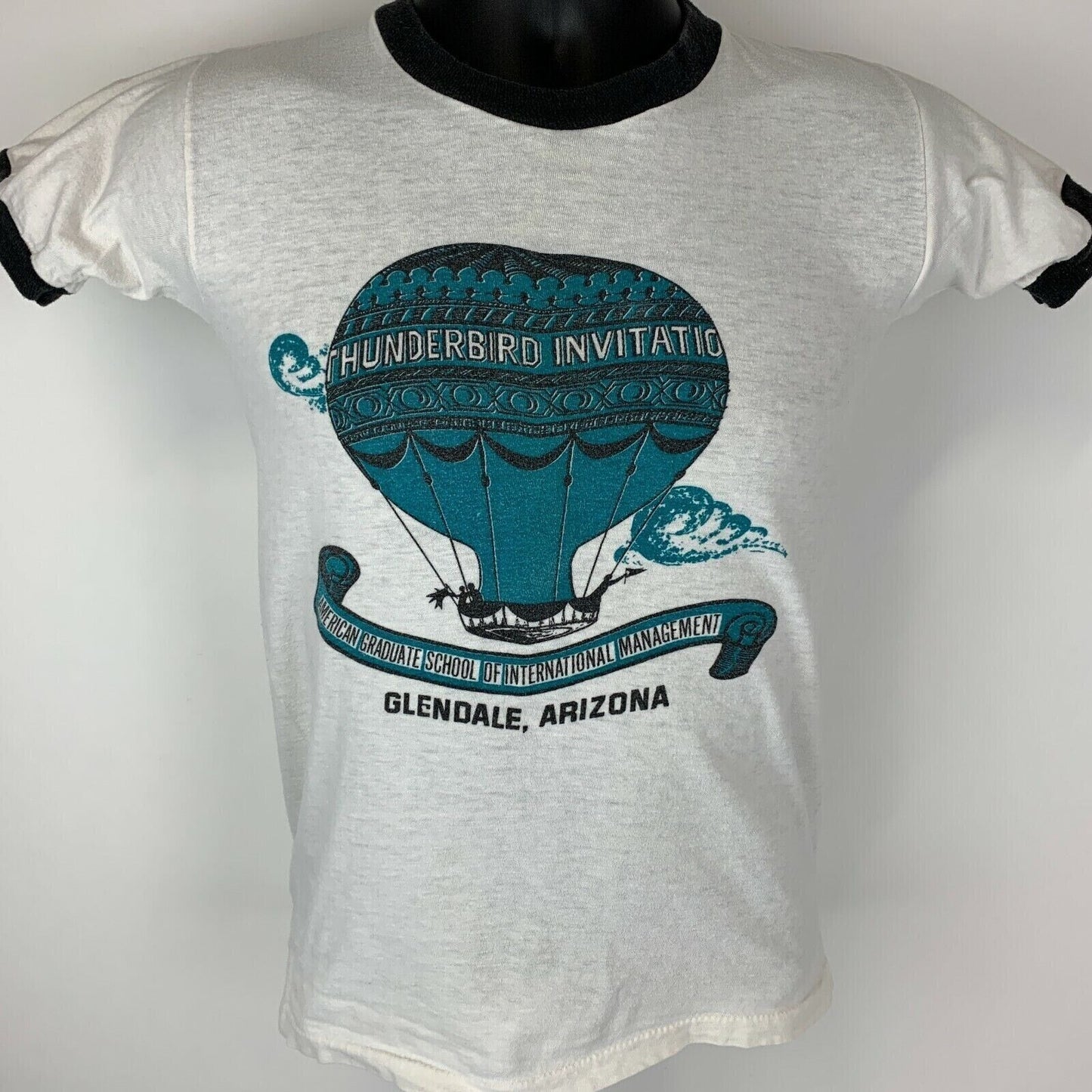 Vintage 1970s 1980s Thunderbird Invitational Hot Air Balloon Race Ringer T Shirt Glendale Arizona American Graduate School of International Management White Artex Single Stitch Graphic Tee