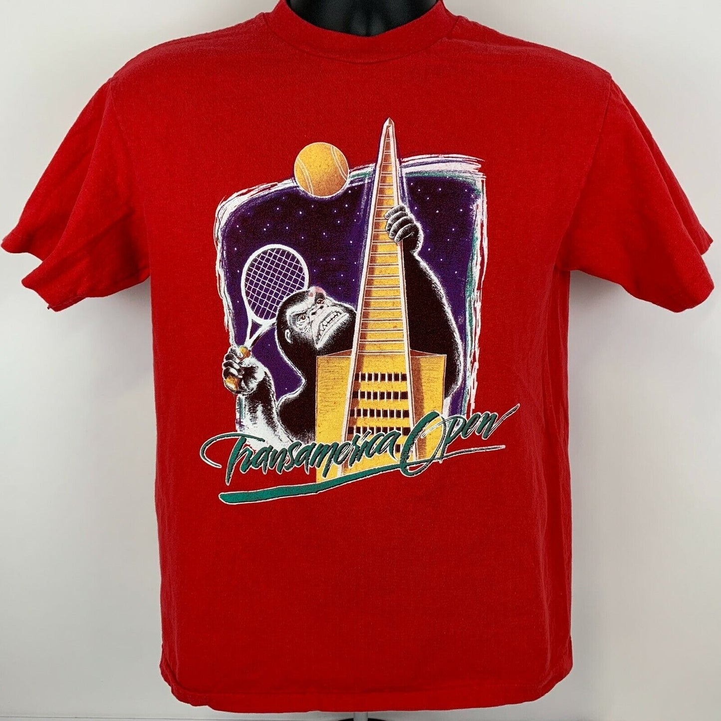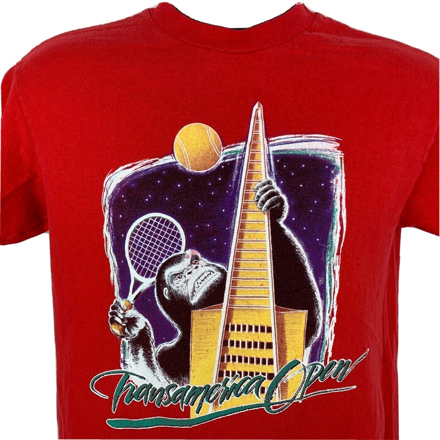 Vintage 1980s Transamerica Tennis Open T Shirt San Francisco California Pacific Coast Championships Transamerica Pyramid King Kong Gorilla Red Hanes Single Stitch Made In USA Graphic Tee