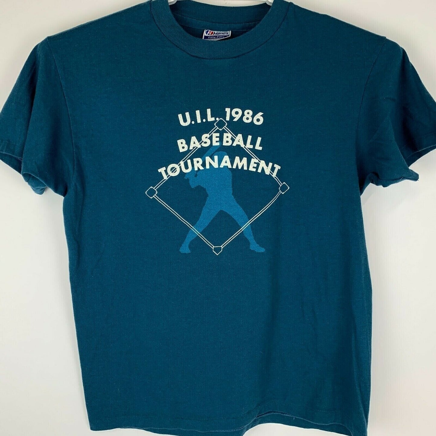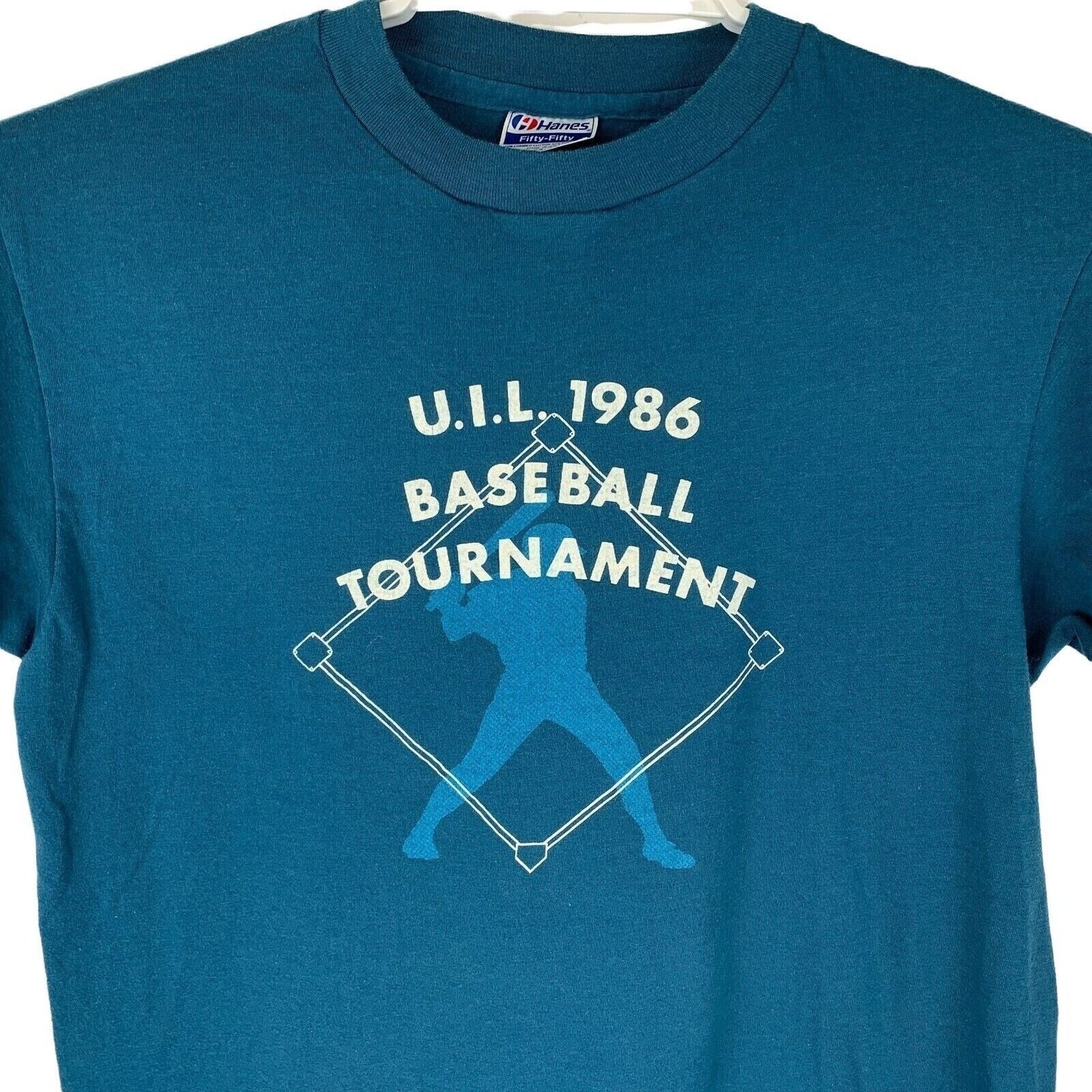 Camiseta vintage de la UIL de los años 1980, torneo de béisbol de la UIL de 1986, liga interescolar universitaria, camiseta gráfica de Hanes de puntada simple, azul de Texas, fabricada en EE. UU.