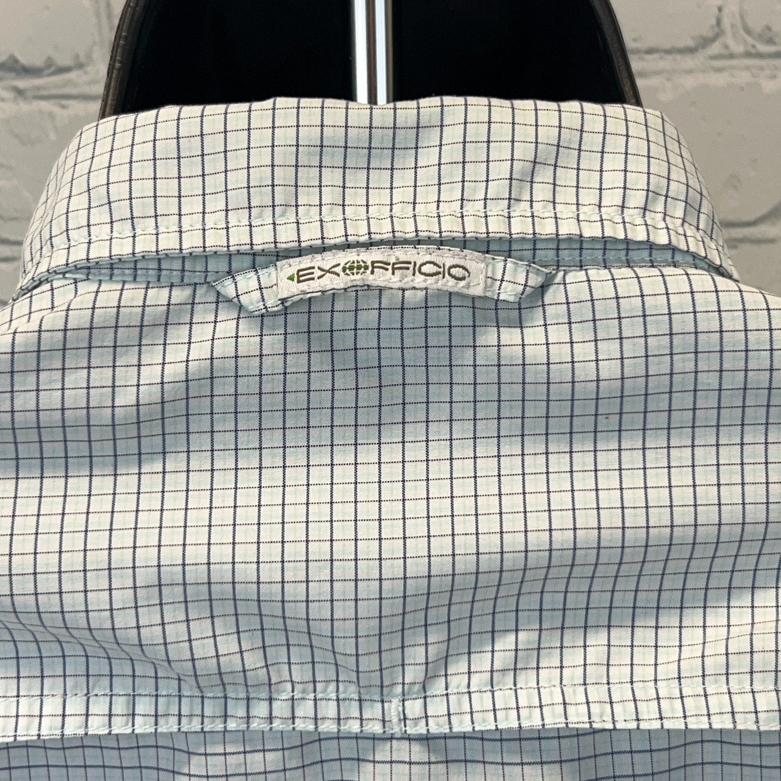 ExOfficio Button Front Shirt Hiking Hiker Fishing Fisherman Backpacking Backpacker Roll Tab Sleeves Pockets Vented Button Up Button Down Blue Check Womens S Small
