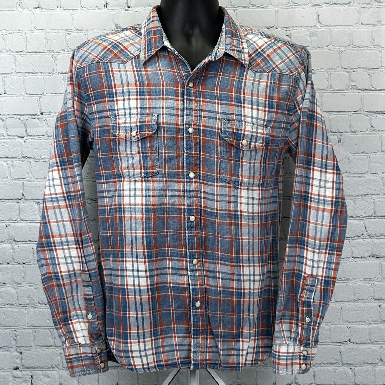 Lucky Brand Pearl Snap Classic Fit Button Front Shirt Cowboy Western Grunge Plaid True Indigo Long Sleeve Button Up Button Down Blue Mens M Medium