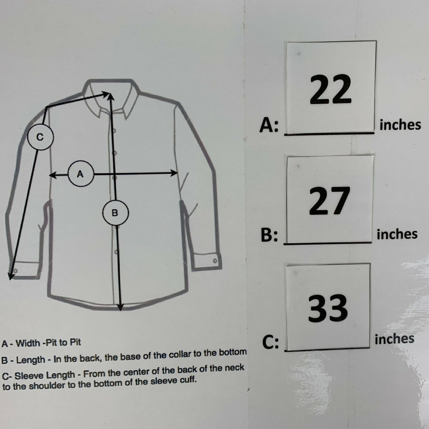 Sleeve Length 33" - From the center of the back of the neck to the shoulder to the bottom of the sleeve