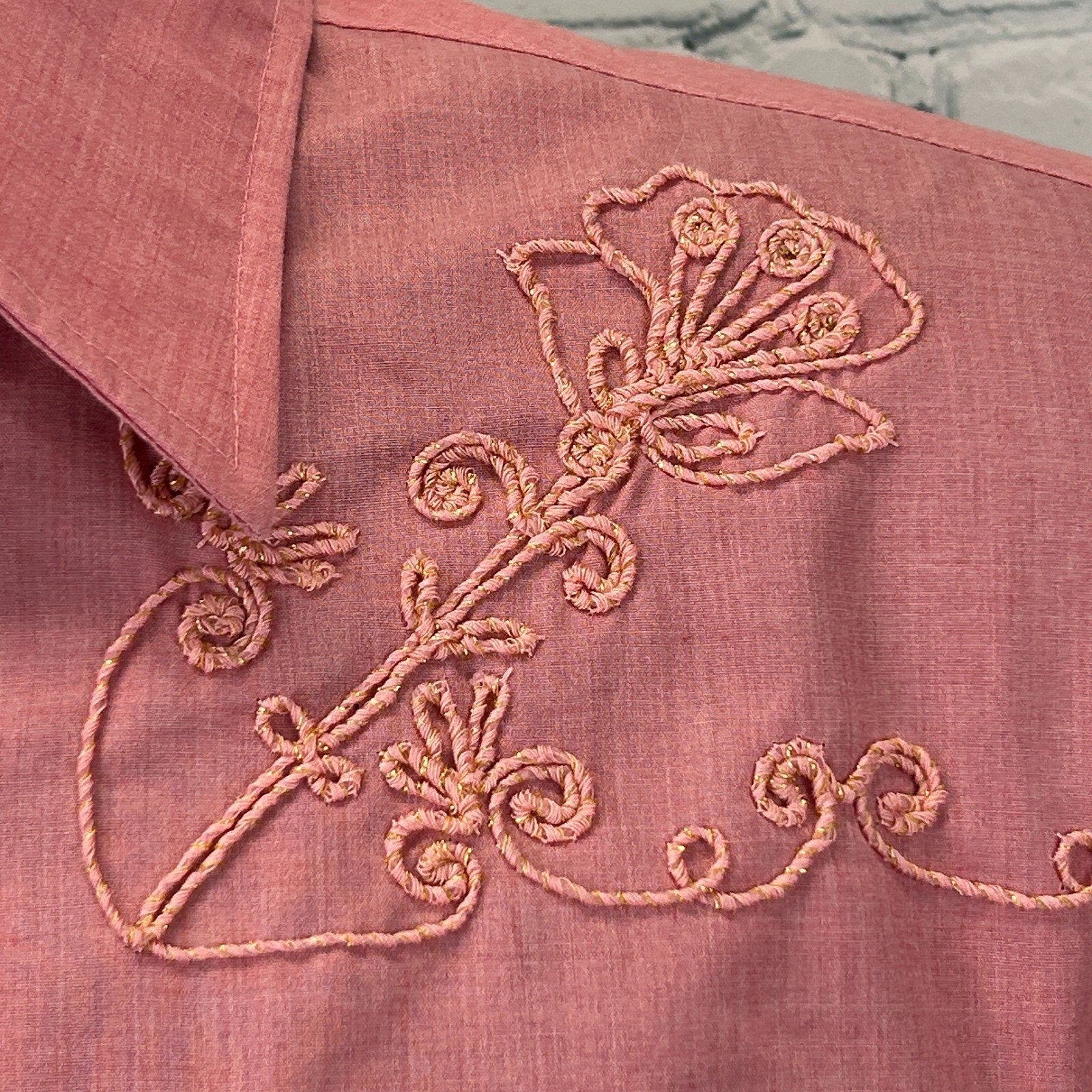 Vintage 70s Champion Westerns Pearl Snap Button Front Shirt Cowboy Rockabilly Embroidered Flowers Pockets Button Up Button Down Pink M Medium