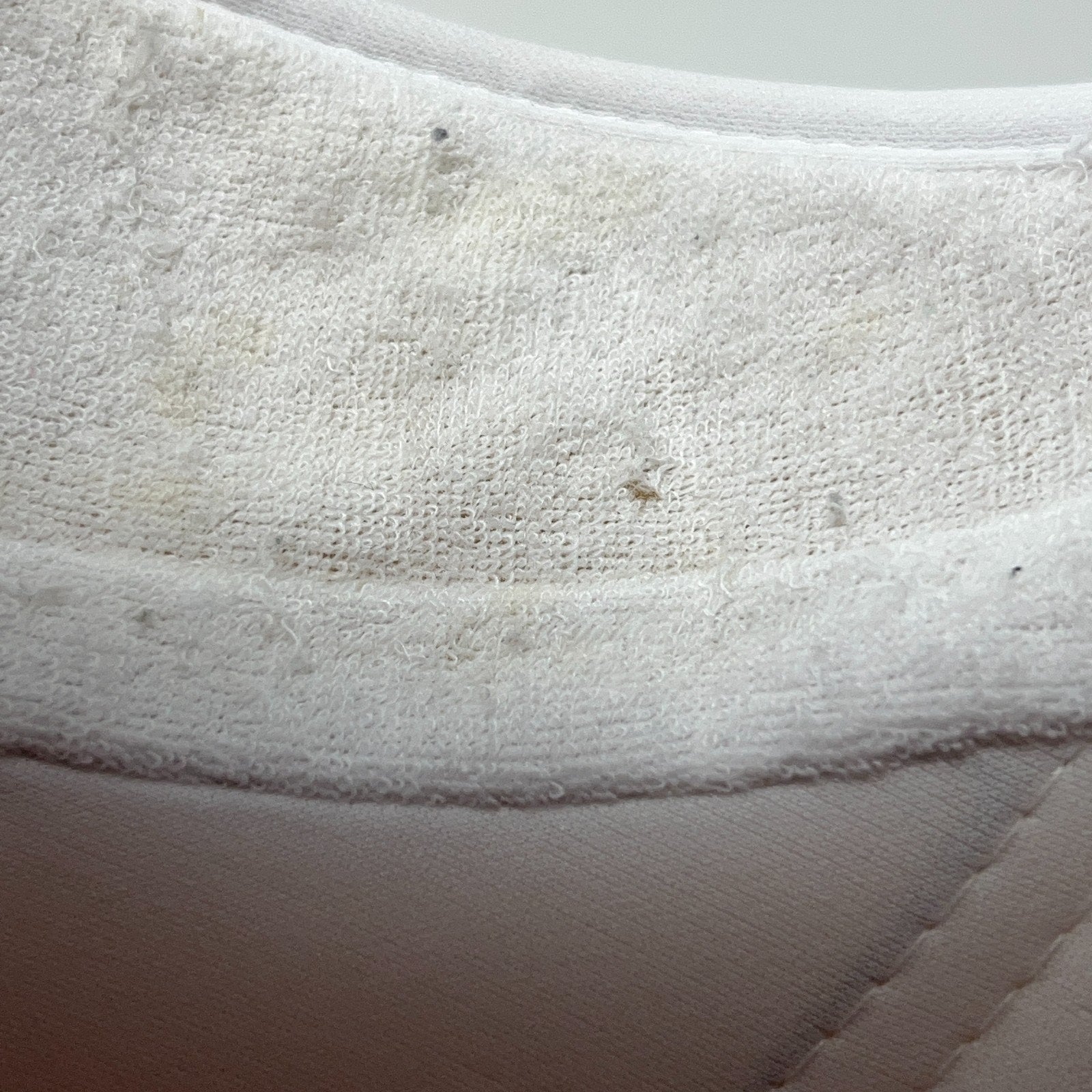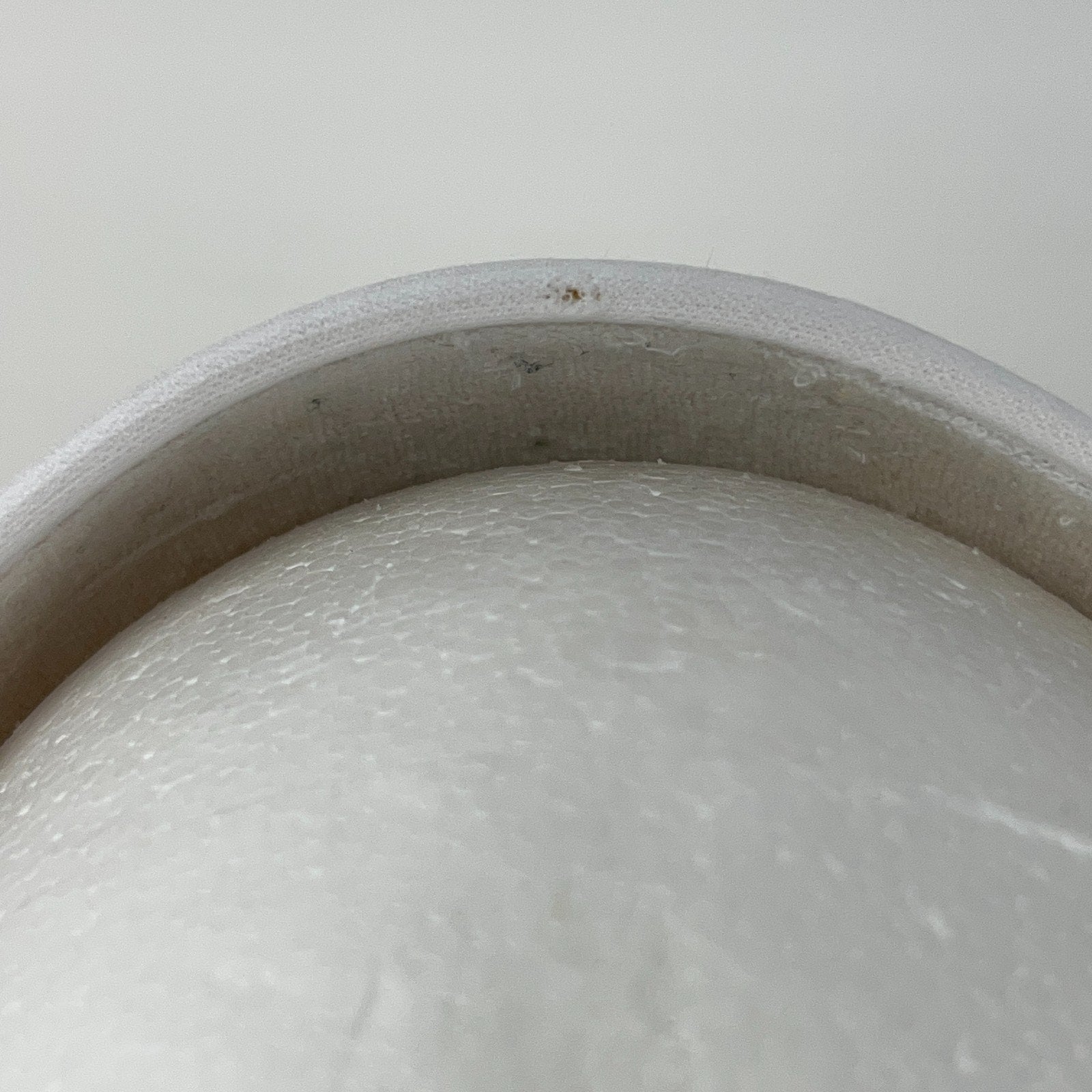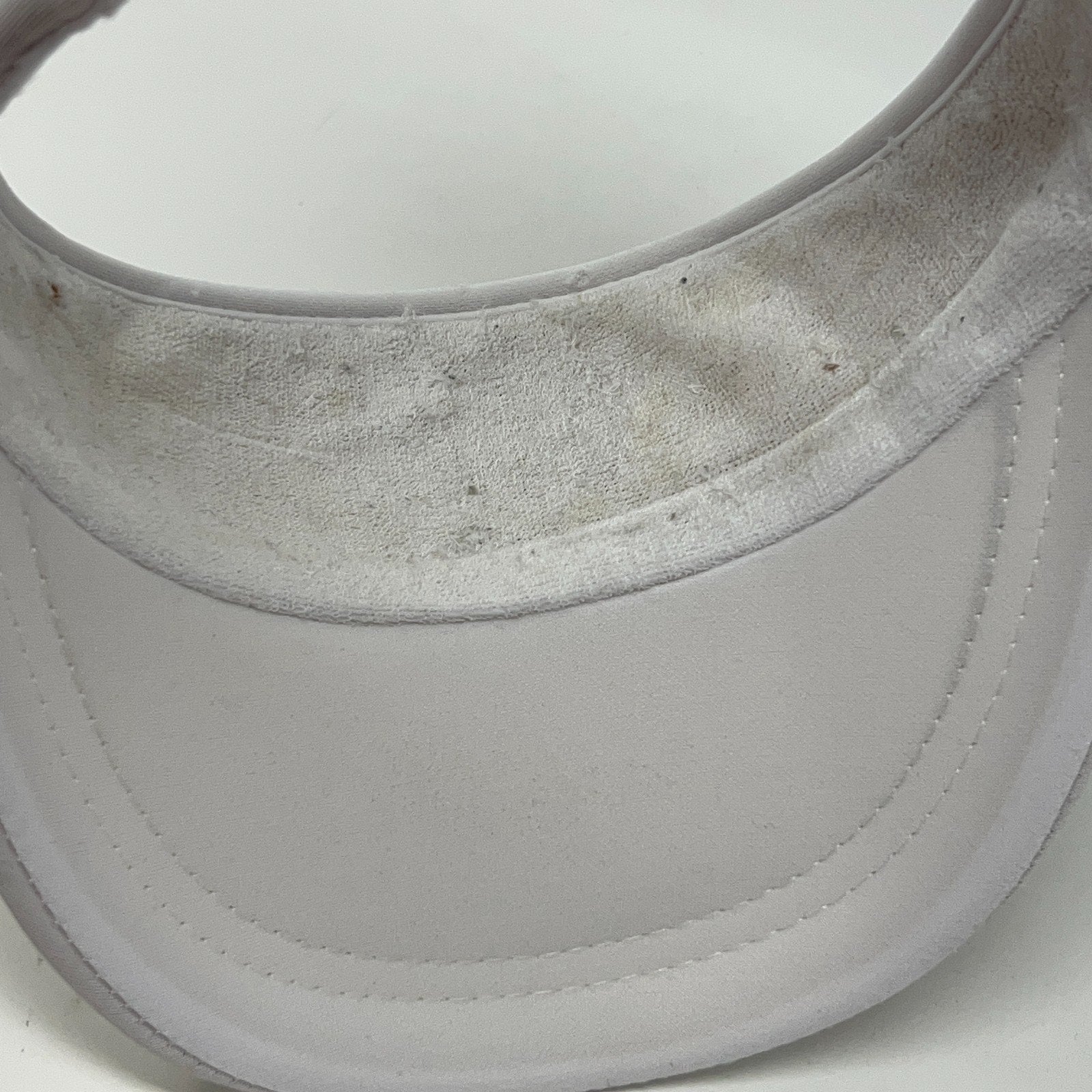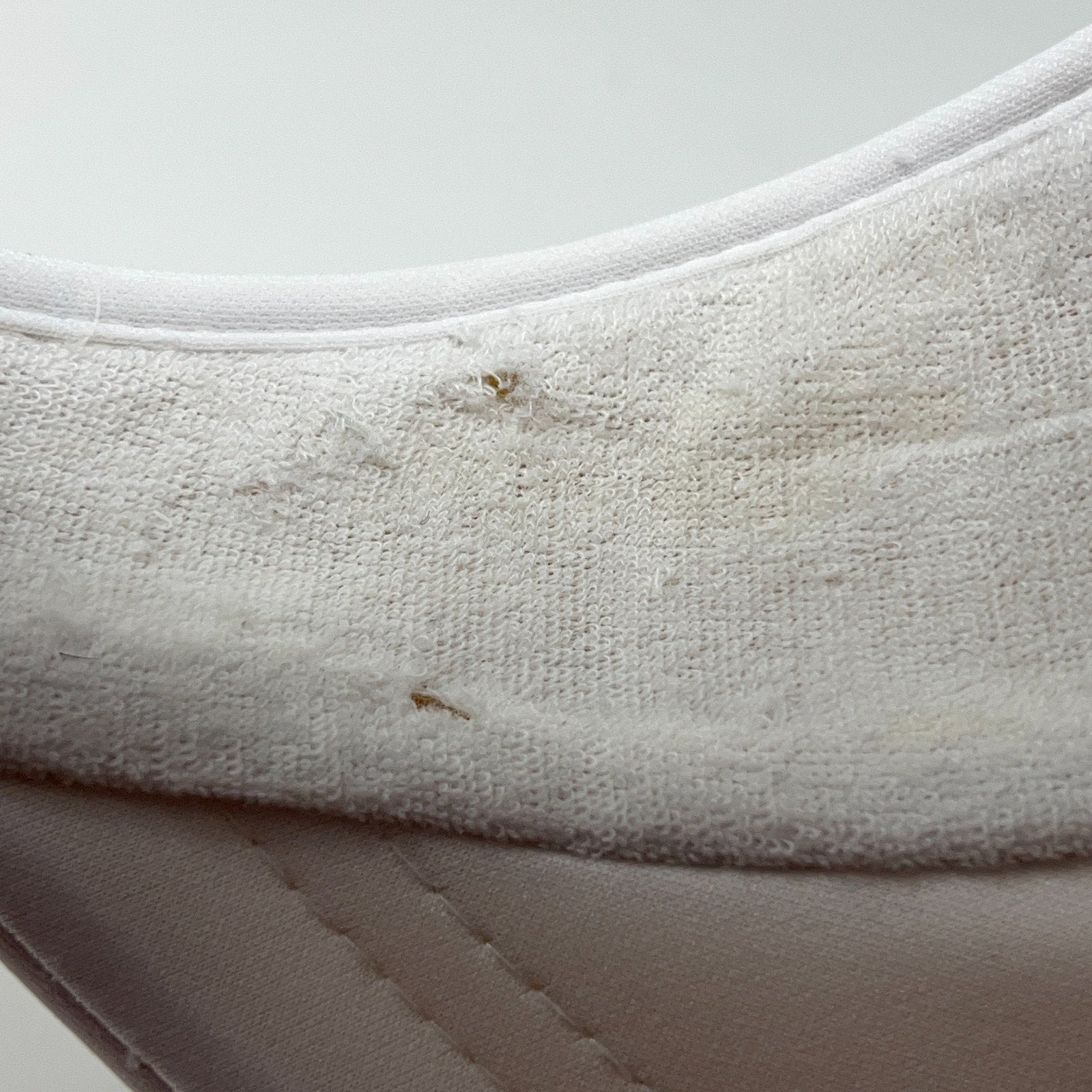 Has some small holes in the terrycloth sweatband and one on the tip. No other flaws noticed. Has been cleaned and sanitized. See photos for details.