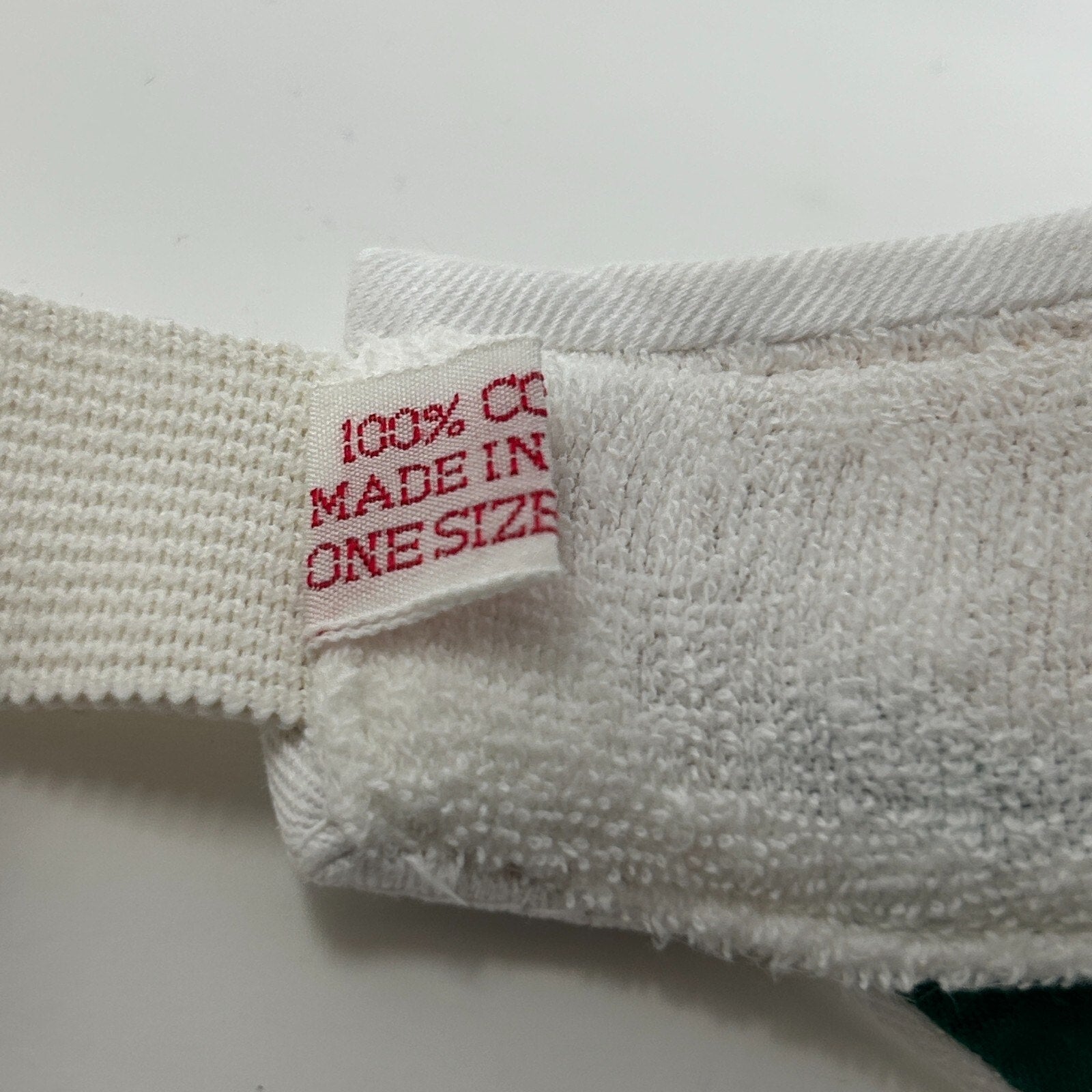 Has a thin spot in the elastic strap and a small faint spot. No other flaws noticed. Has been cleaned and sanitized. See photos.