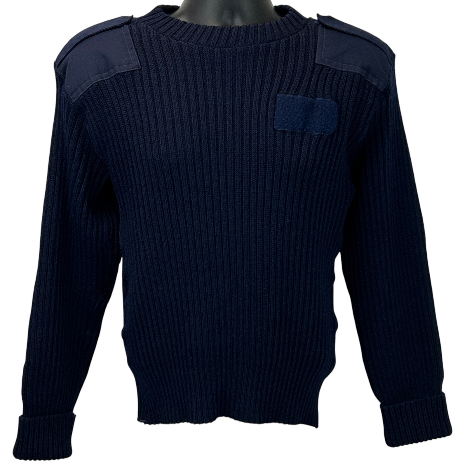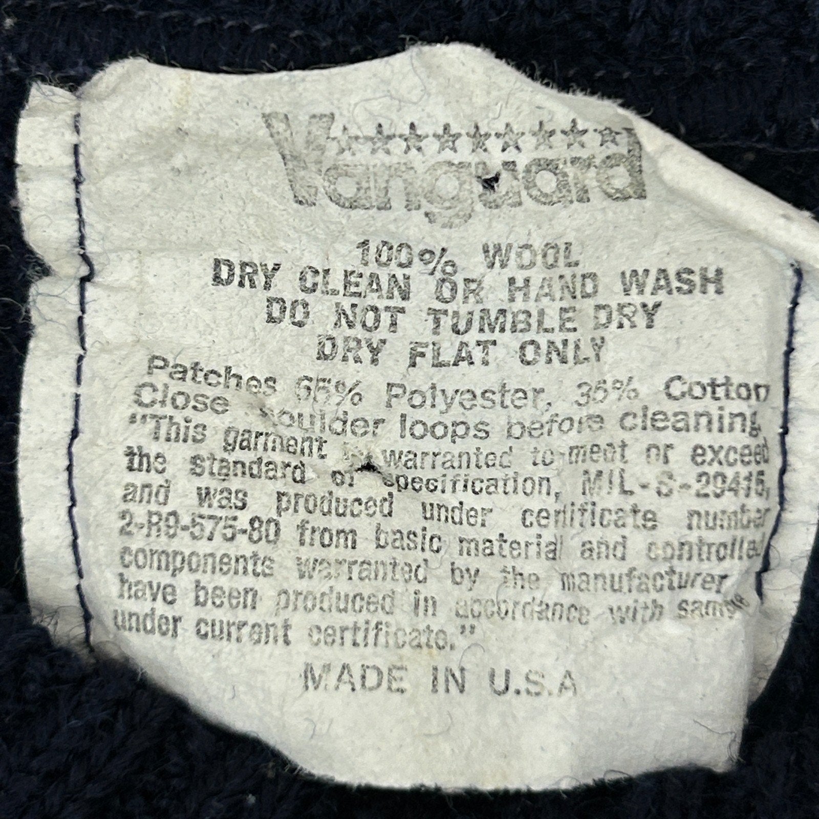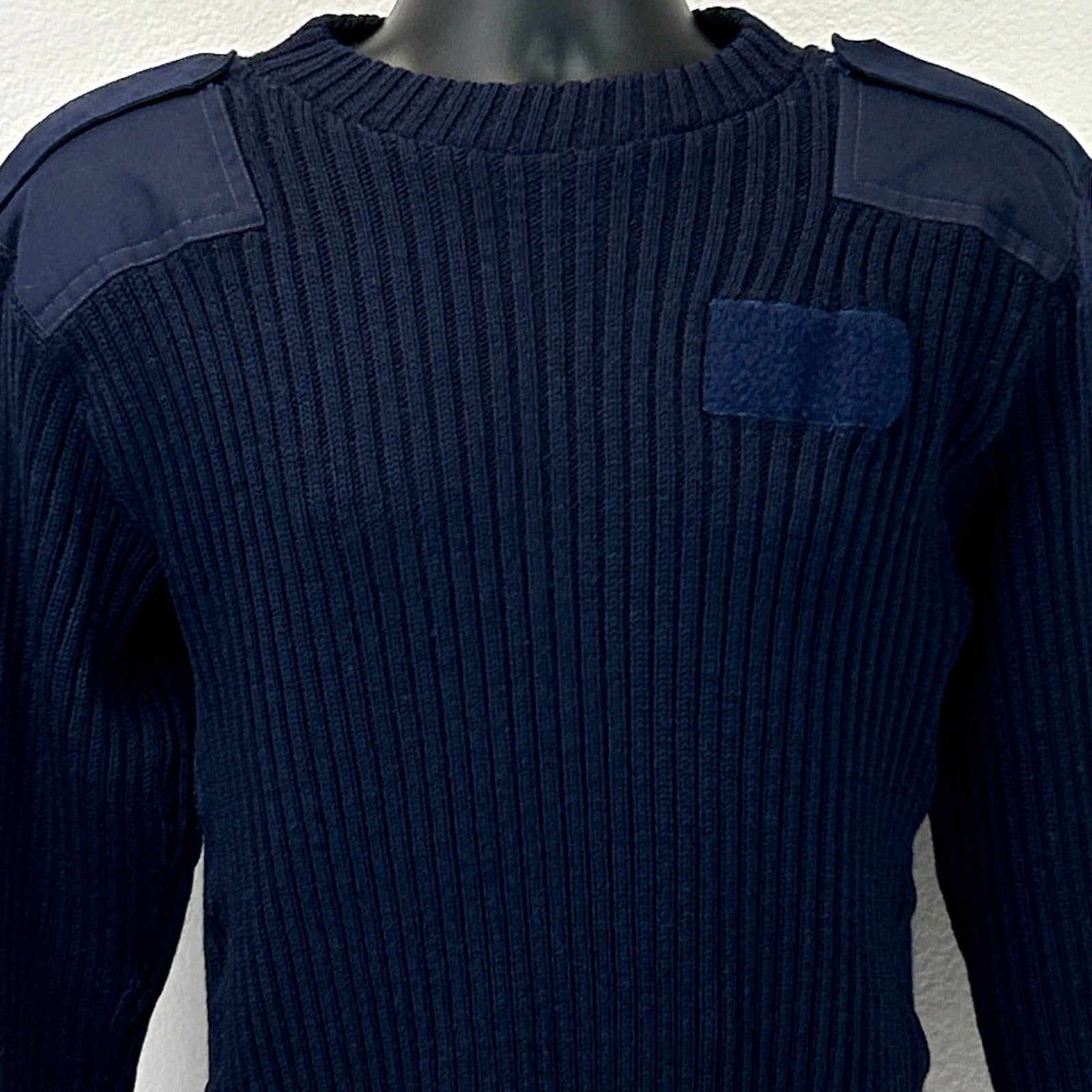 Vintage 80s Wool Military Sweater Tactical USN Police Epaulettes Elbow Patches Ribbed Navy Blue Made in USA MIL-S-29415