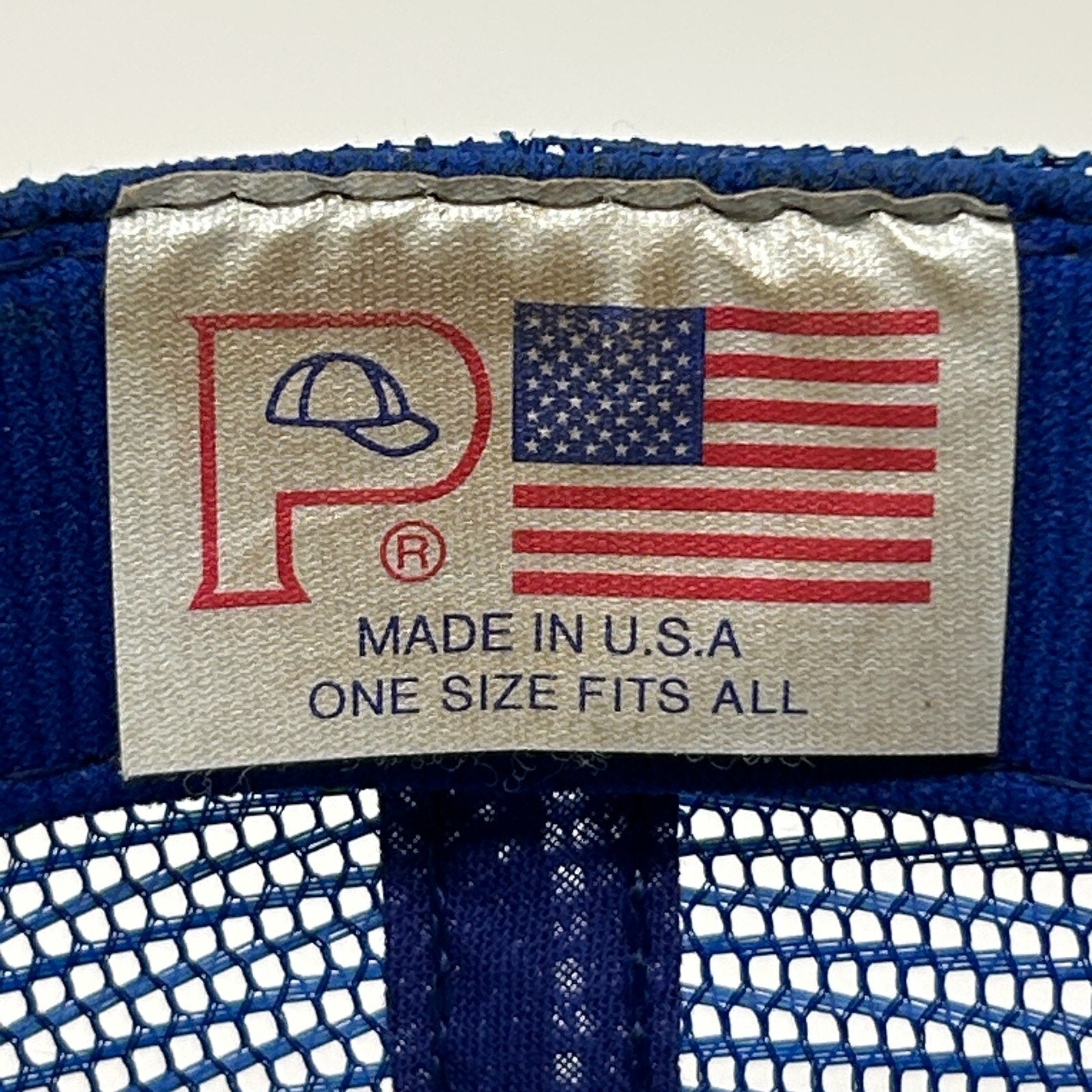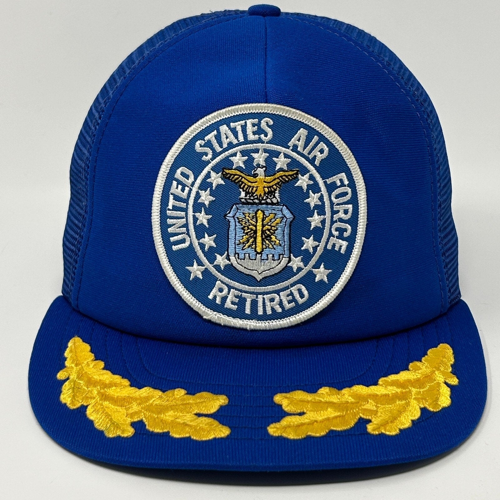 Vintage 80s United States US Air Force Retired Trucker Hat Baseball Cap USAF Military Scrambled Eggs Embellishments Gold Leaf Leaves Blue Paramount P Brand Mesh Foam Front Snapback Five Panel A-Frame Made In USA
