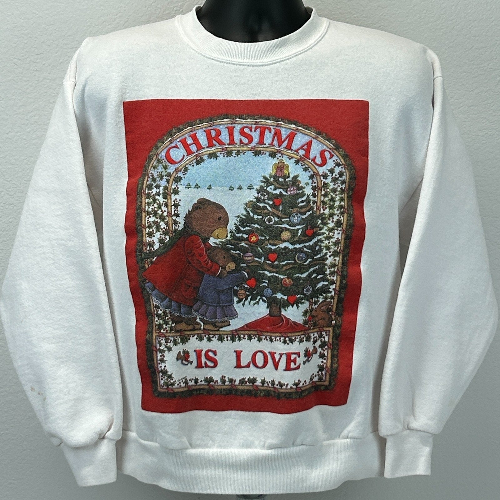 Vintage 90s Christmas Is Love Sweatshirt Laura Trayser Designs Bears Holiday Ugly Cute Christmas Sweater Crewneck Jerzees Made In USA White Unisex M Medium