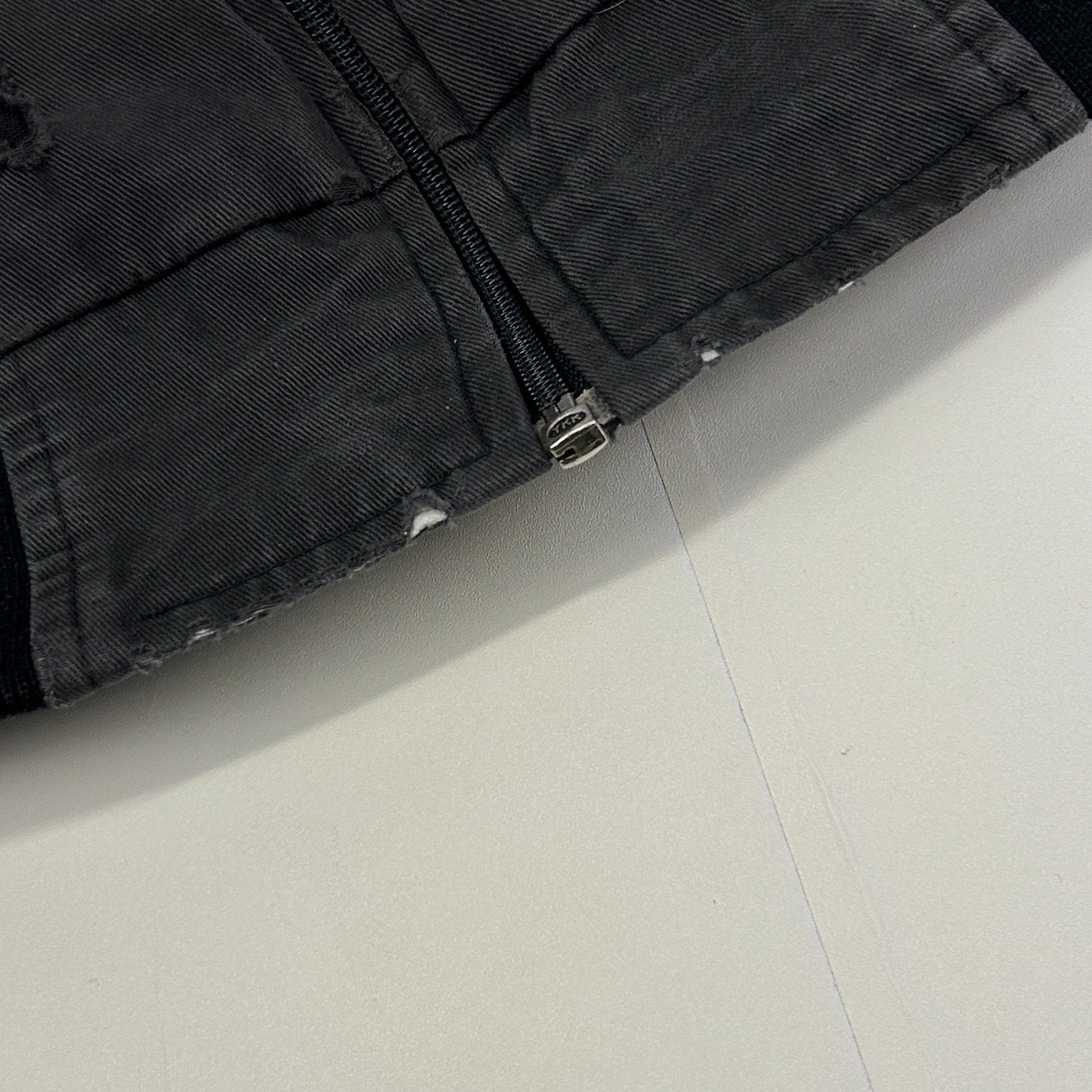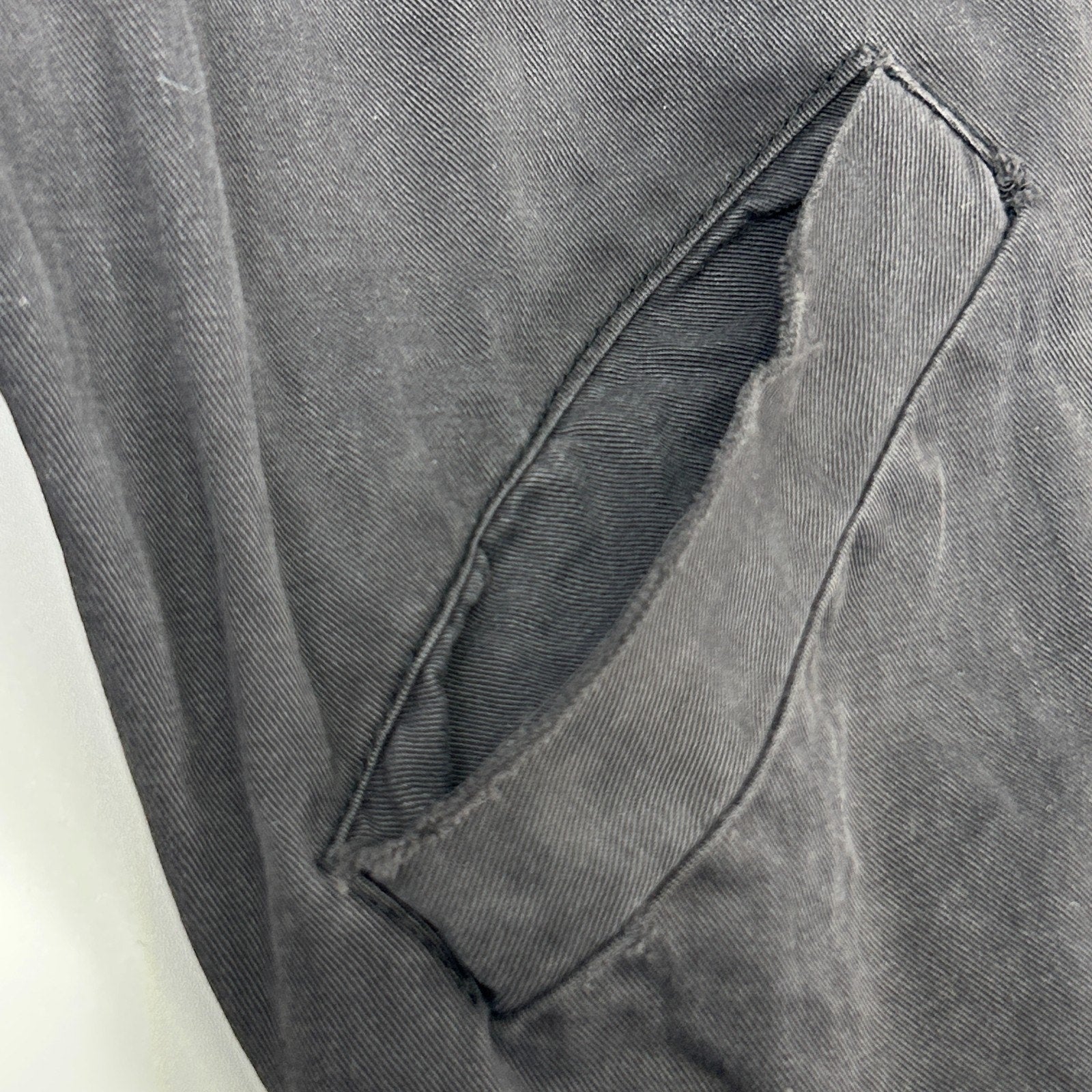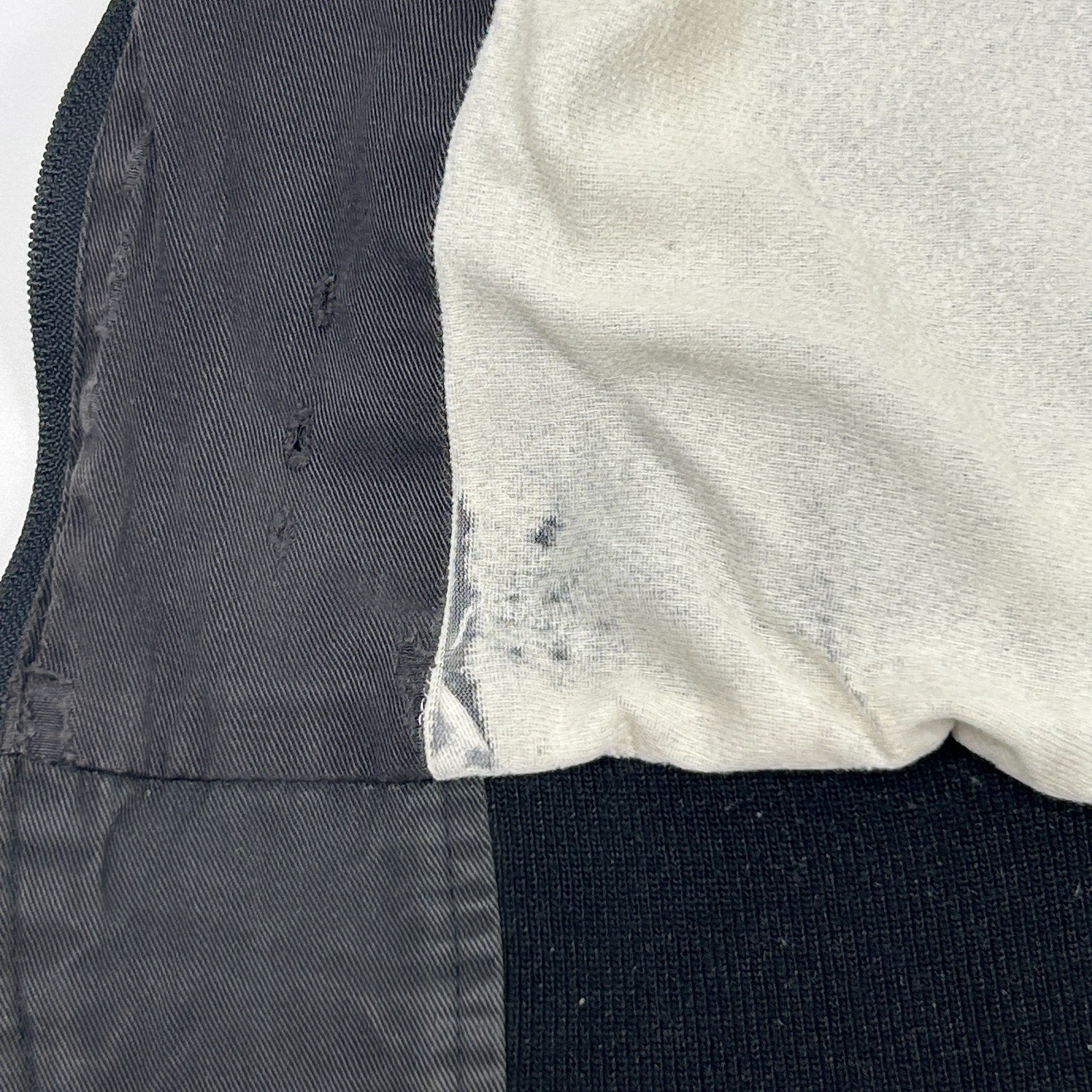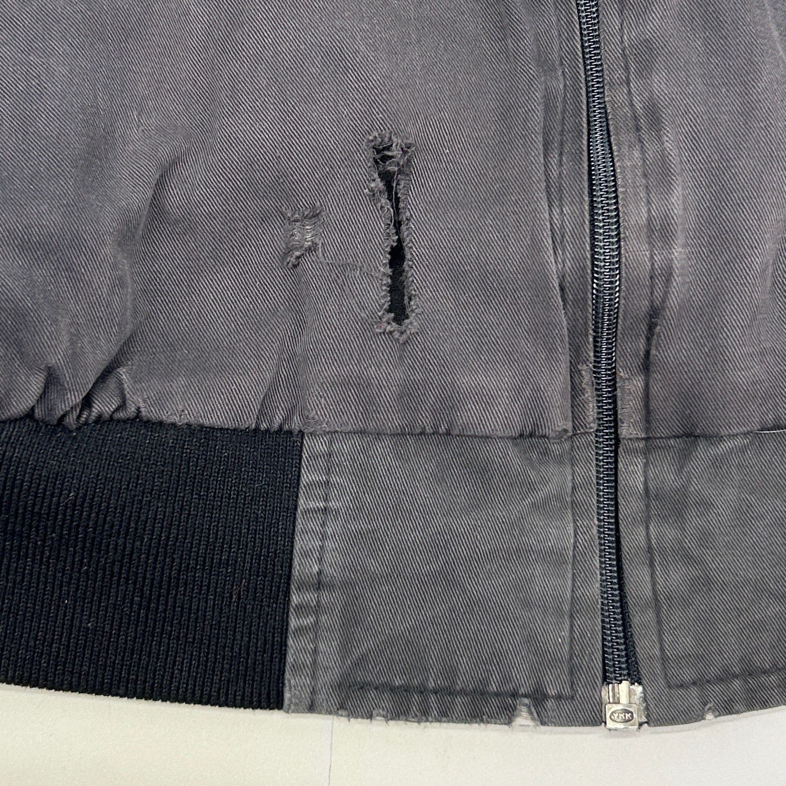 Has holes, fading, rips on the cuffs were repaired. No other flaws noticed. See photos.