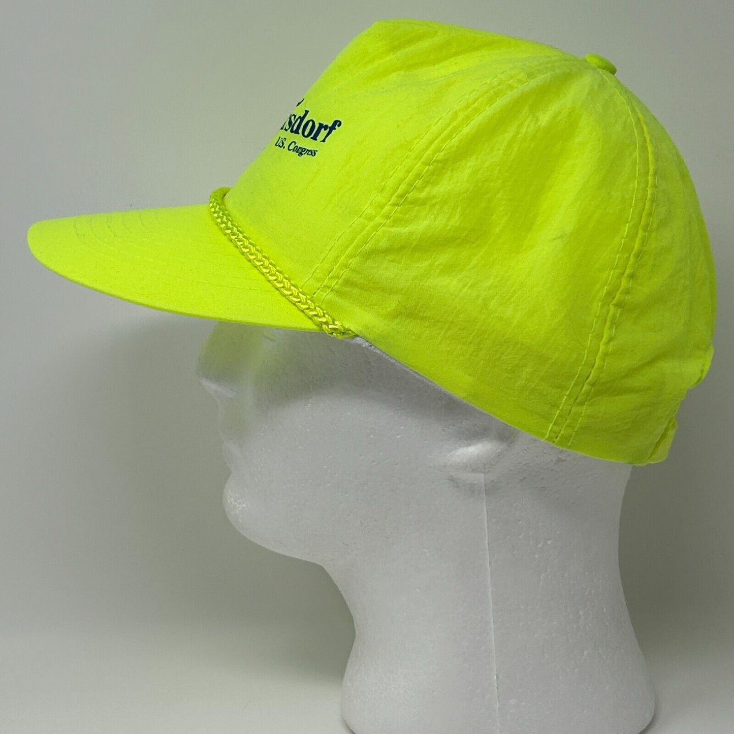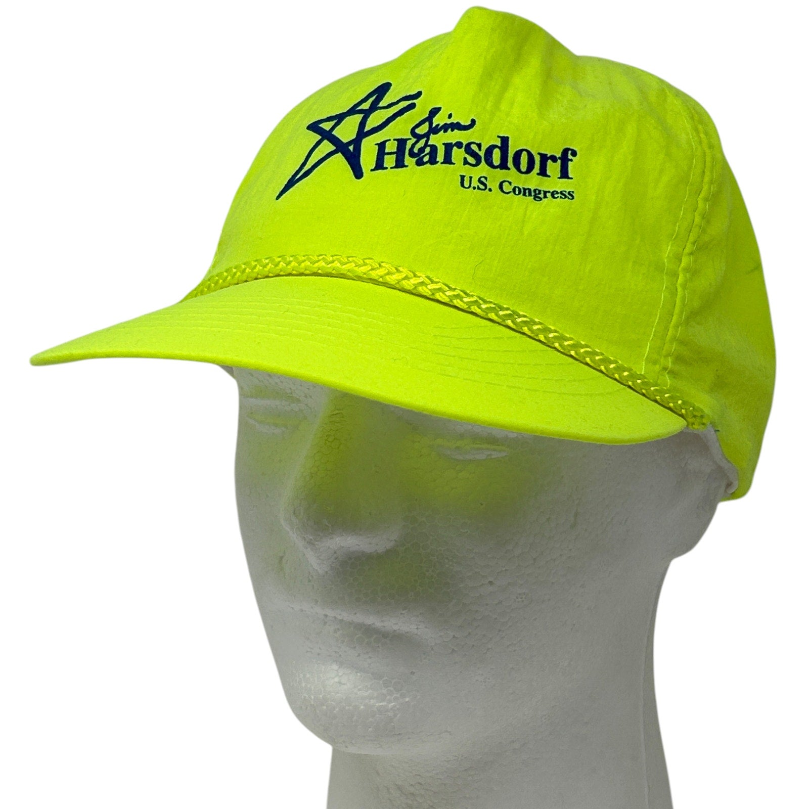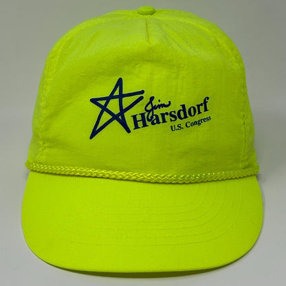 Vintage 90s Jim Harsdorf US Congress Hat Baseball Cap Republican Party Politics Political Election Wisconsin Rope Cord Roping Corded Neon Fluorescent Yellow Otto 5 Panel A-Frame Strapback