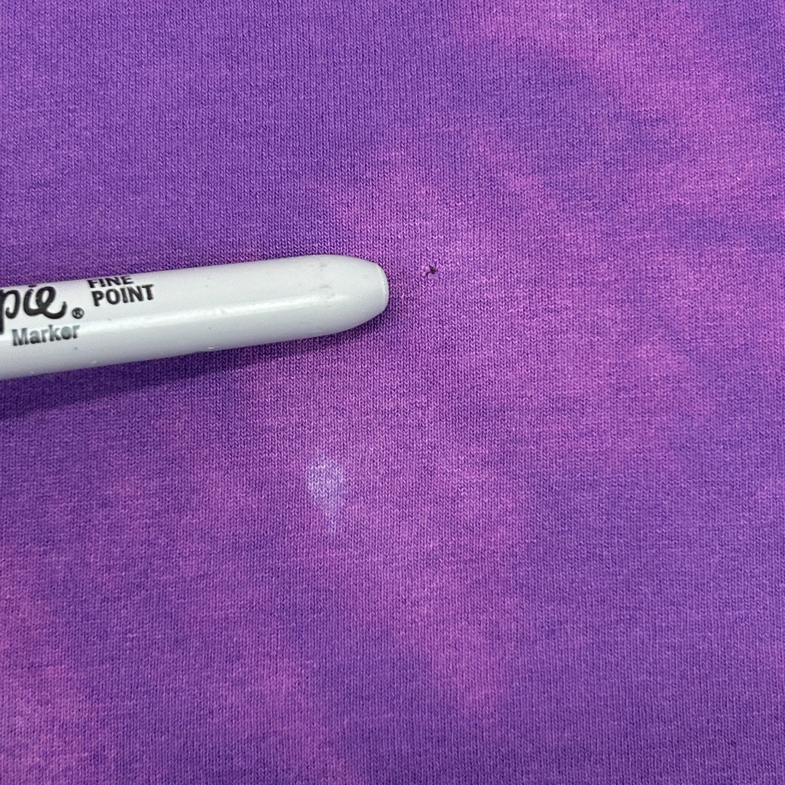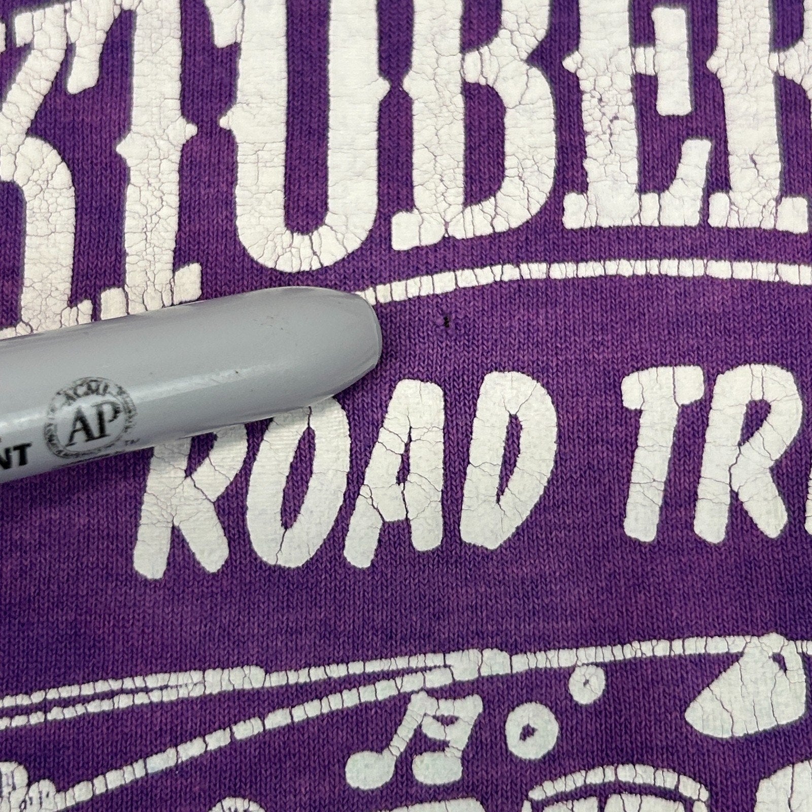 Has spots, image cracking, a small hole on the bottom back, and three tiny pinholes have been patched from the inside. The holes should not spread further and skin will not show through. No other flaws noticed. See photos for details.