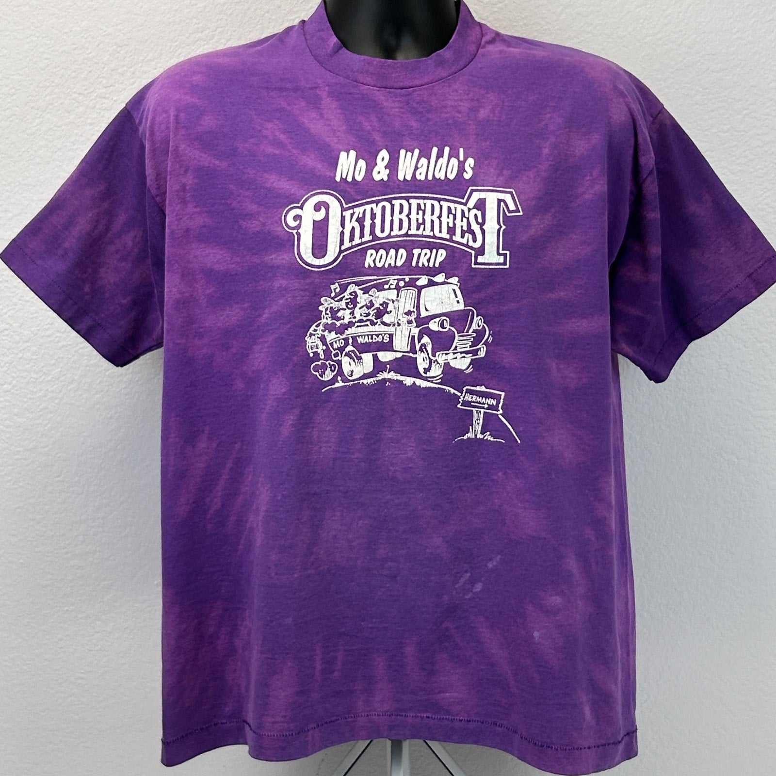 Vintage 90s Mo & Waldos Oktoberfest Road Trip T Shirt Hermann Missouri Beer XL X-Large Purple Tie Dye Fruit of the Loom Single Stitch Made In USA Graphic Tee