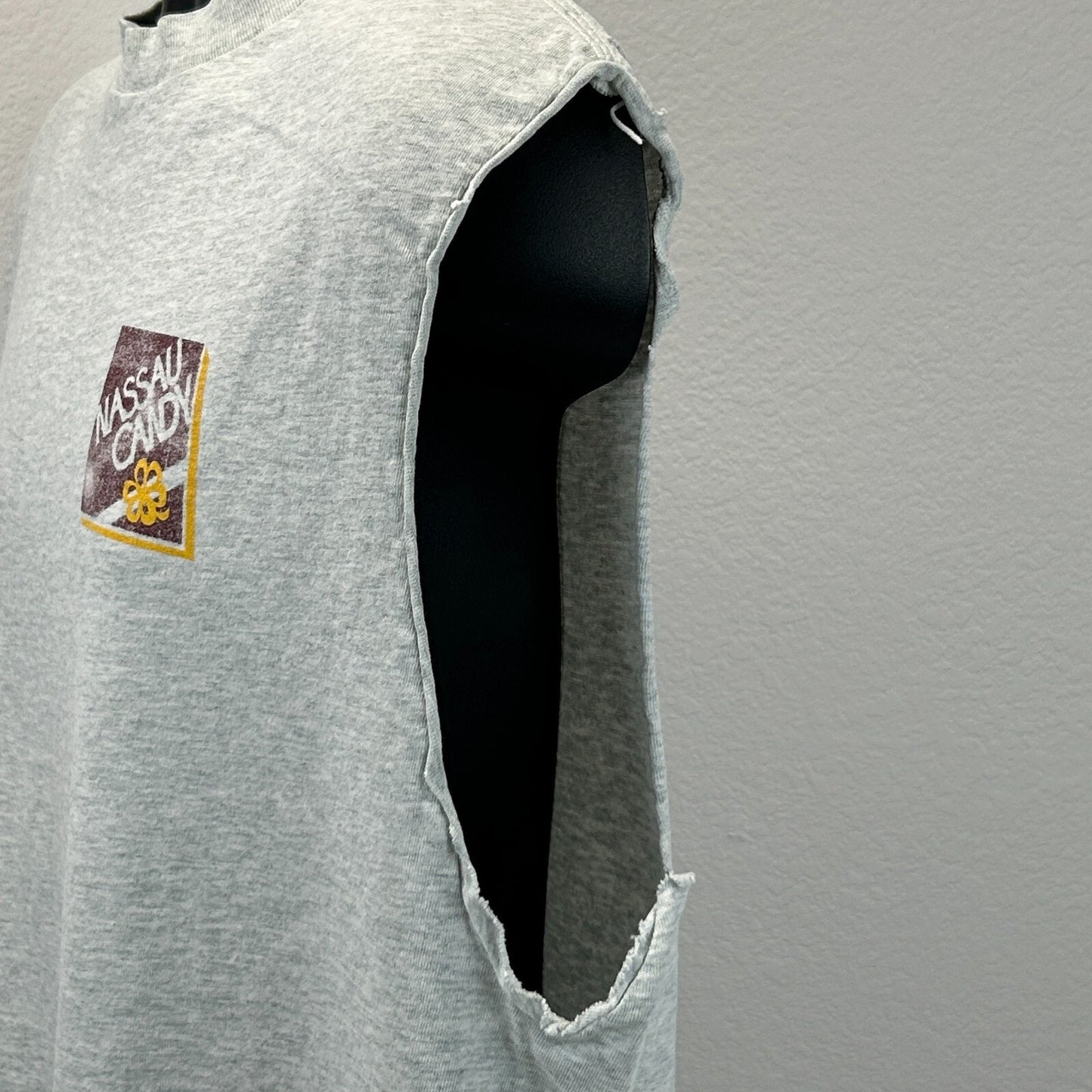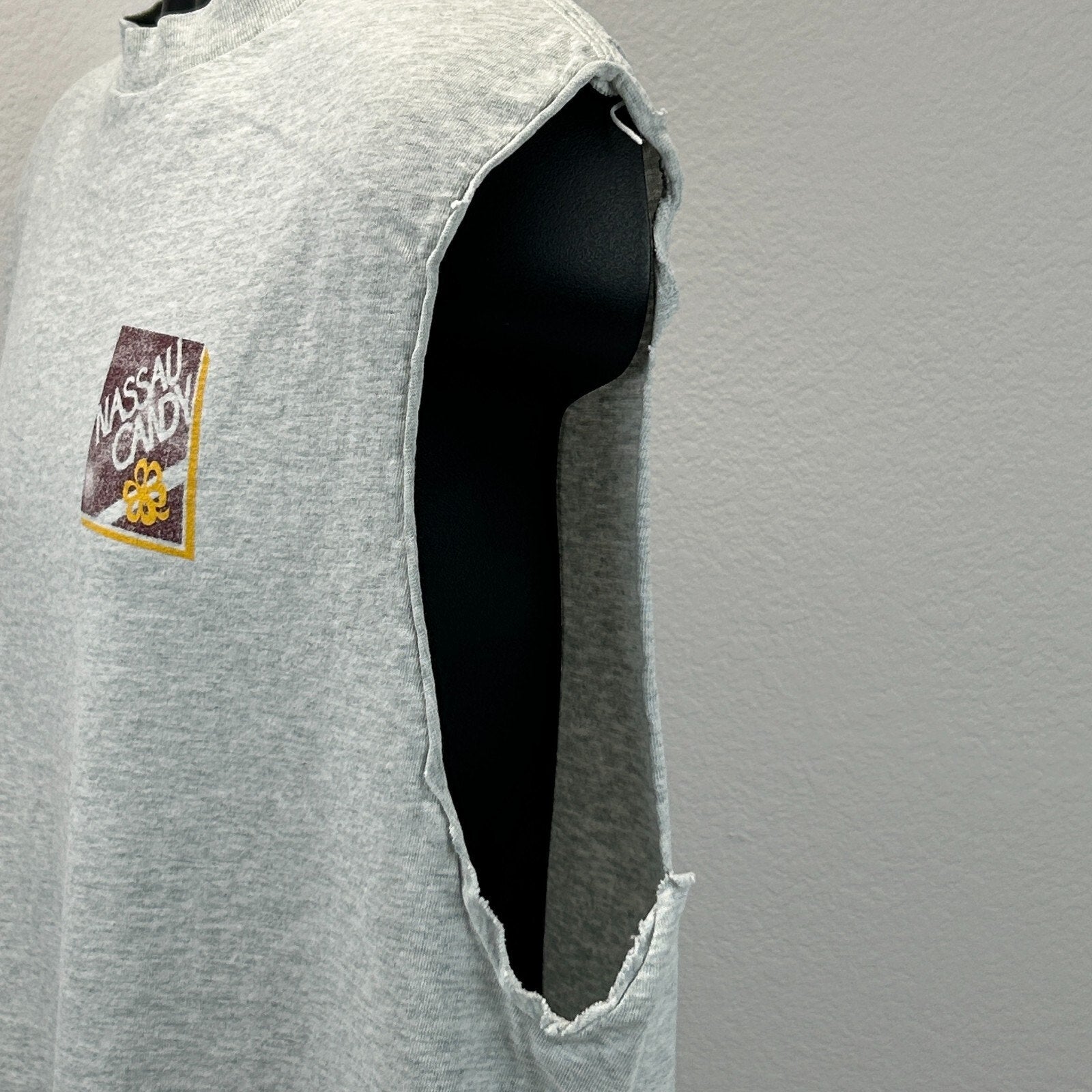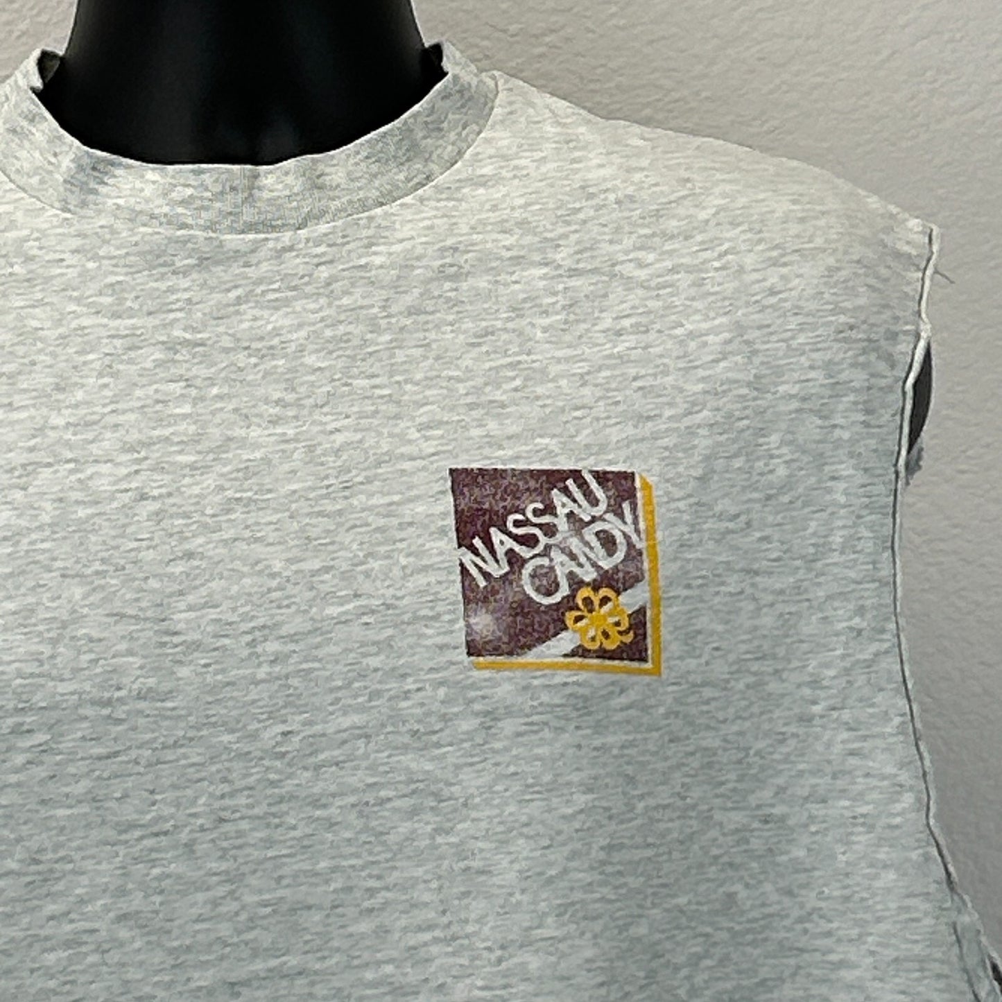 Vintage 90s Nassau Candy Team Player T Shirt Mens XL X-Large Gray Employee Staff Fruit of the Loom Sleeveless Graphic Tee