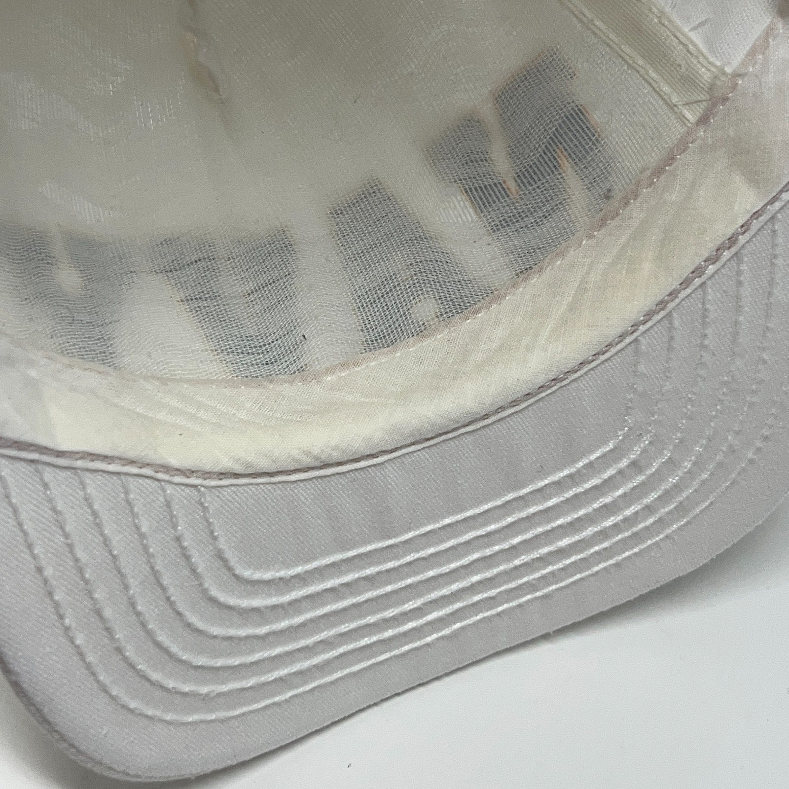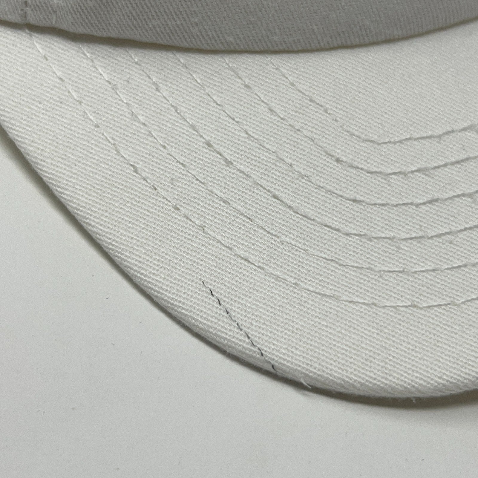 Has wrinkling on the top, light staining on the sweatband, and a dark line on the bill. No other flaws noticed. Has been cleaned and sanitized. See photos.